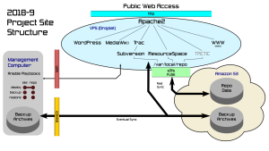 Today I’ve been testing deployment of our site onto a Digital Ocean “droplet” VPS and using Amazon “S3” storage for backups and repository data. This is a diagram of where I’m heading with this, although it’s not quite all working yet: