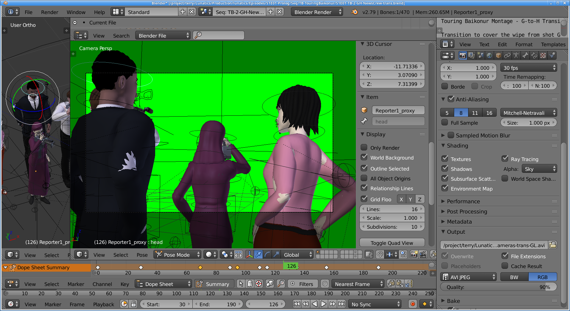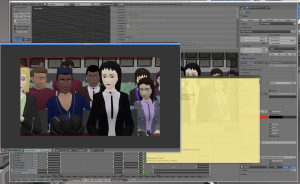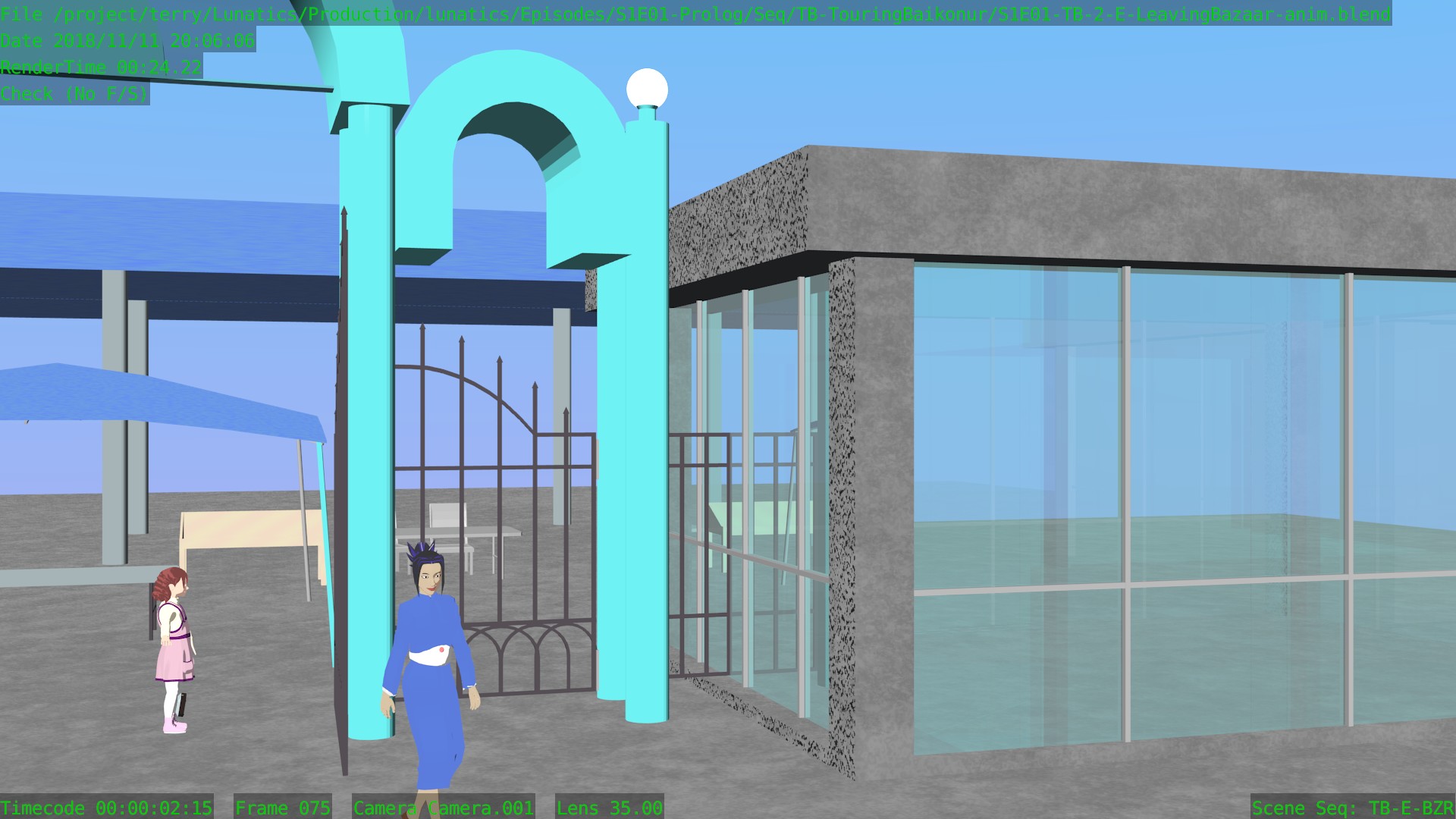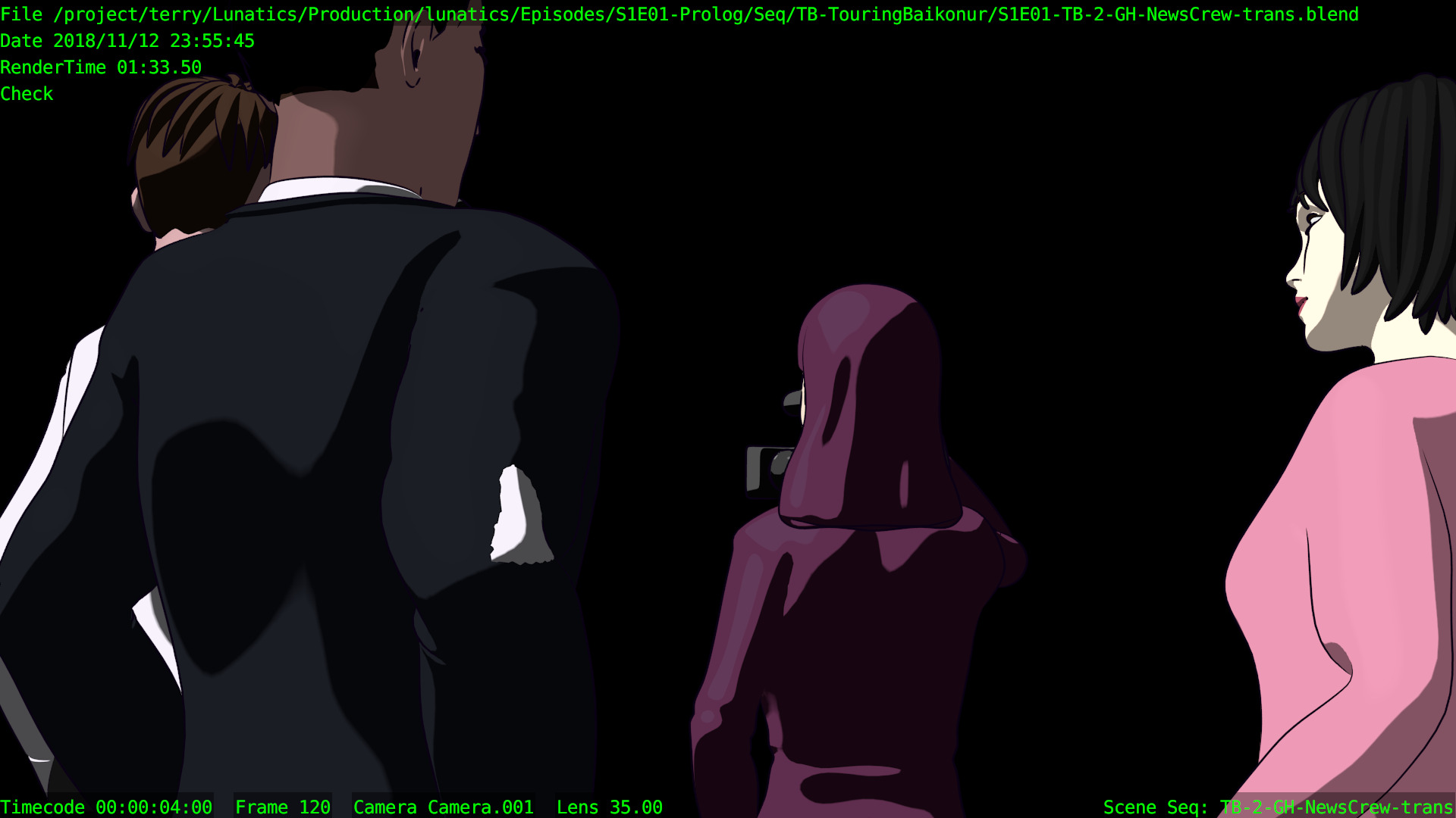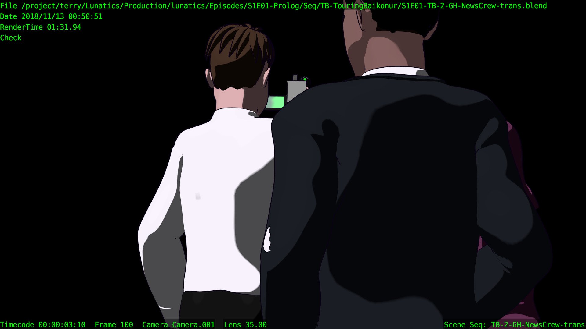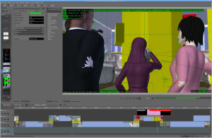As with most GL renders, this has loads of artifacts and markers rendered (some of which are useful to me). But these renders are great for getting animation and timing correct. For this purpose, I don’t care that the compositing leaves green lines around the characters. And it’s very quick — I can now work with the viewport renders which take just seconds or minutes to render (they’re not quite real-time on my workstation, but there’s not a lot of waiting). That means it’s easy to go through the cycle of making changes and then seeing how they look in motion — a critical thing for animation quality.