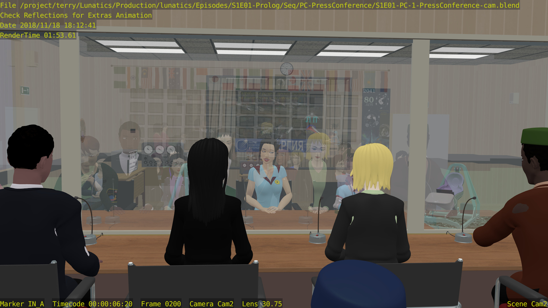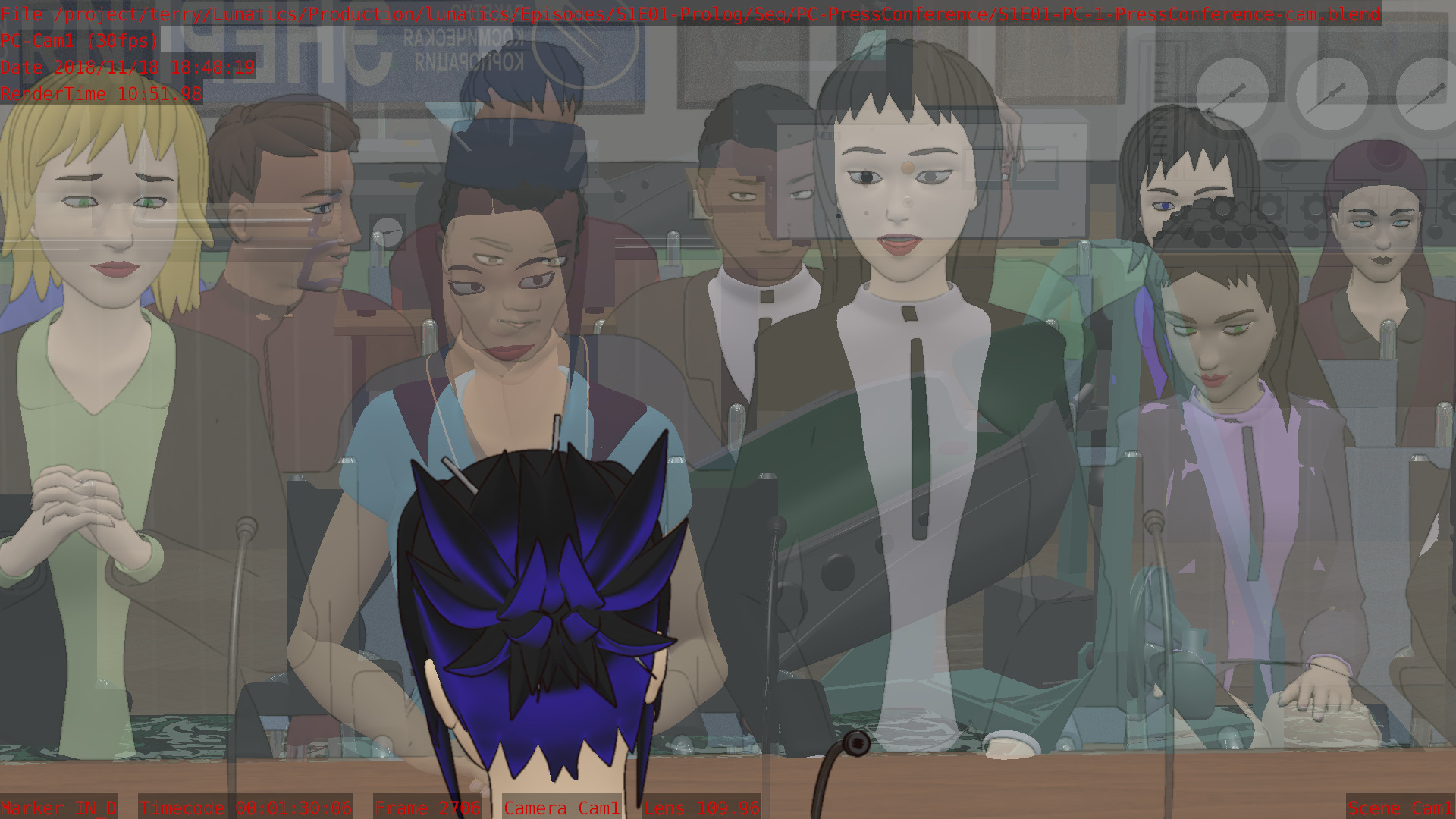 The 3-minute PRE-VIZ render on this “Press Conference” sequence takes about 12 HOURS PER CAMERA to render using the viewport GL rendering feature in Blender. With 4 cameras, that’s 48 hours, or about two days of rendering.You understand, that’s not a final render. That’s the “quick” “GL blast” render for previz. This is usually close to realtime for most shots.