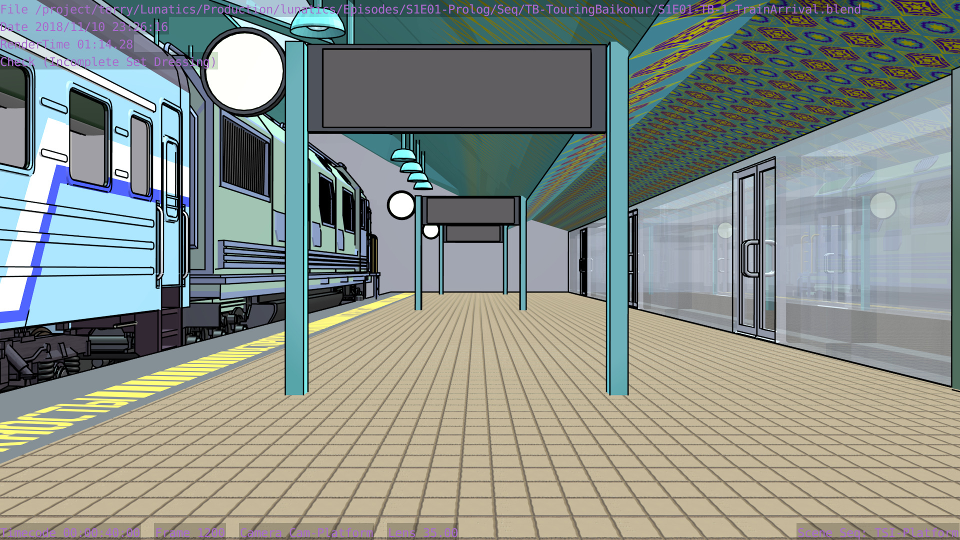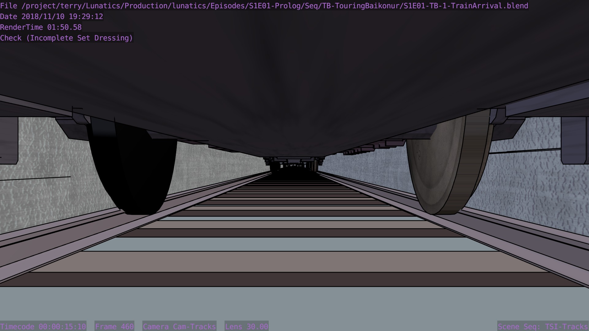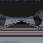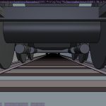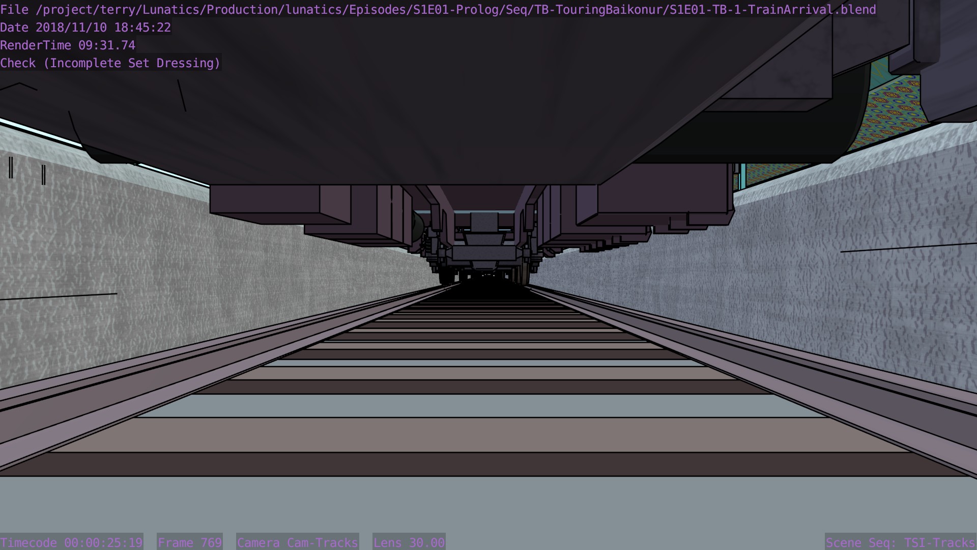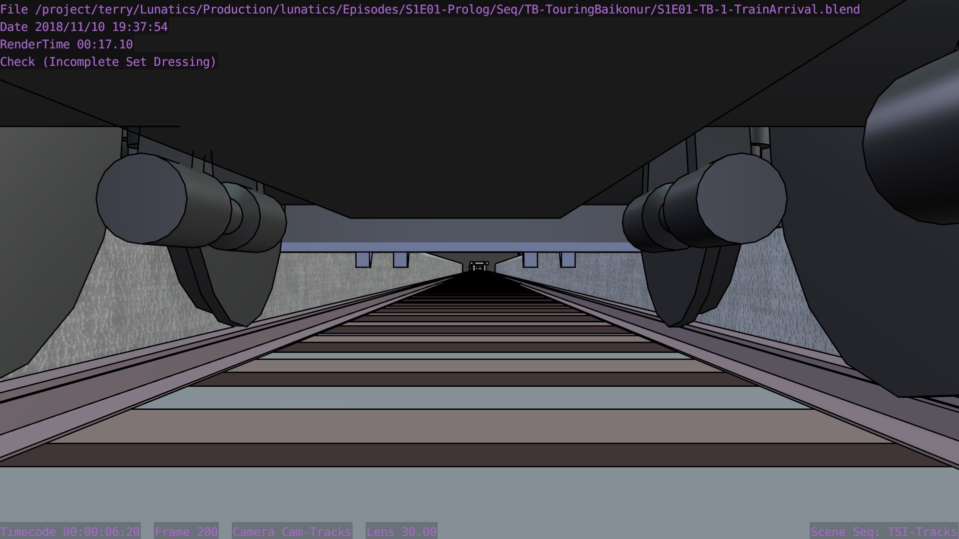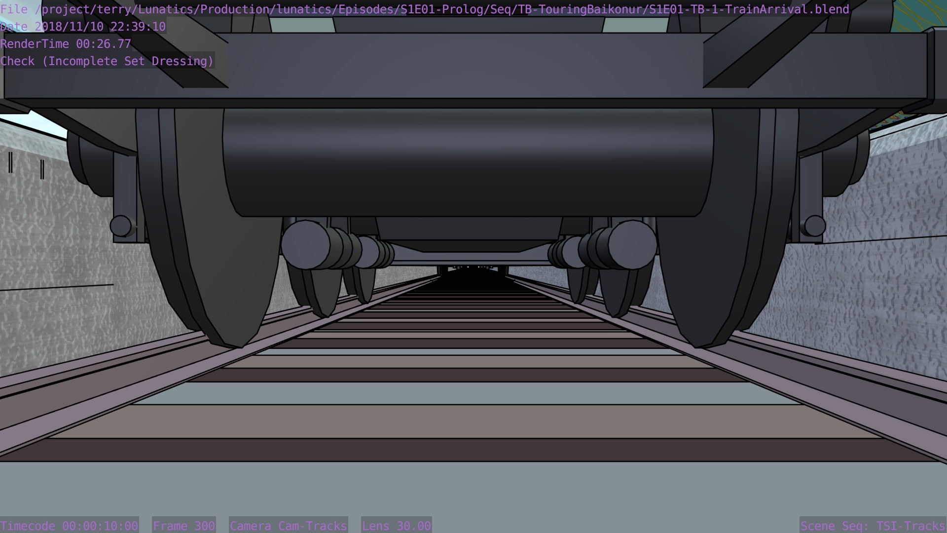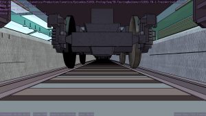 I’m not sure what the correct jargon word for these is, but I’m calling them “check” renders. Basically, this is a still frame of the animation with all the bells and whistles turned on (and the marker stamp layer for reference) — to see whether the visual quality is adequate, what the render time is per frame, and other details. I was thinking this shot would require more detailing to be added to the undercarriage of the train. But actually, I’m pretty happy with it like it is.
