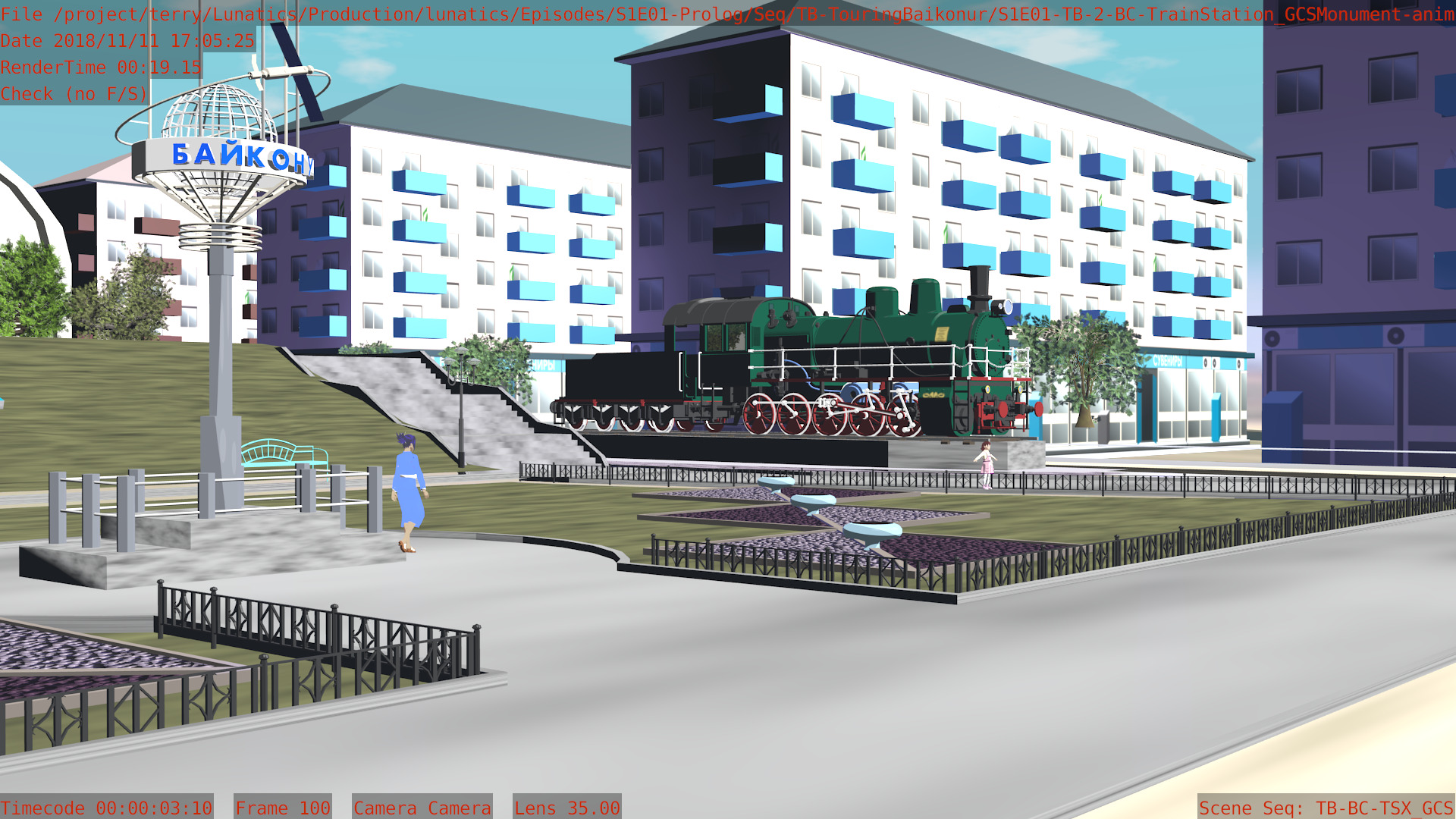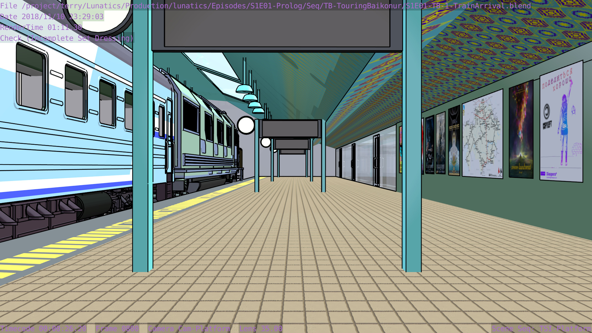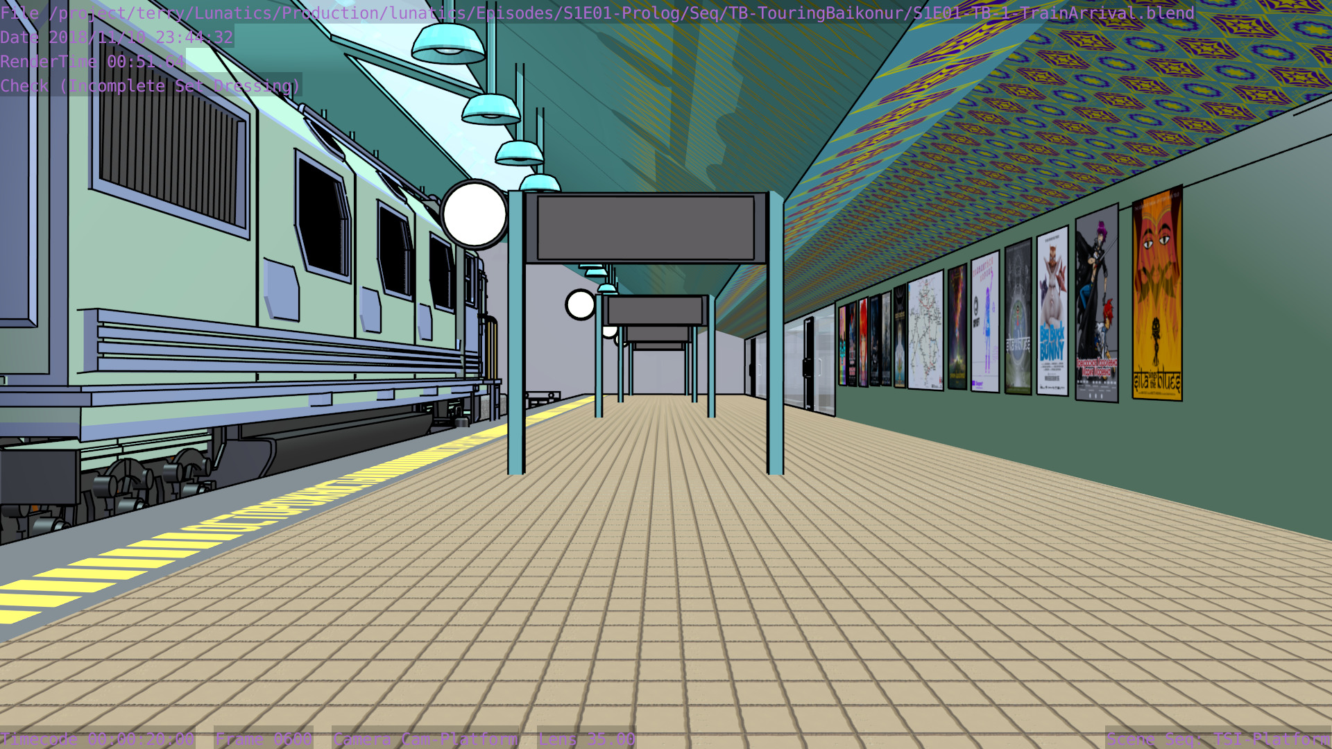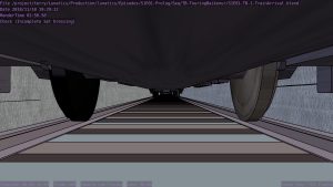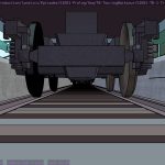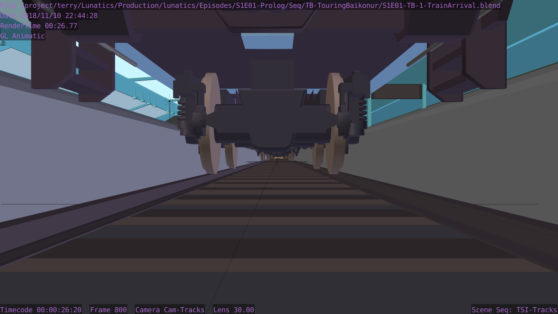 I’m not sure what the correct jargon word for these is, but I’m calling them “check” renders. Basically, this is a still frame of the animation with all the bells and whistles turned on (and the marker stamp layer for reference) — to see whether the visual quality is adequate, what the render time is per frame, and other details. I was thinking this shot would require more detailing to be added to the undercarriage of the train. But actually, I’m pretty happy with it like it is.