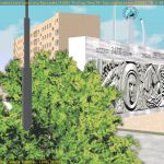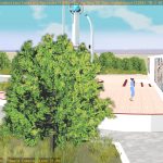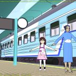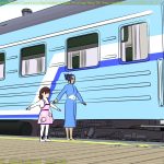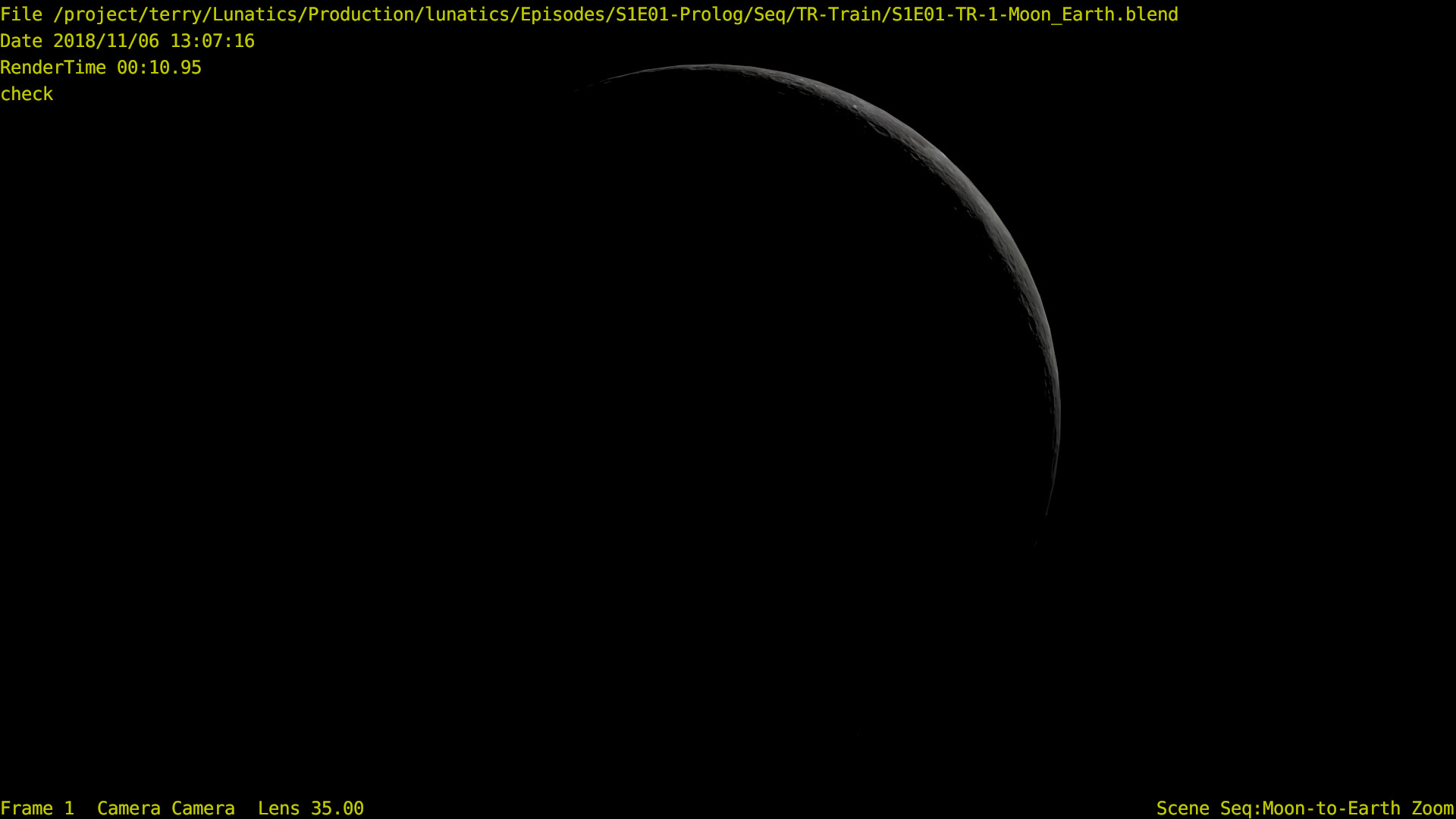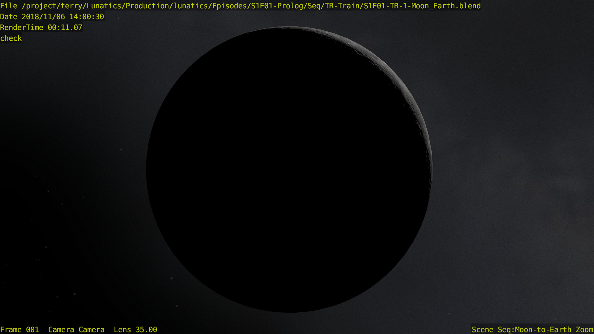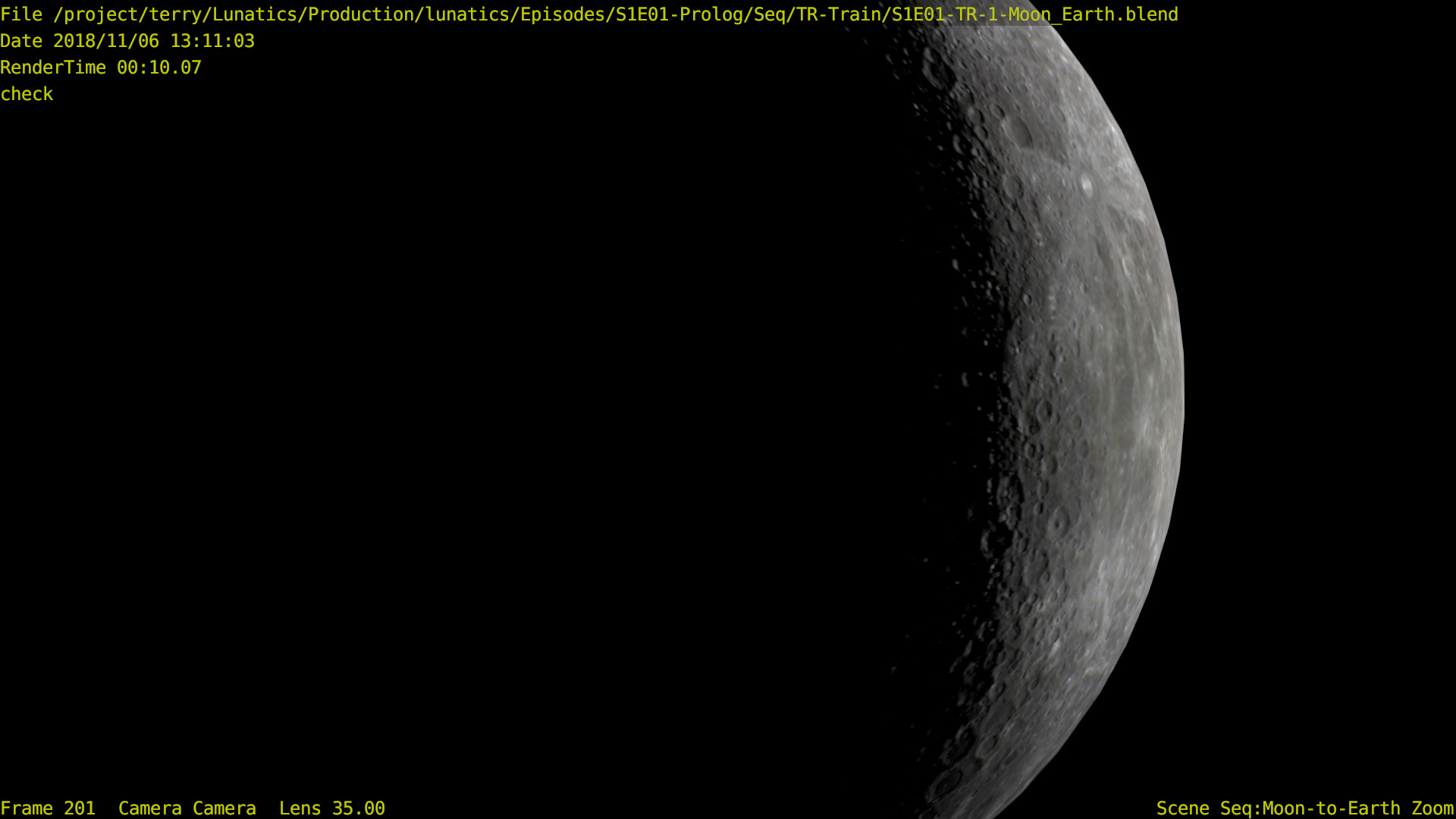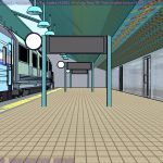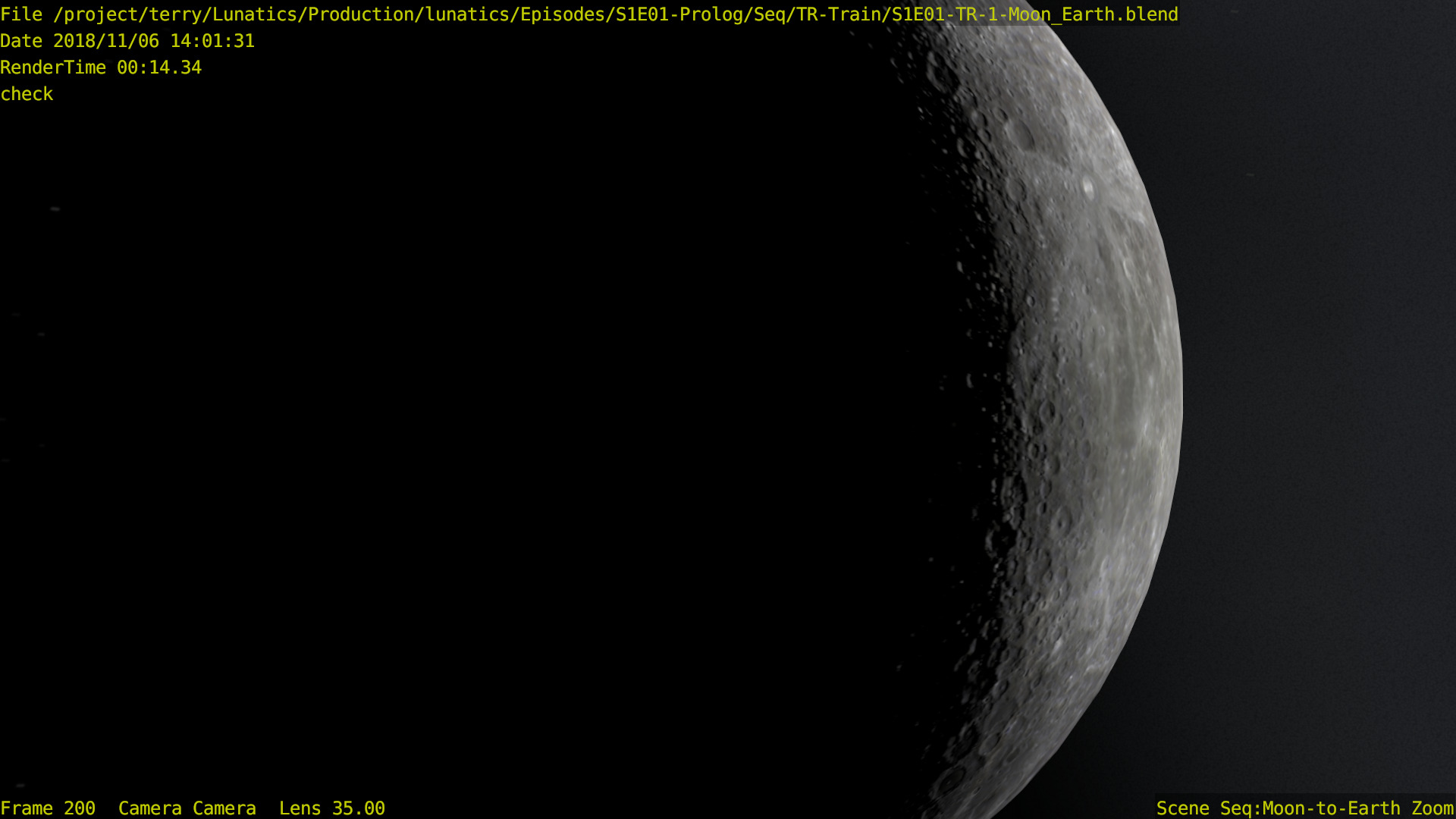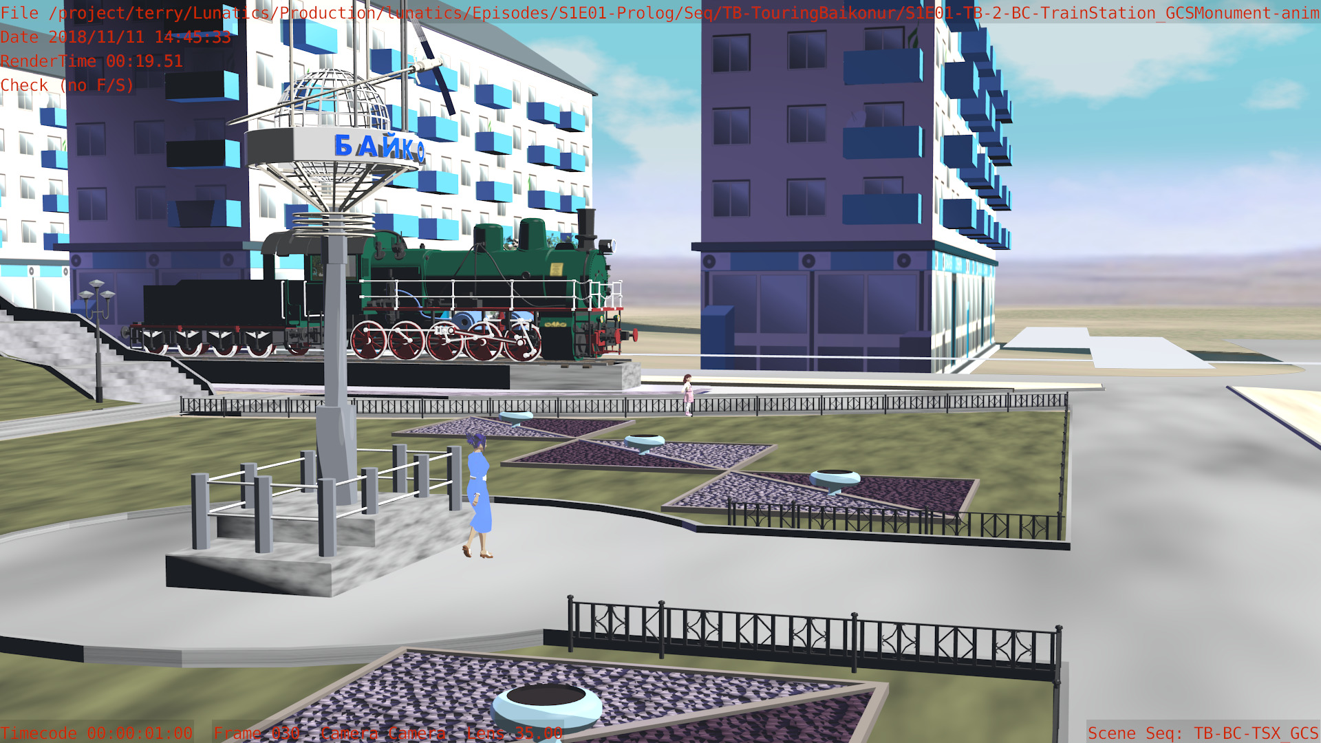 I’m not sure what the correct jargon word for these is, but I’m calling them “check” renders. Basically, this is a still frame of the animation with all the bells and whistles turned on (and the marker stamp layer for reference) — to see whether the visual quality is adequate, what the render time is per frame, and other details. I was thinking this shot would require more detailing to be added to the undercarriage of the train. But actually, I’m pretty happy with it like it is.