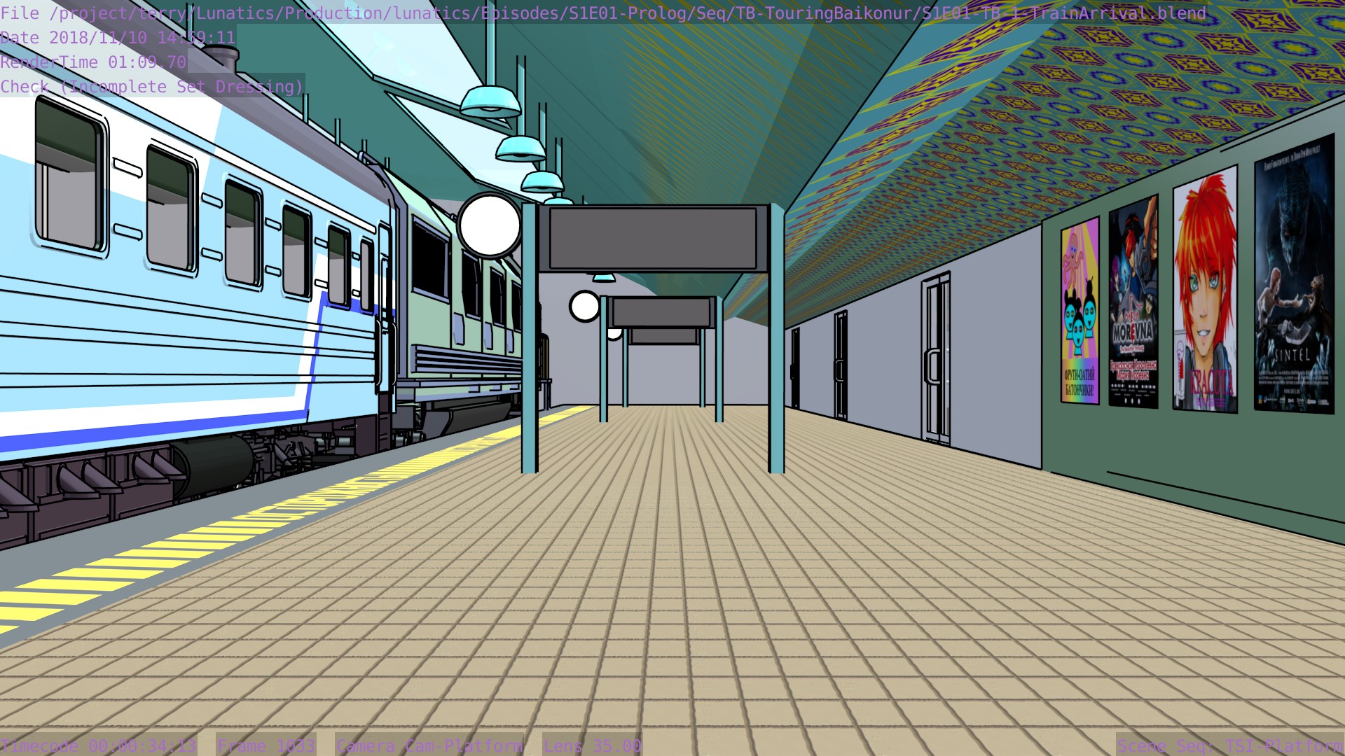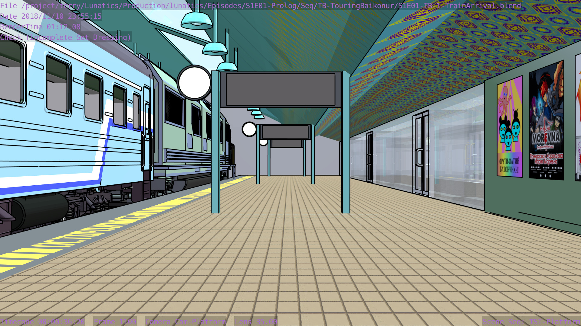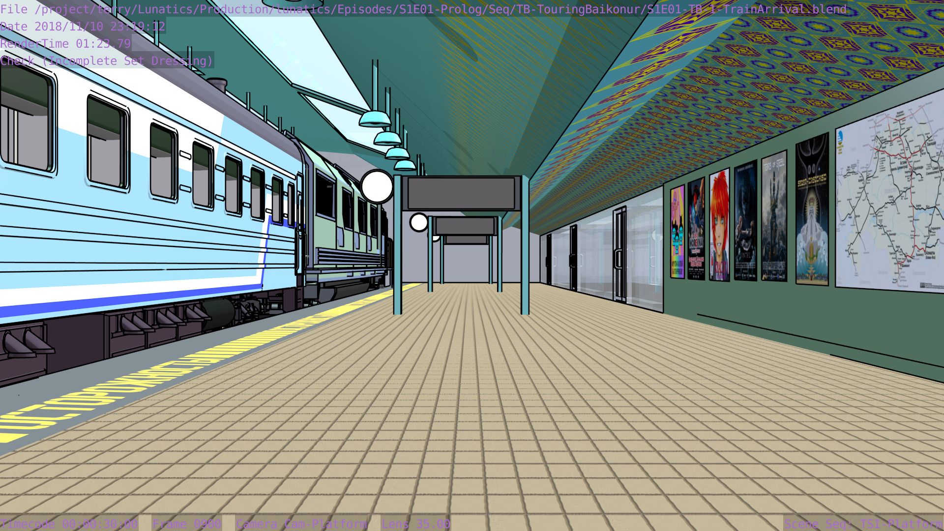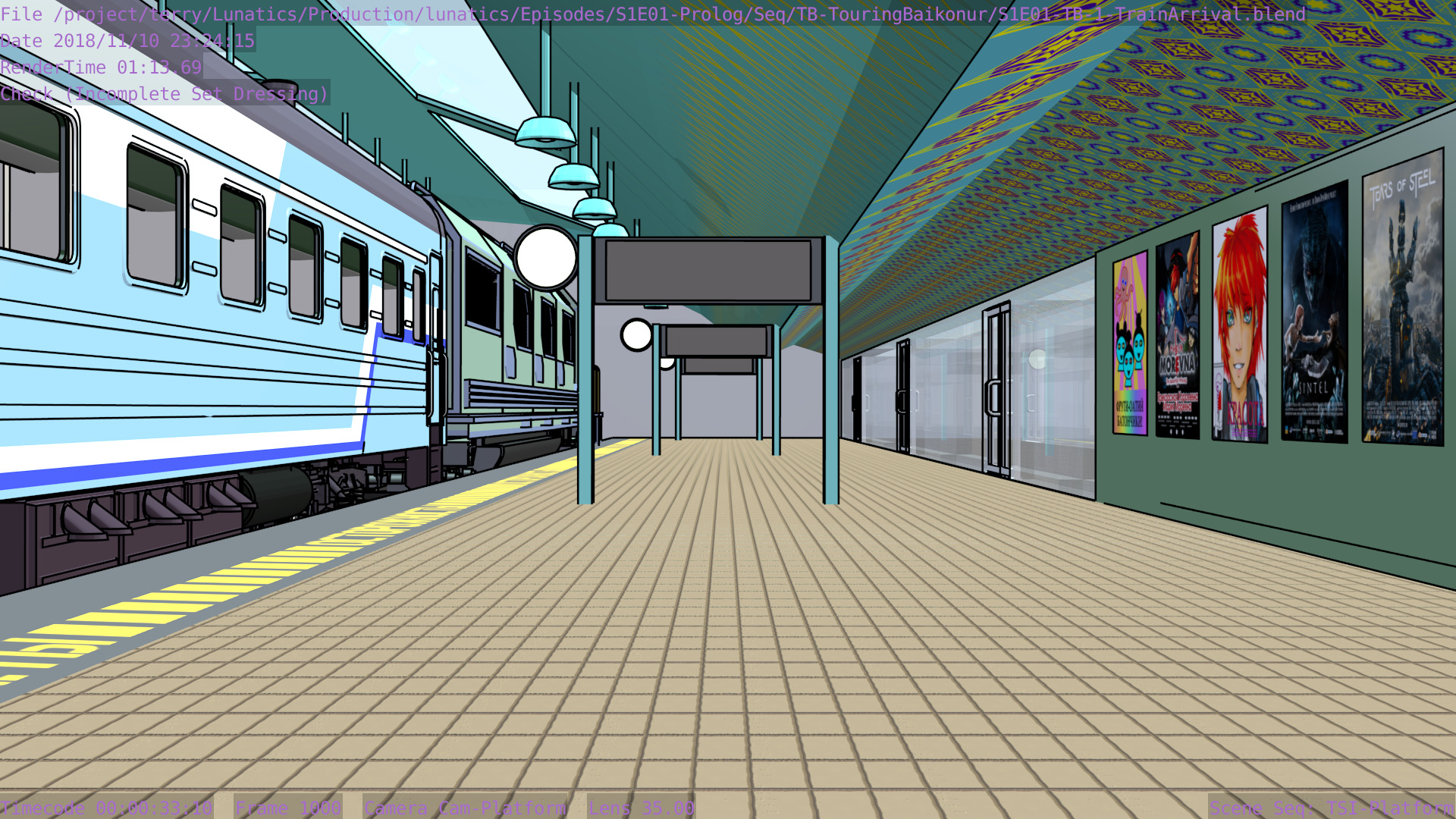 Revised toon materials and Freestyle ink lines. In train arrival shot.