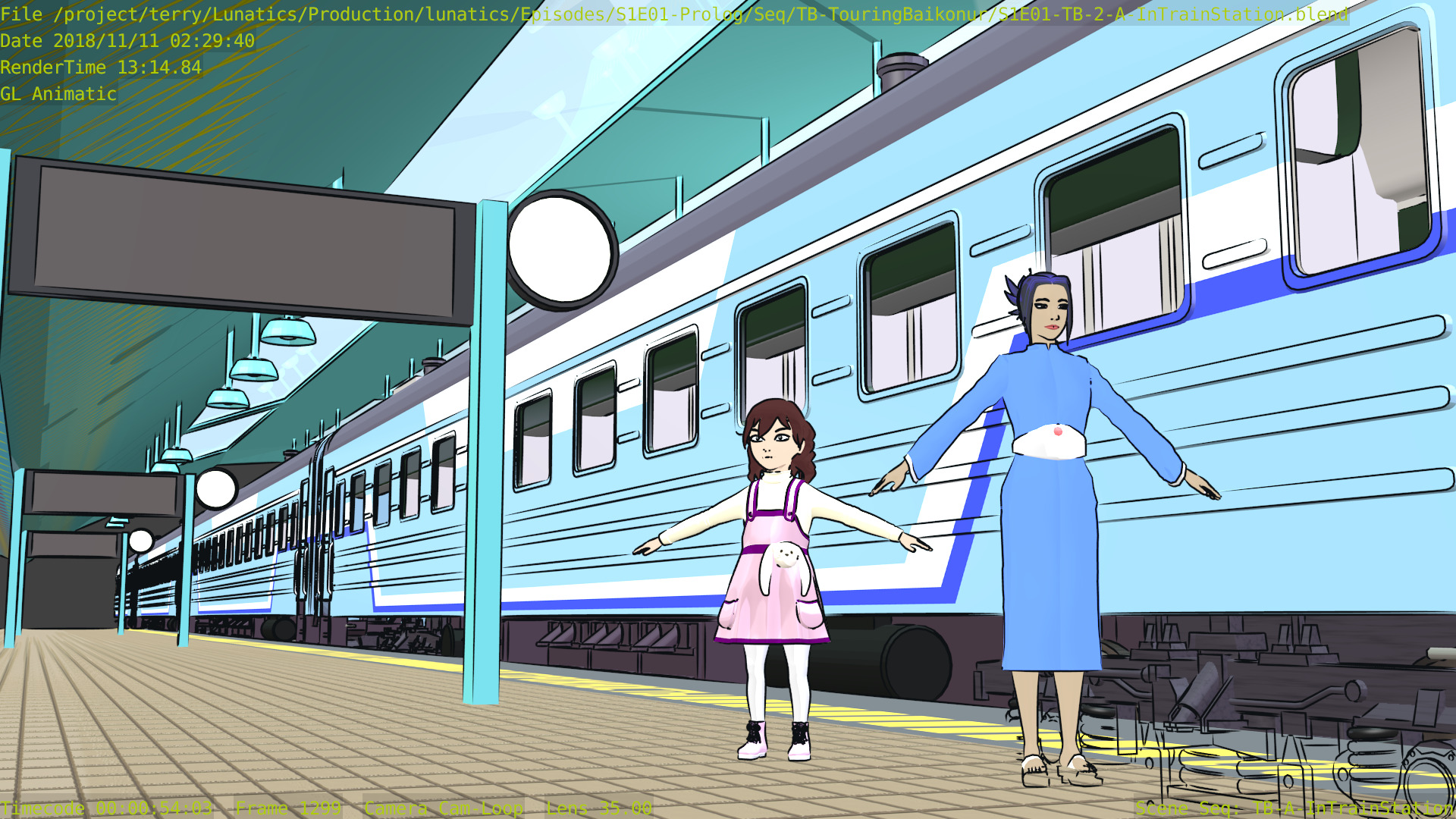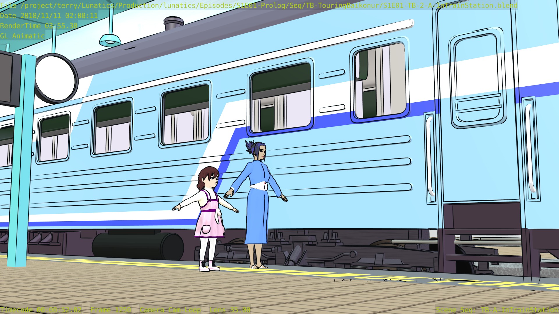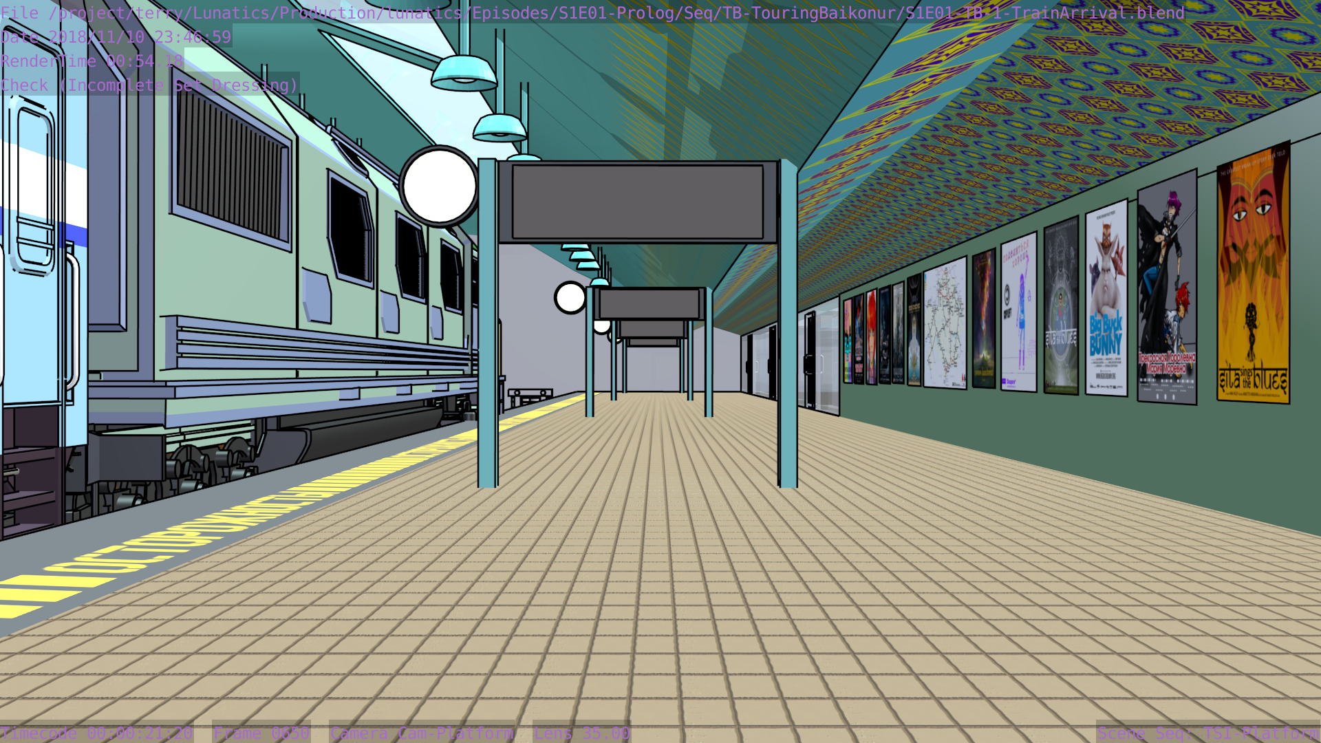 Revised toon materials and Freestyle ink lines. In train arrival shot.