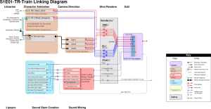 Working from right-to-left (“backwards”), this goes from the desired result (storyboard thumbnails of the shots), through new episode Blender files needed to create them, to the library files required for the sequence (down the left side of the diagram).