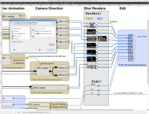 You’ll notice there are blue lines indicating the “animatic” workflow, using GL/AVI video clips rendered using “viewport” rendering in Blender. These are quick, and allow me to make editing decisions while I’m working on shots. The red lines are the final renders, using Blender Internal renderer, which will be used to make the final episode.