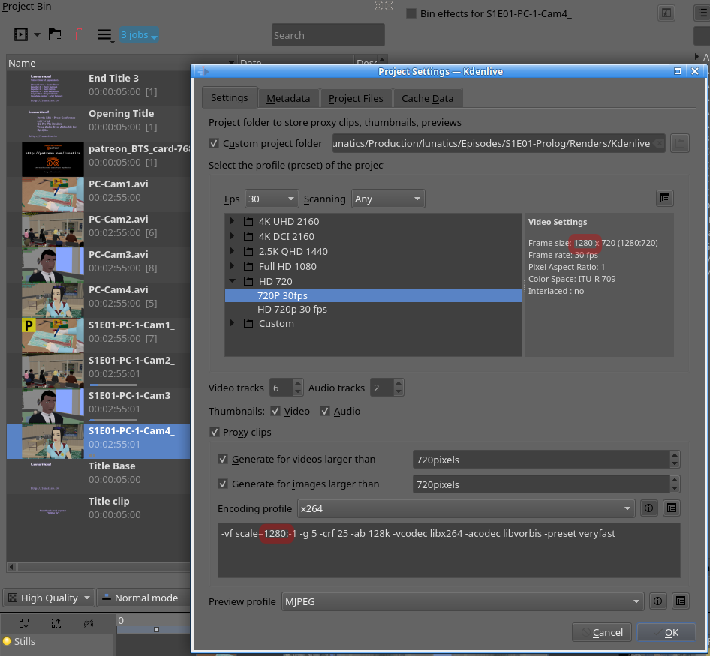 GOTCHA – Settings: This is what held me up for a couple of days. The project profile for this workflow should be the PROXY size, not the full size of the video. In my example, I’m using 1280×720 for editing, but the final video will be 1920×1080. You could use an even lower resolution on a slower computer. The advantage of proxies is not just in the size, though, but also the codec used. You’ll notice this project is set to use the ‘x264’ codec (a.k.a. ‘mp4’) for proxies. It’s a common format used for web video, that you may recognize.