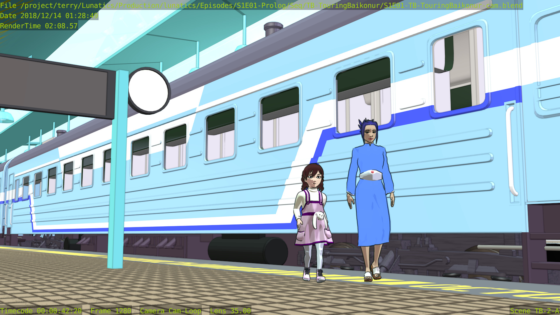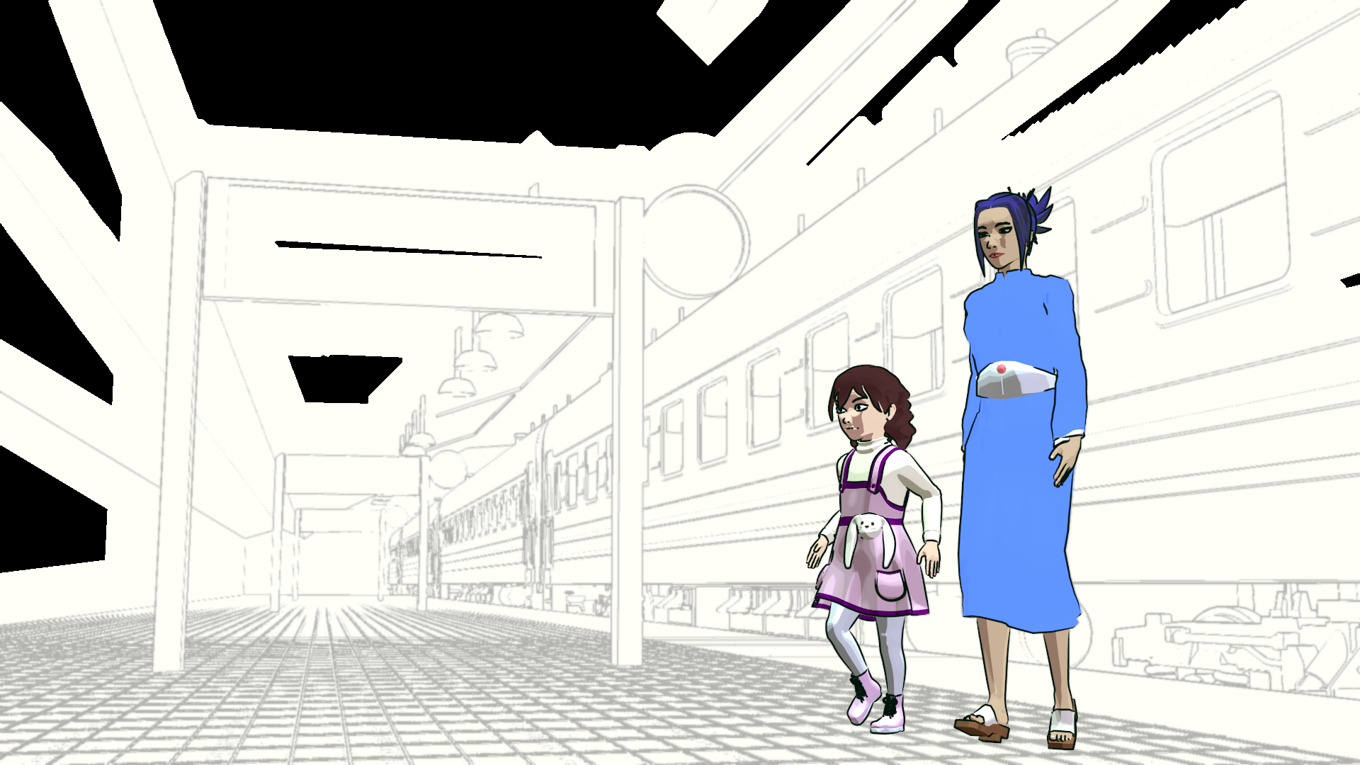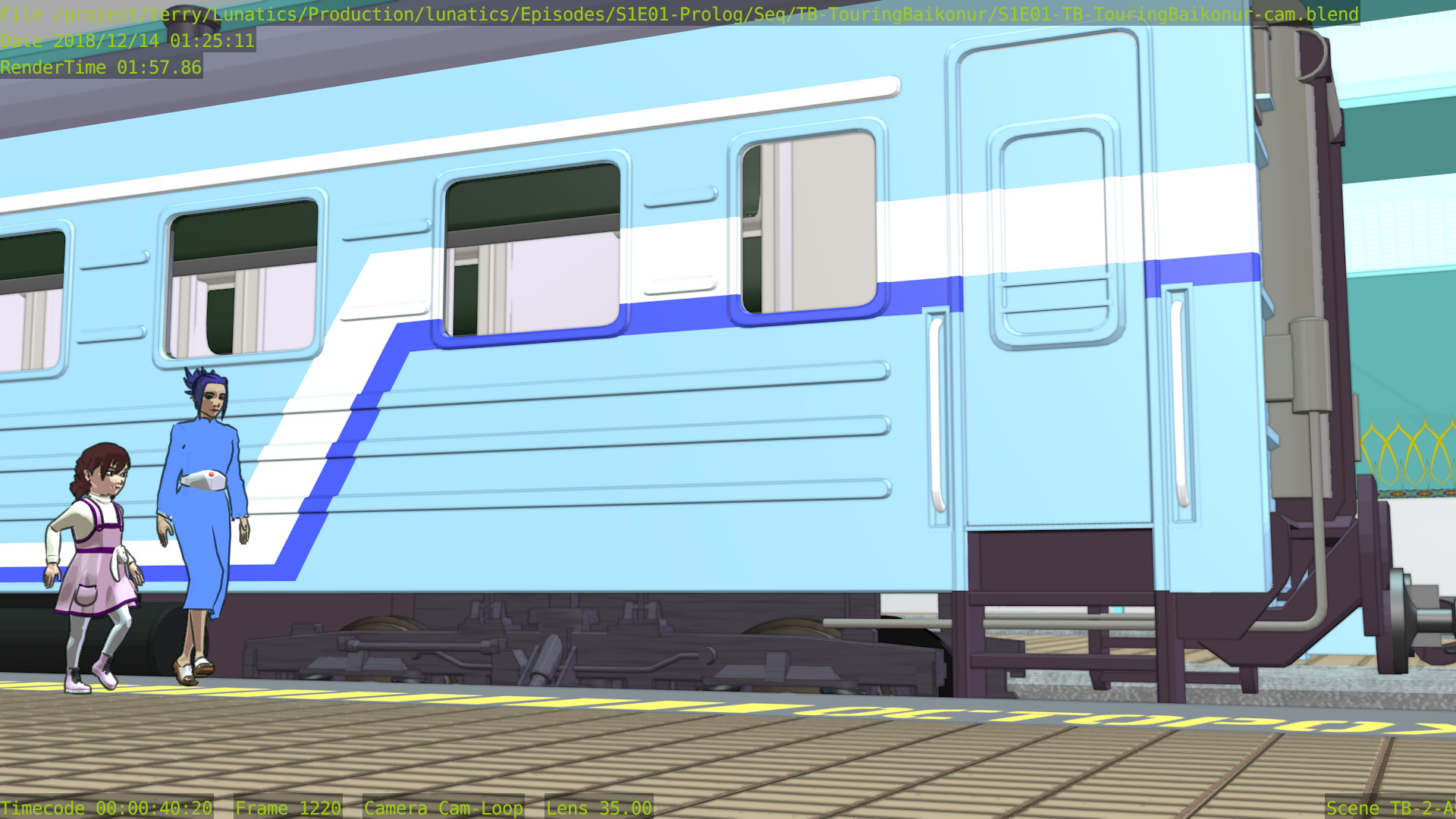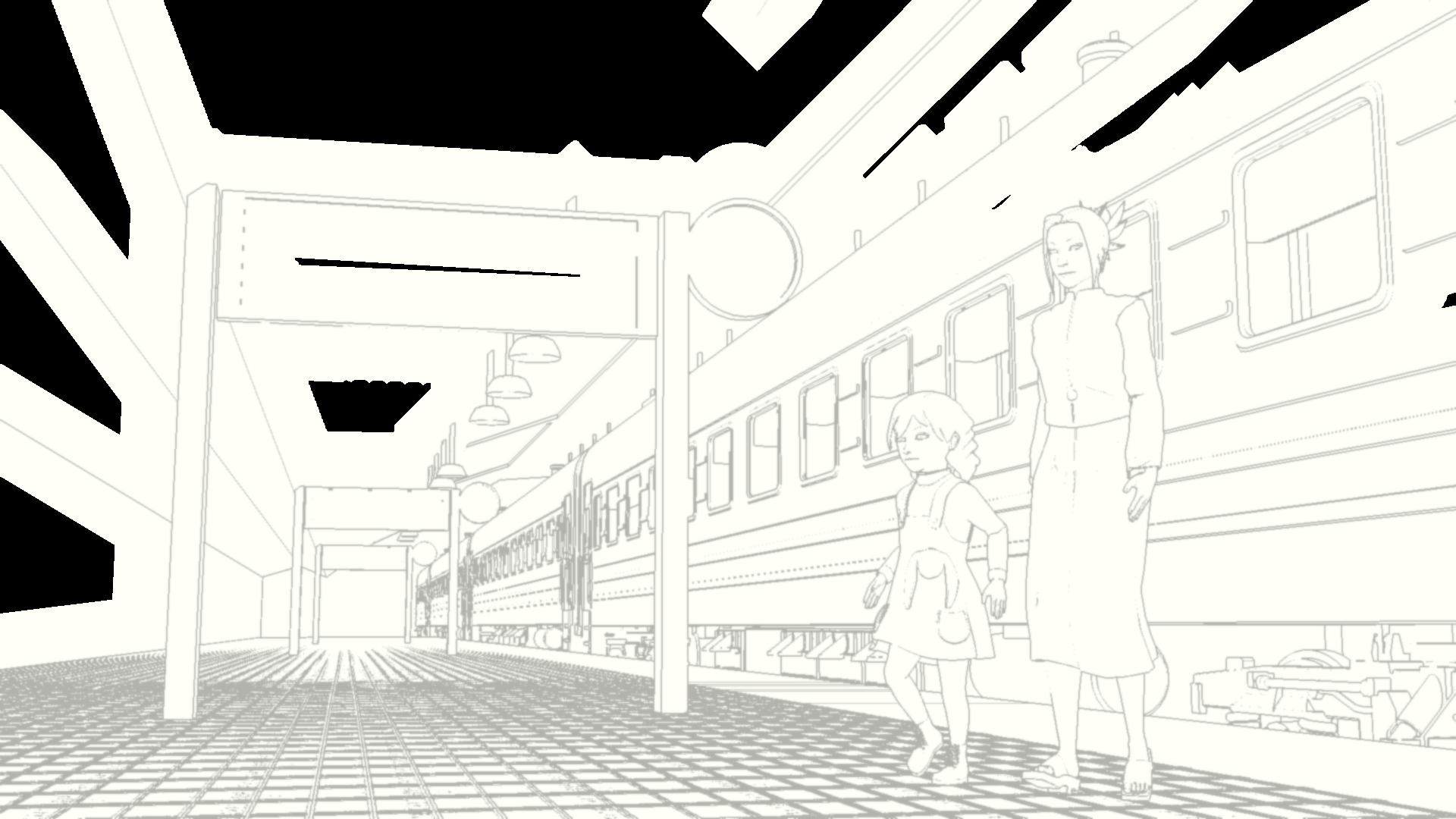 This shot is also missing a skyline backdrop in the far background, the extras (other people on the platform), and some additional set dressing.