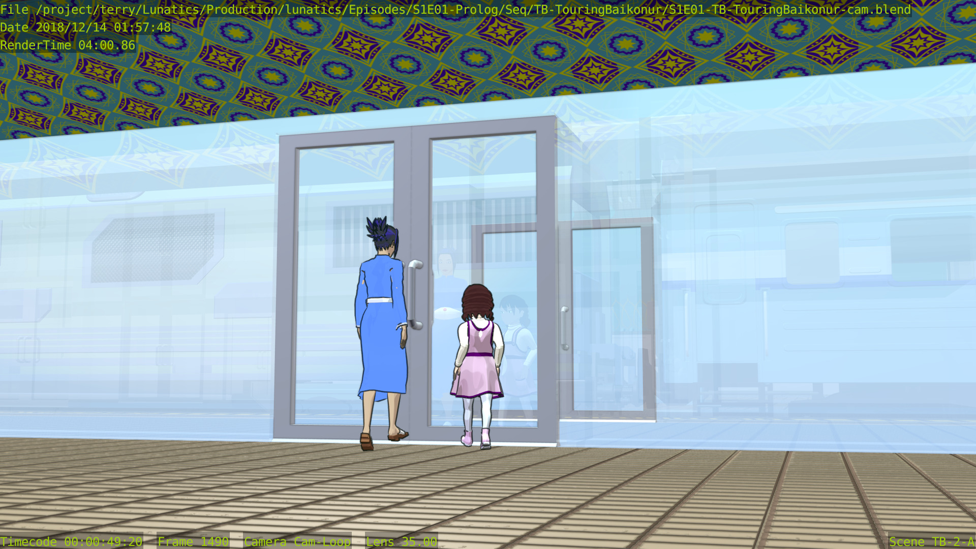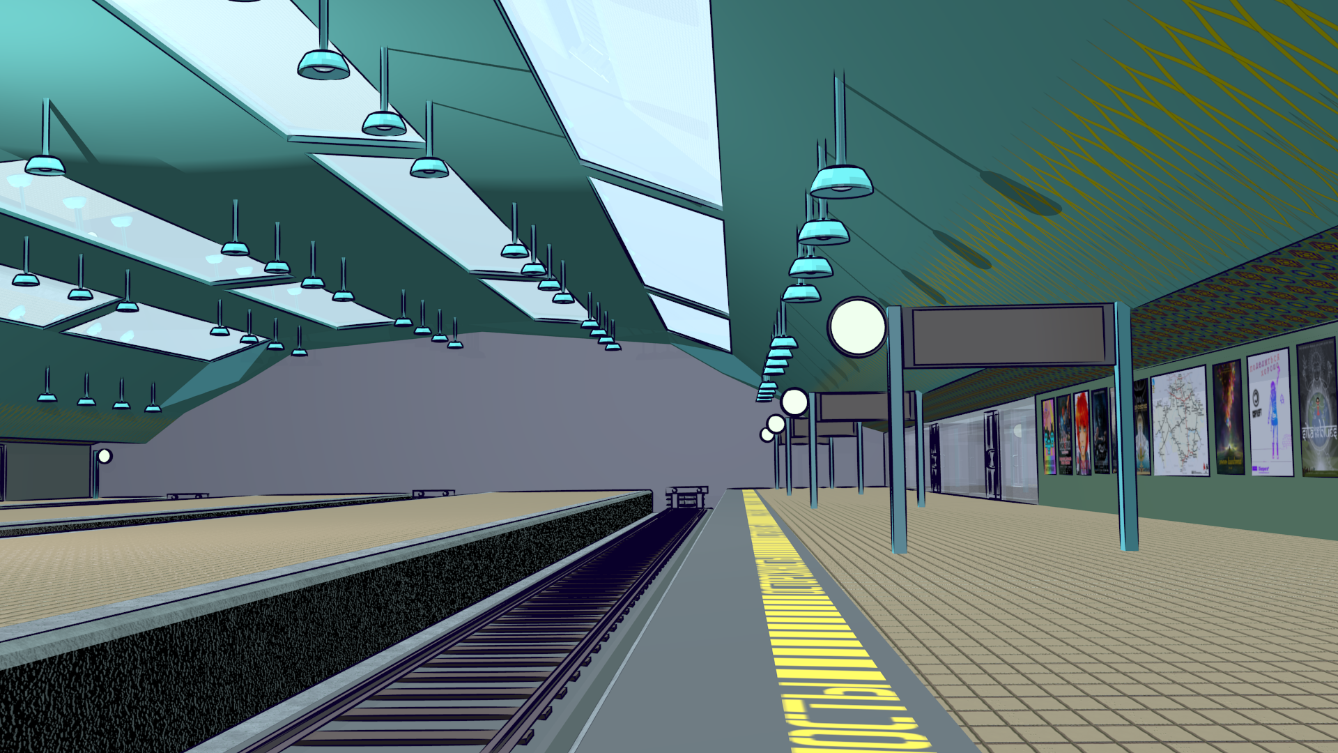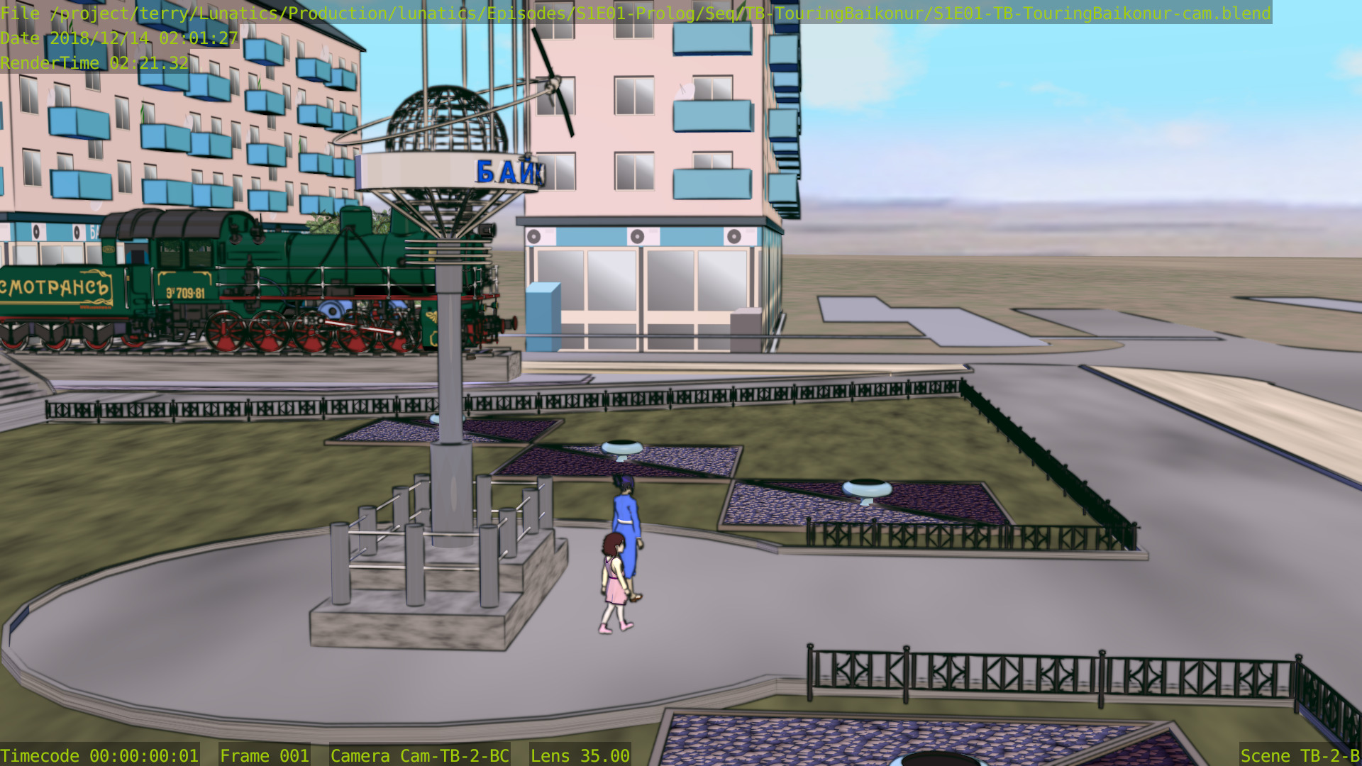 This shot is also missing a skyline backdrop in the far background, the extras (other people on the platform), and some additional set dressing.