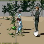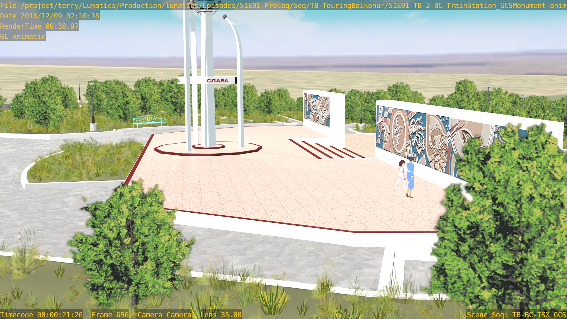 At the edge of the modeled part of these railroad tracks, they are meant to transition to lines on the surface texture for the plain. But it’s quite trick to match a texture up to a modeled element convincingly. I think I’ve gotten it close enough (this is a closer shot that you are likely to see in the final animation).