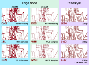 Using Edge Node does make it a requirement that we use anti-aliasing with the “full sample” storage option to get good results. However, we will be using anti-aliasing for good final-quality renders in any case, as well as computing the motion-vector map, which is used to create motion-blur. So, while this has an effect in testing, it won’t mean much to final render times.
