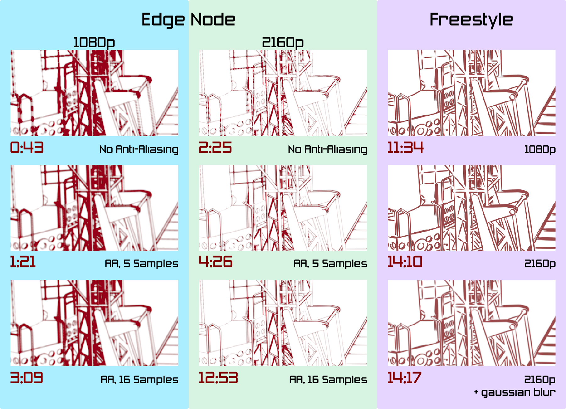 The option of rendering Edge Node lines at double-resolution, which I tried out in my previous tests, turns out to be a disaster for performance: those Edge Node renders are much slower than the Freestyle renders on this shot.