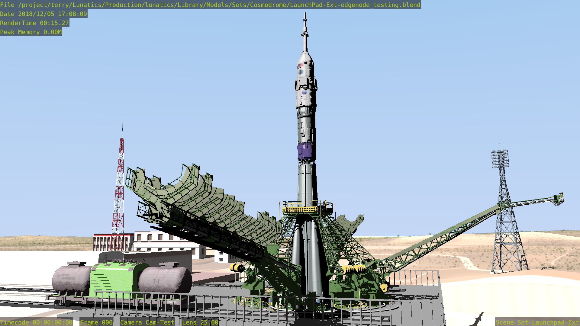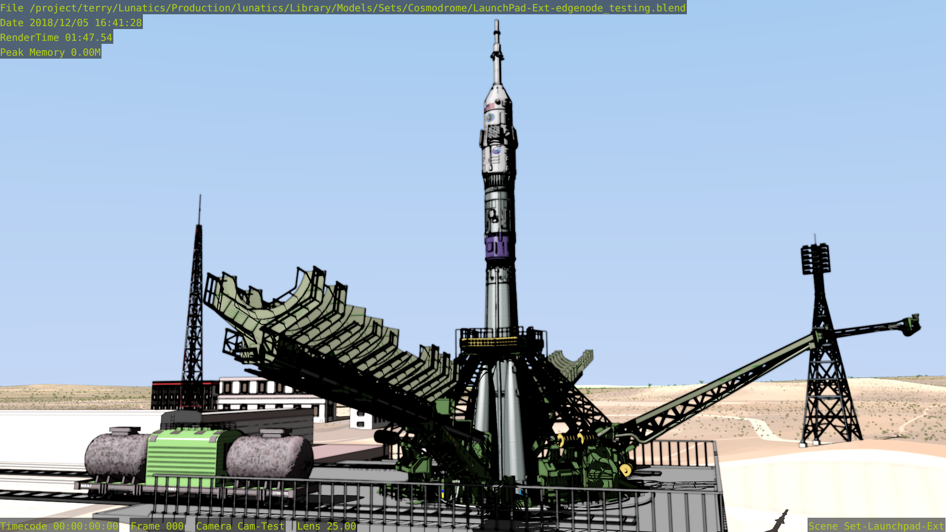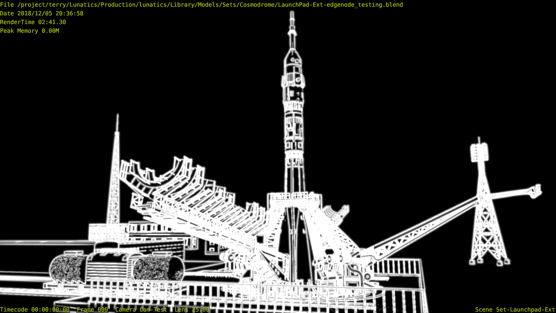 I spent about two days experimenting with Edge Node and then making comparison Freestyle renders of the same shot of the Soyuz gantry, to get an idea of the differences in performance and quality that I would get using either Edge Node or Freestyle on this scene.