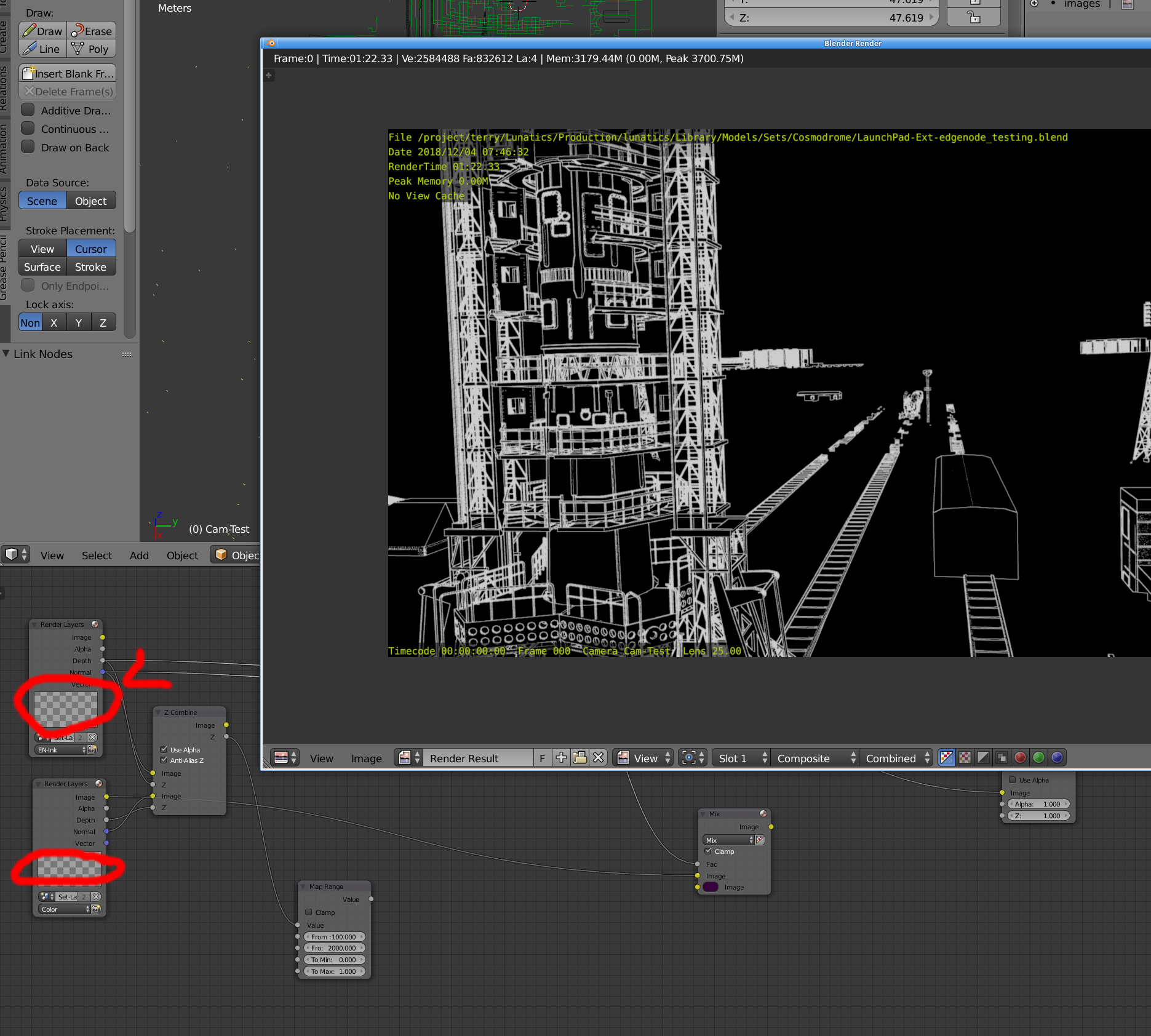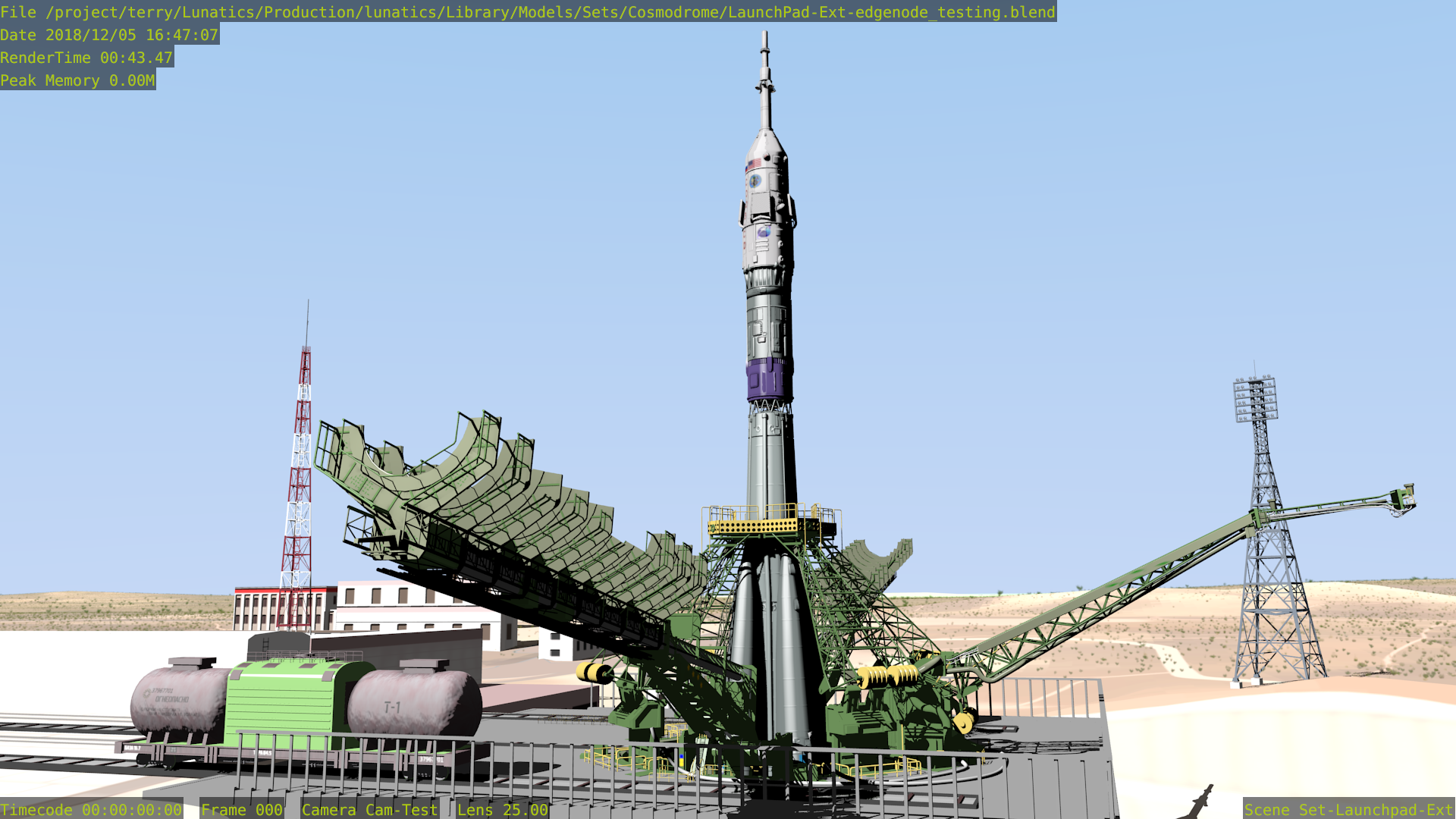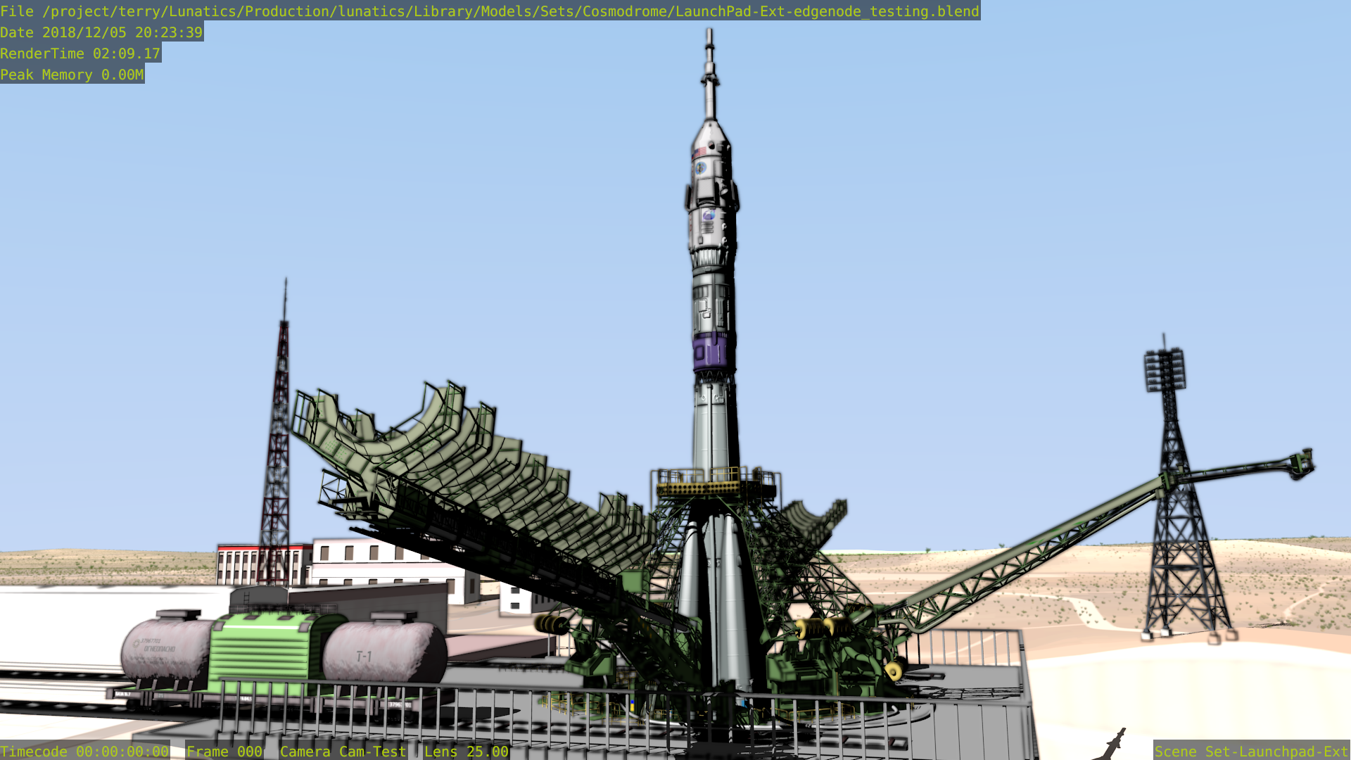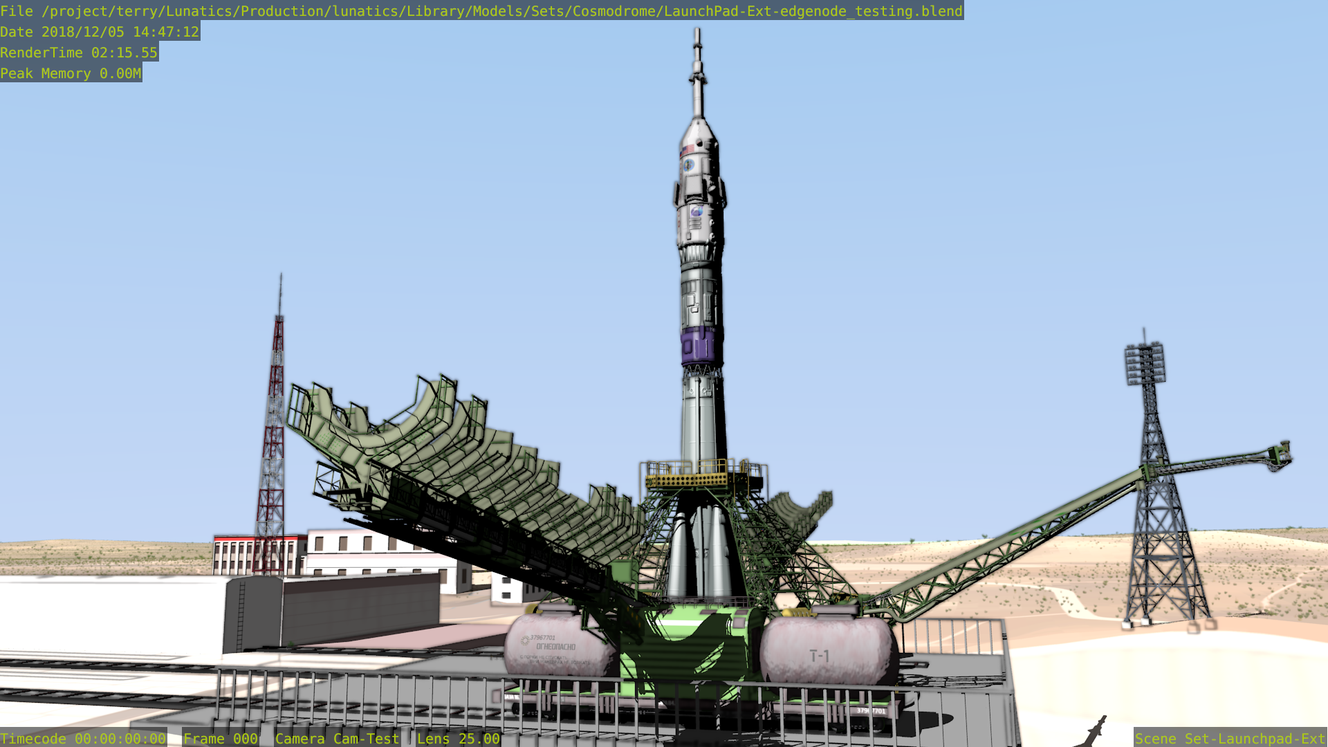 I spent about two days experimenting with Edge Node and then making comparison Freestyle renders of the same shot of the Soyuz gantry, to get an idea of the differences in performance and quality that I would get using either Edge Node or Freestyle on this scene.