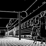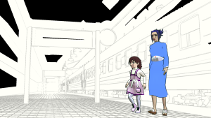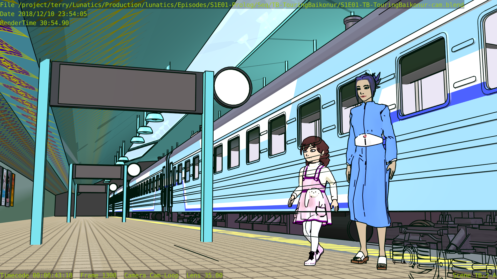 When I tried to render this scene entirely using Freestyle for inking, the render time was through the roof — about 30 minutes per frame, owing (probably) to the multiple train cars being included in the shot. It also had some fairly serious errors: