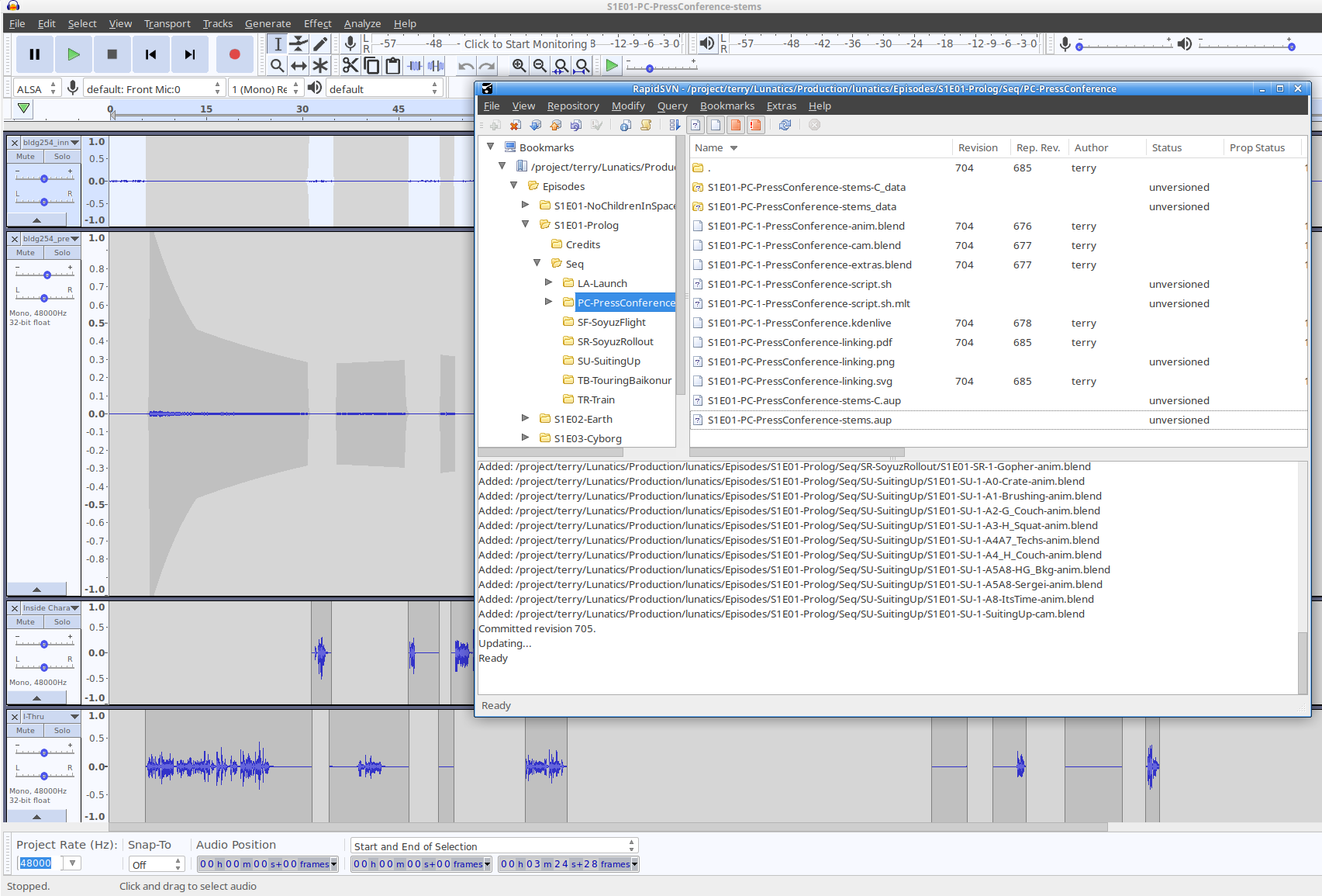 For example, we have a 3-minute sequence in our pilot episode, which is called the “PC-PressConference” sequence in our sources. The “.aup” file and associated “_data” clips directory consume 194 MB of disk space. But we can compress those with the “zip” utility (I use zip rather than tar/gzip because it’s more readily available on Windows and Mac platforms, while also being available as free software on Linux):