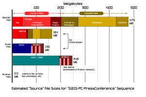 There will probably be a lot of differences between the six sequences in the pilot episode, but if we just ignore that and assume they all are about the same size, then this gives an estimate for the overall size of the source code of about 1.8 GB — or about half the size of the single-layer DVD we plan to distribute them on. Assuming the rest is allocated for the playable video DVD of the 16-minute episode and extras, this seems like it will probably all fit, though it will certainly fill up the disk!