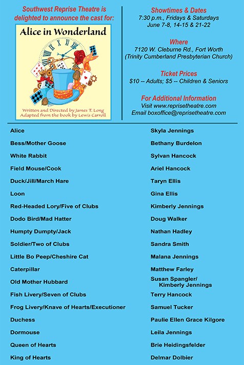 - Joined Southwest Reprise Theatre’s “Alice in Wonderland” production.