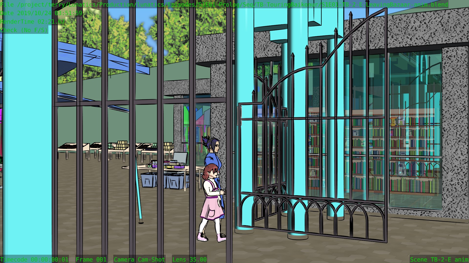 15:28 Integration of set and props into shot TB-2-D (Hiromi buying one of the boxes for Georgiana from a salesman in the market).