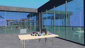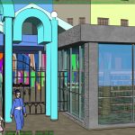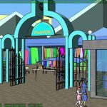 My original concept was to use a lot of billboards on this set, but I finally decided it’d actually be easier to just do some simple models. Here, I’ve added some of the extra decorative boxes for the vendor table where Georgiana gets hers. And I’ve put some bookstore shelves in the glass shops behind it (will they have such large bookstores in 2040? — well, probably some anyway).