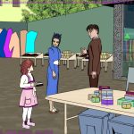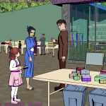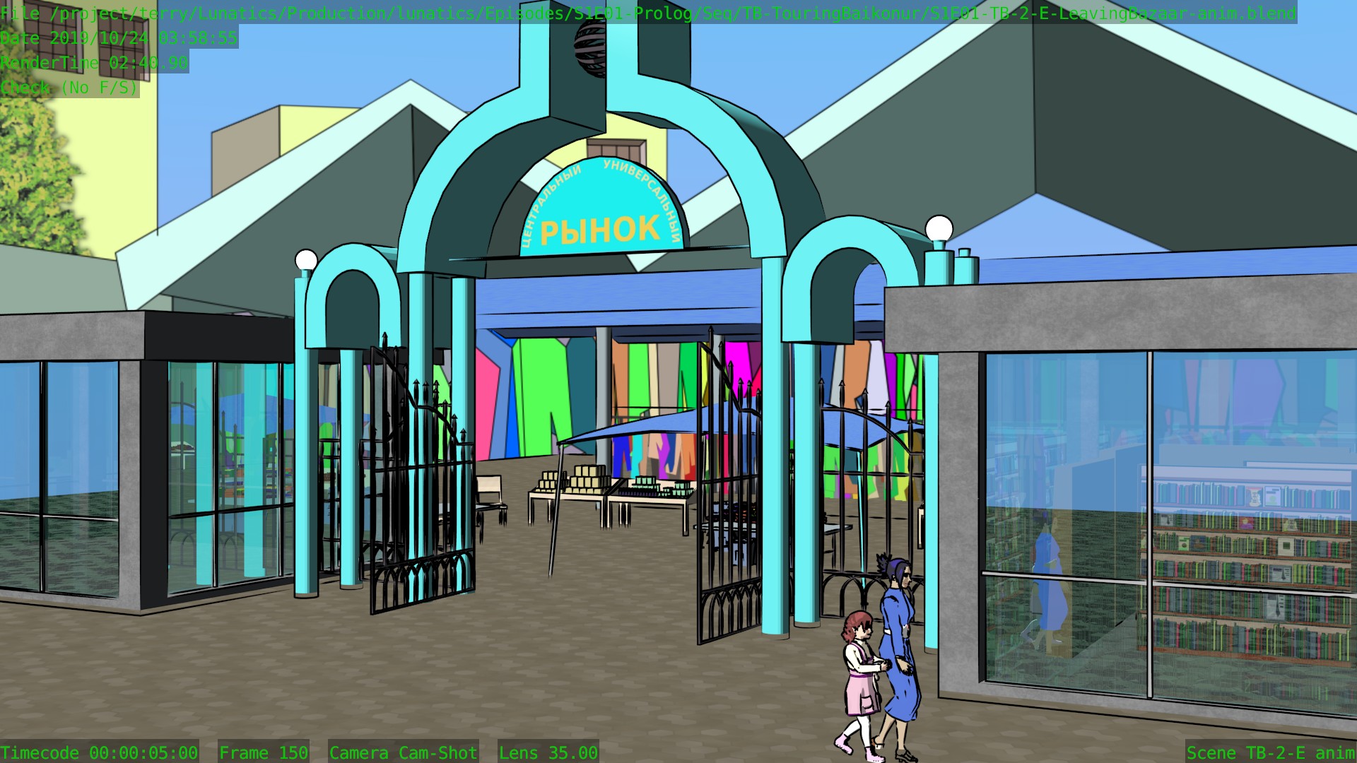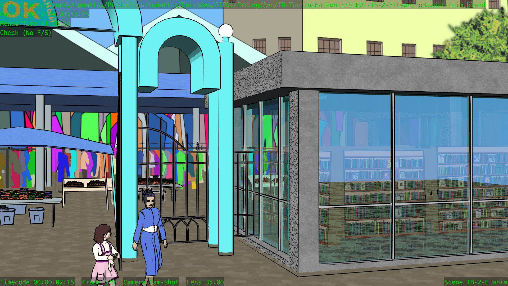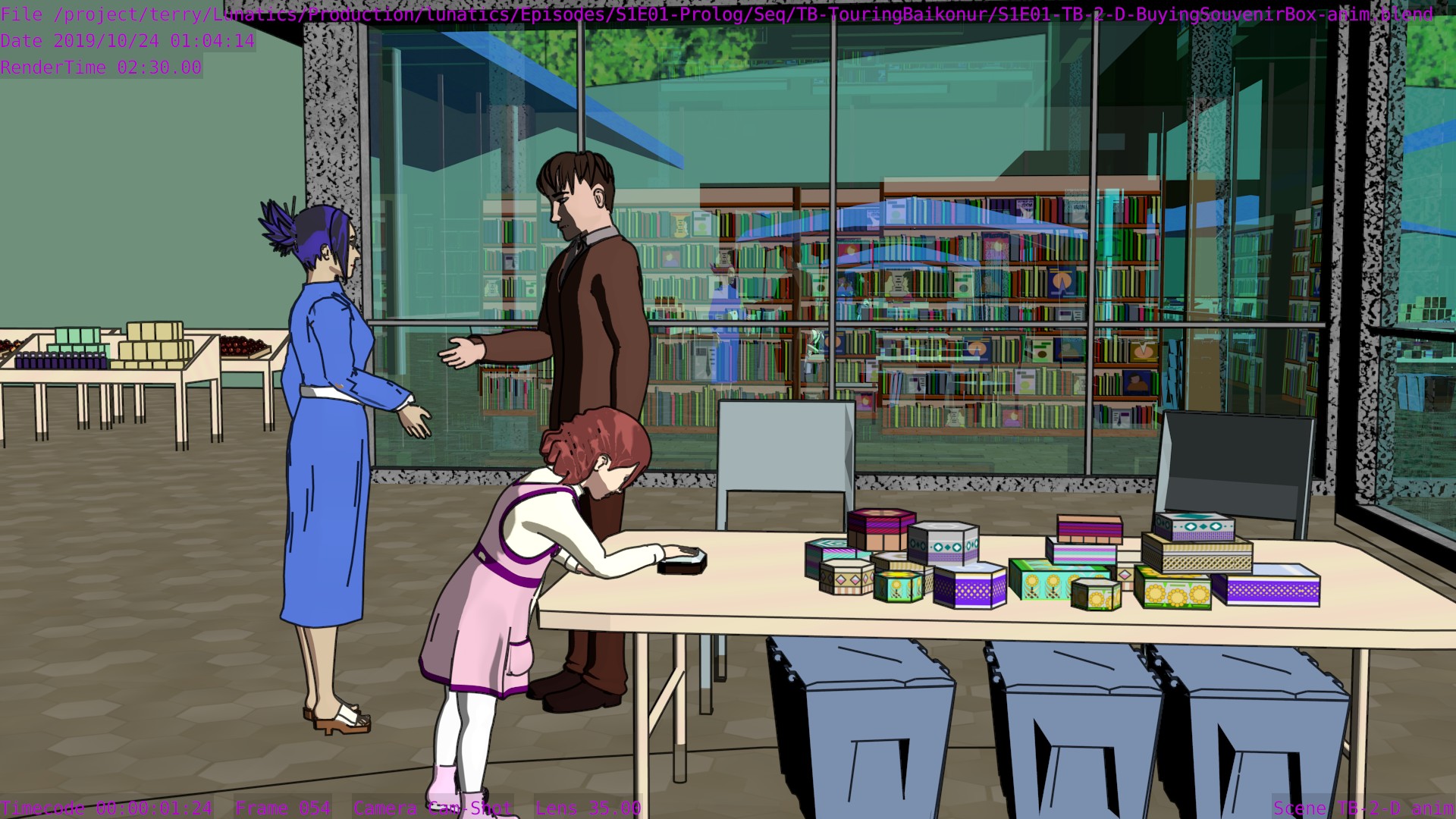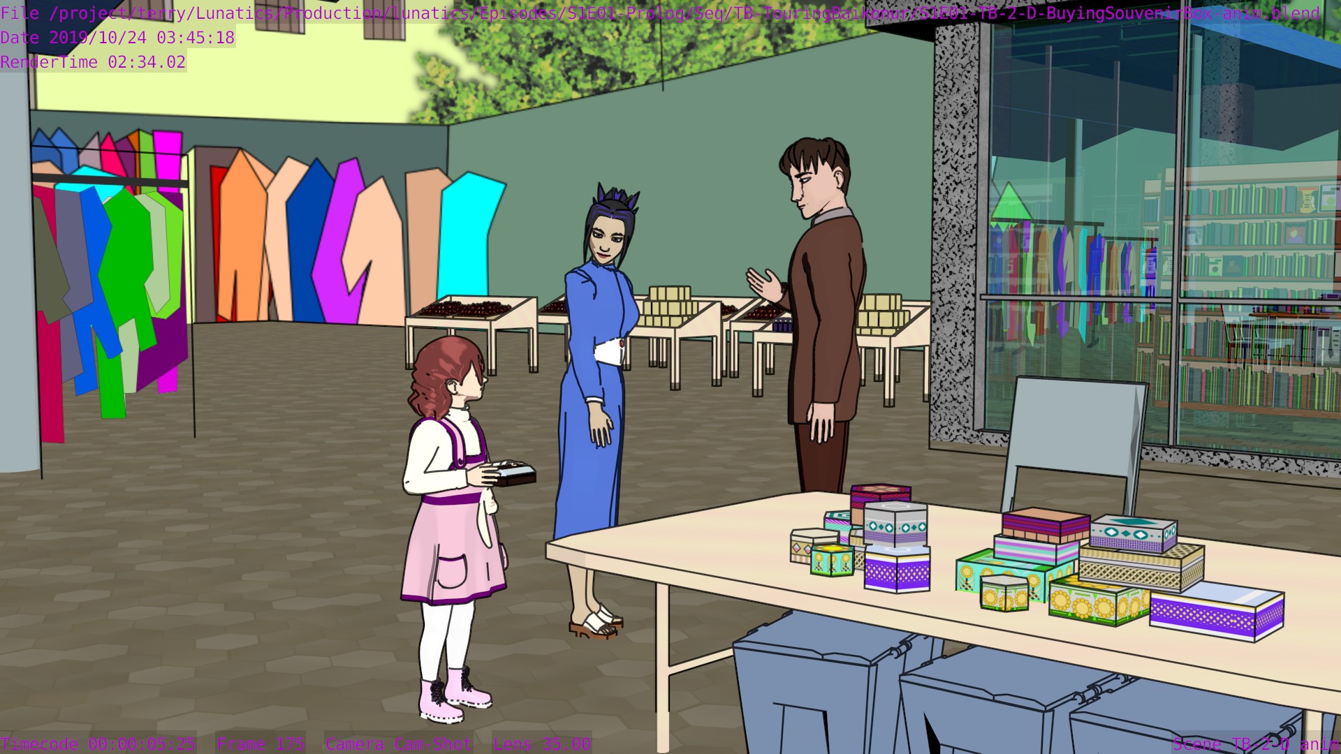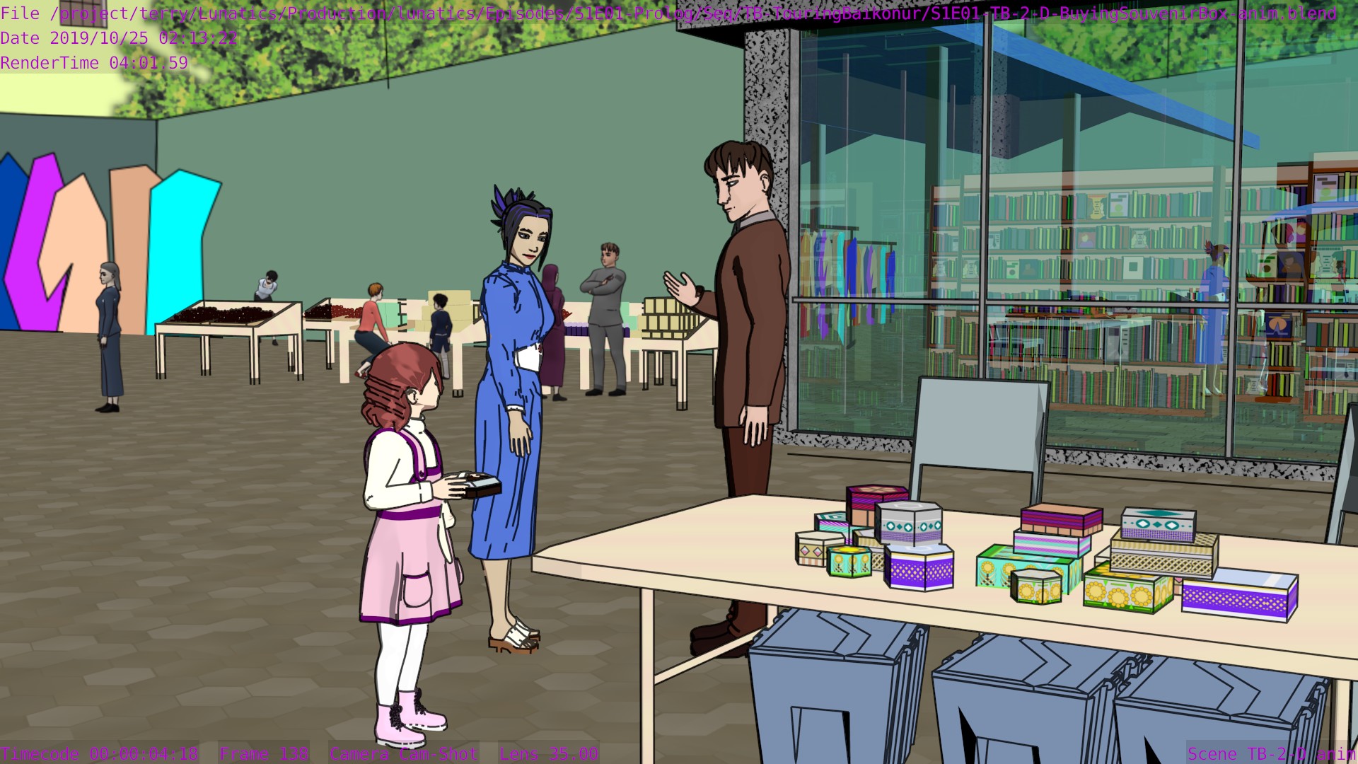 15:28 Integration of set and props into shot TB-2-D (Hiromi buying one of the boxes for Georgiana from a salesman in the market).