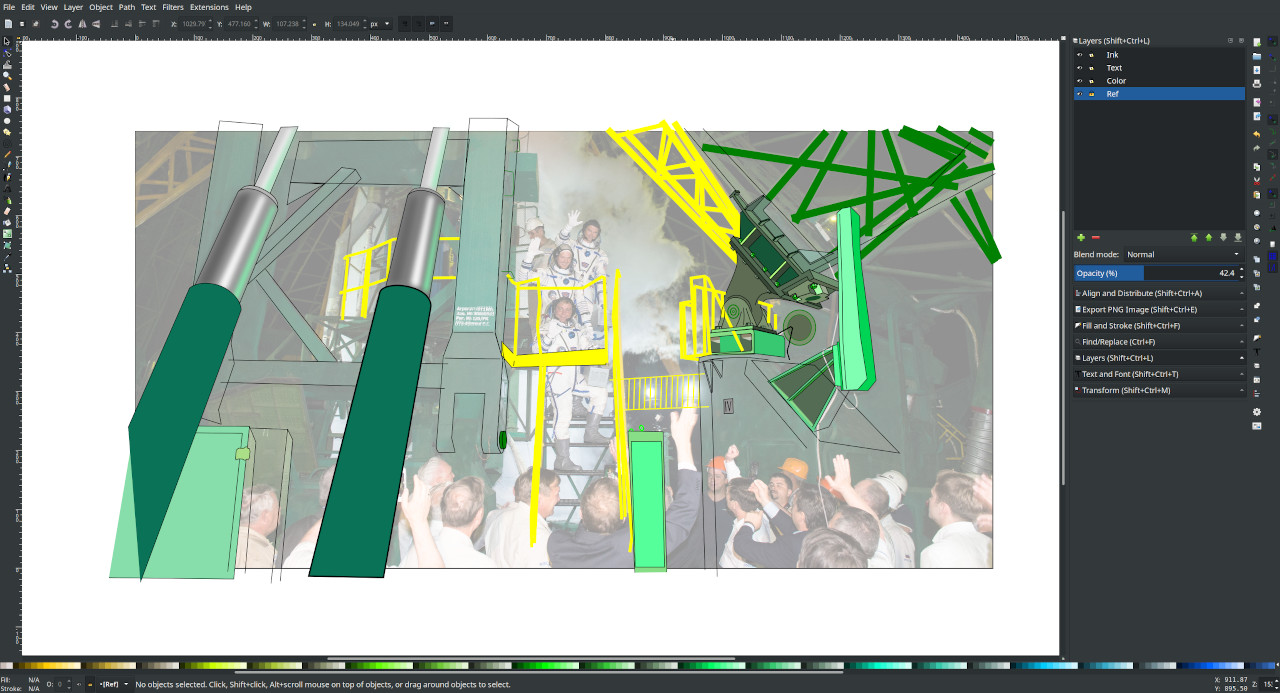 00:12 Drawing the 2D flats for shot LA-1-D, in the launch sequence (Krita, then Inkscape).