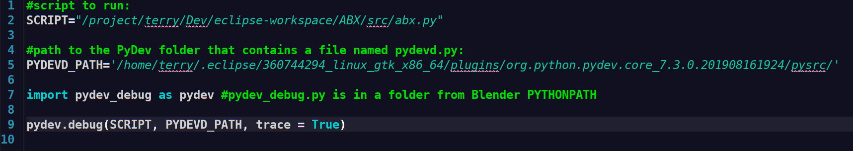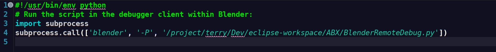 #!/usr/bin/env python # Run the script in the debugger client within Blender: import subprocess subprocess.call(['blender', '-P', '/path/to/BlenderRemoteDebug.py'])