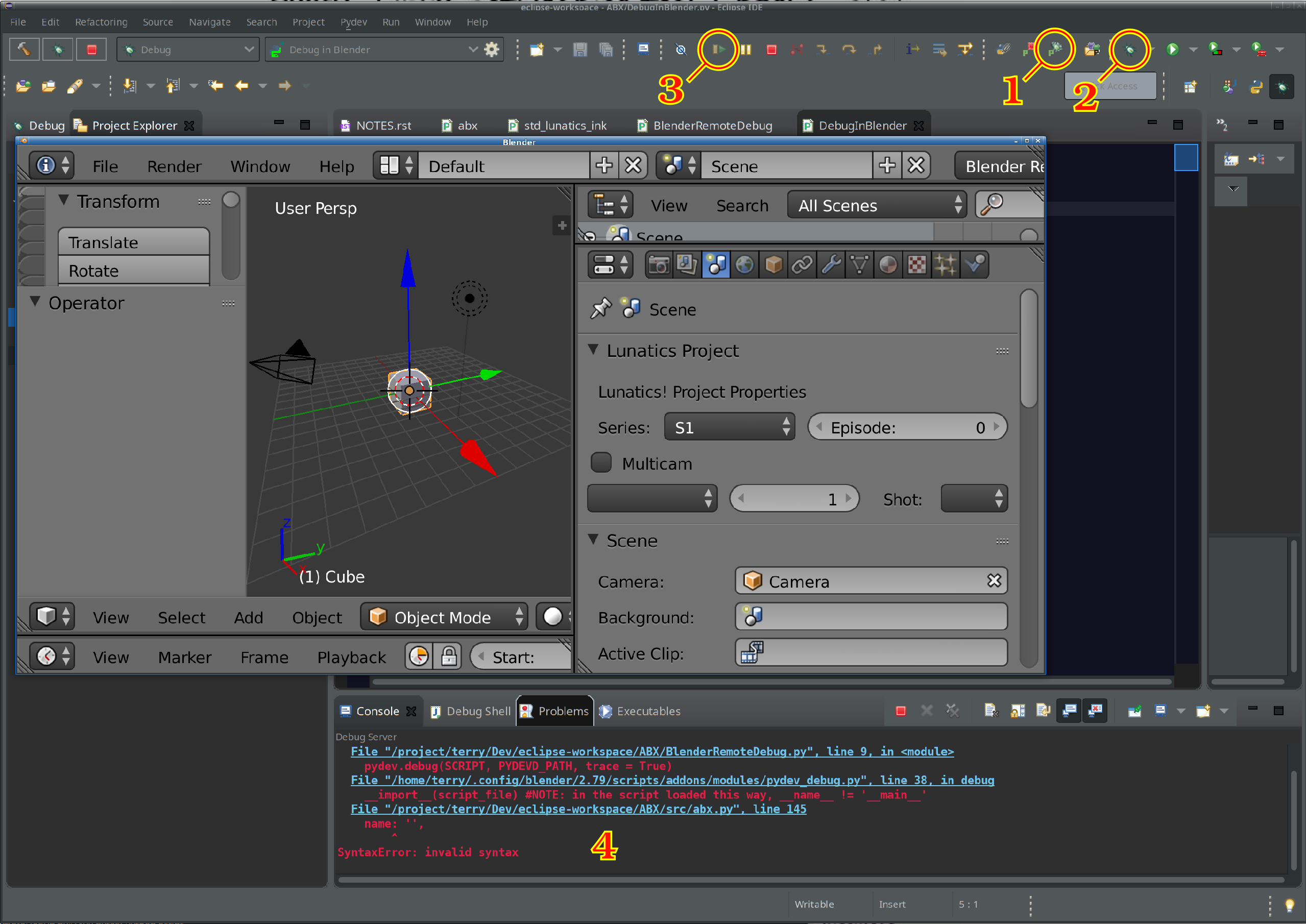 So my testing cycle is simply to push the button to start the “remote debugging server” in PyDev (1) and then click the “Debug” button to run Blender (2), load the script, and run it with the debugger. Since I’ve set a breakpoint early in the script, I also need to click on “Resume” (3) in order for Blender to finish loading.