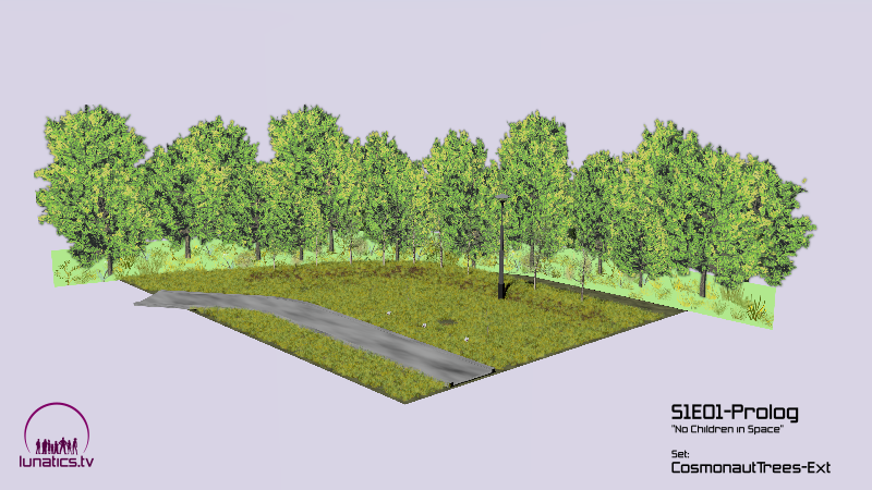 Last set completed for the “Touring Baikonur” sequence. We had to finish seven sets in total for this sequence. This one of a (fictionalized) section of the park with the “Cosmonaut Trees” (there really is such a park, adjacent to the “Cosmonaut Hotel”, but it’s not entirely clear which part of it this is).