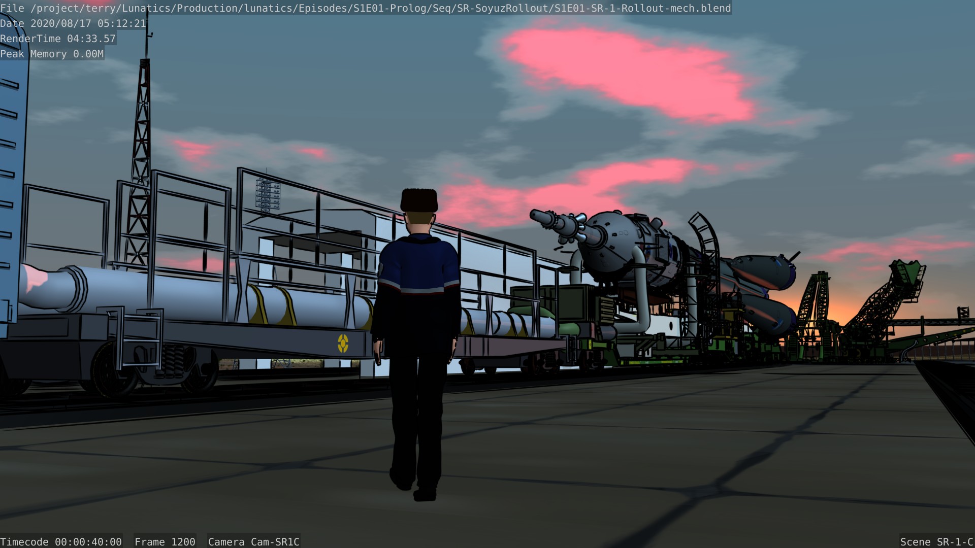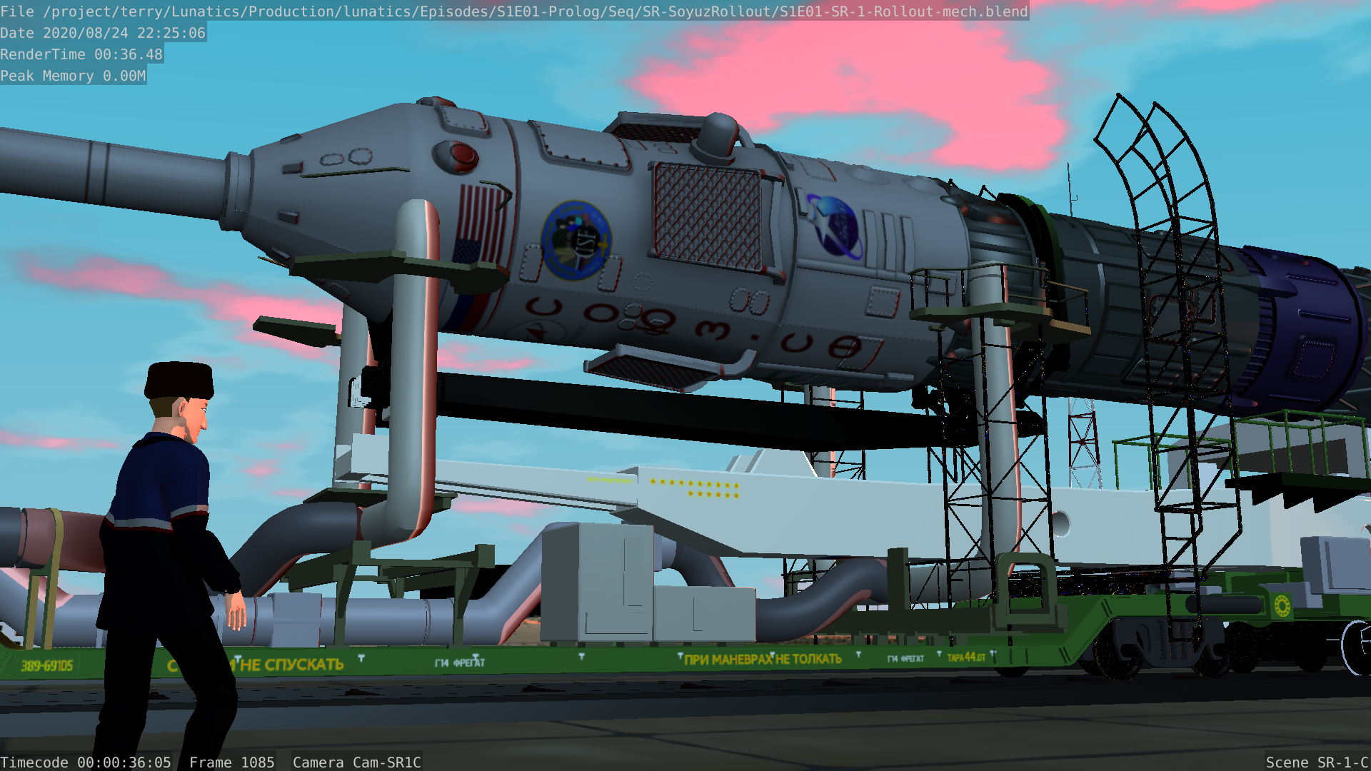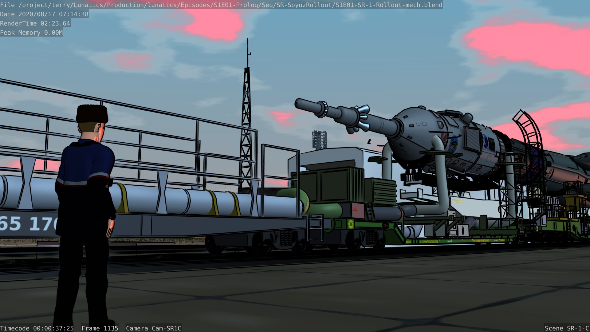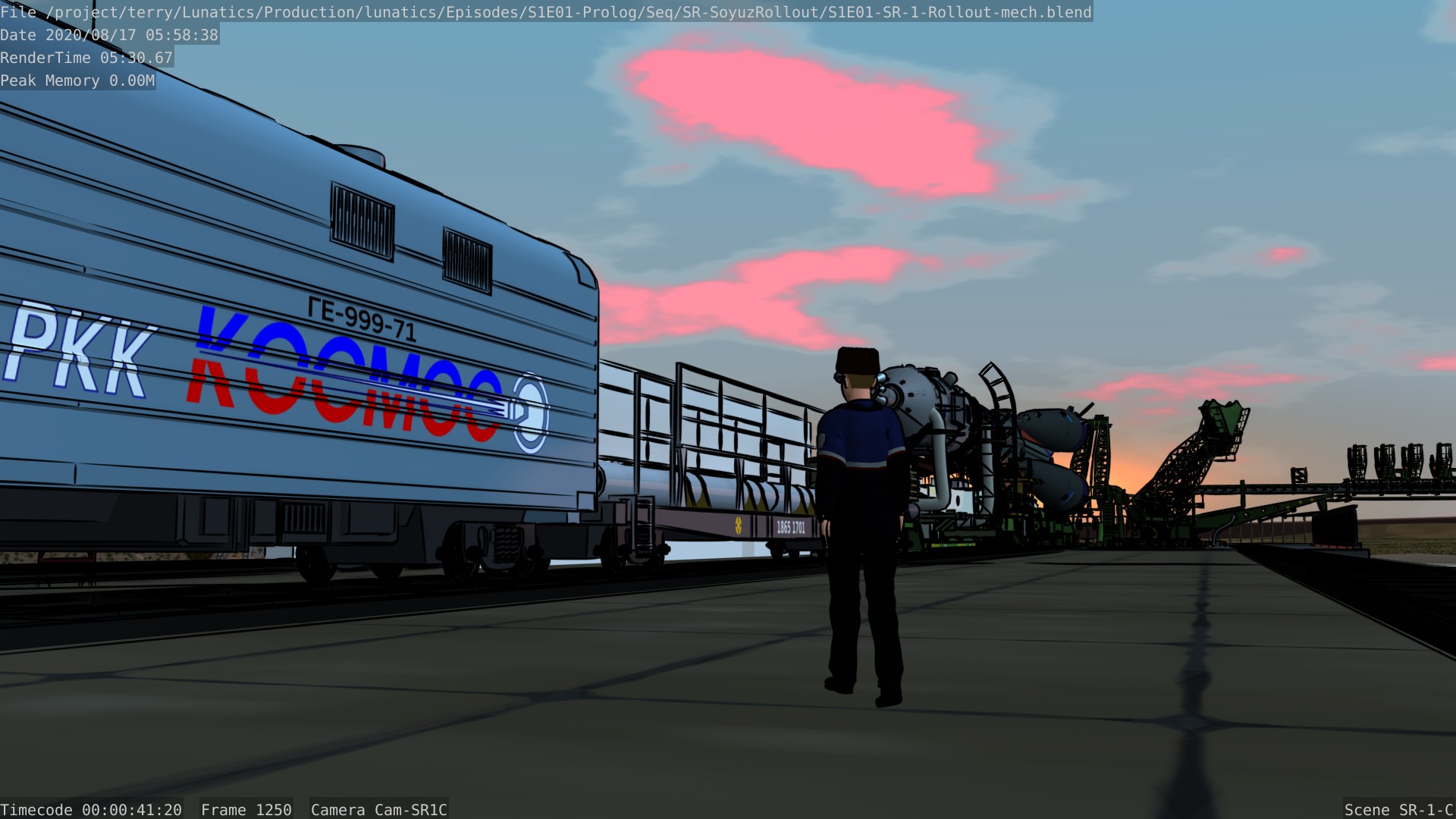 Still from the Soyuz rollout sequence for Part 1 of “No Children in Space”. This is almost identical to the preview trailer shot, except that freestyle (ink) lines have been enabled — as they will be in the final shot.