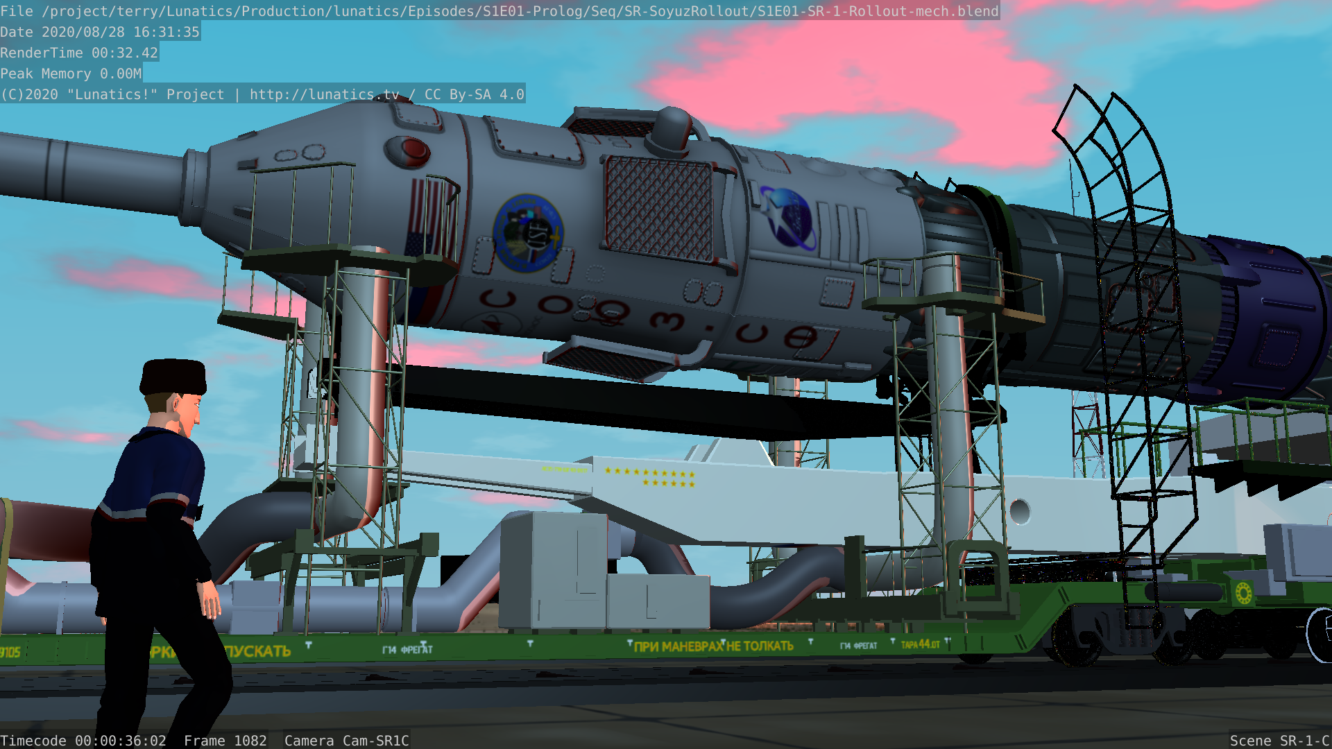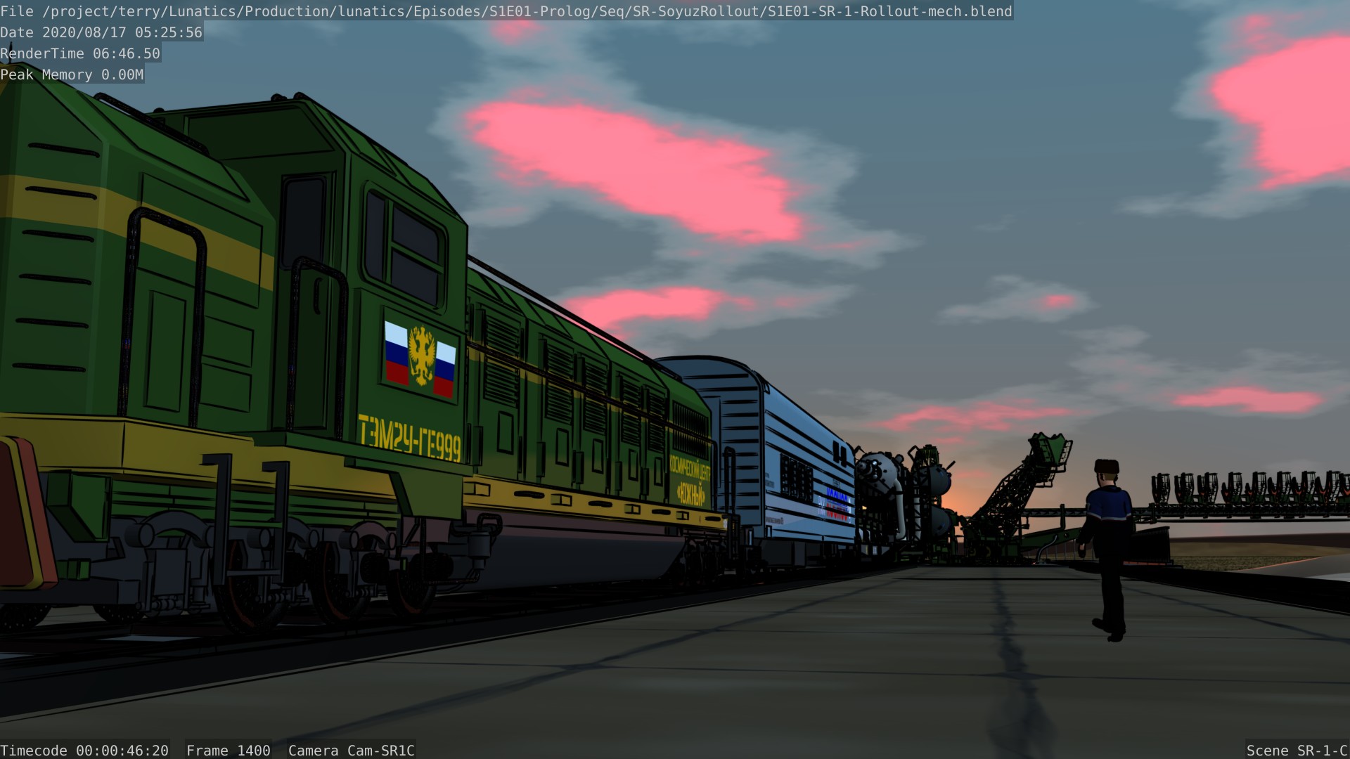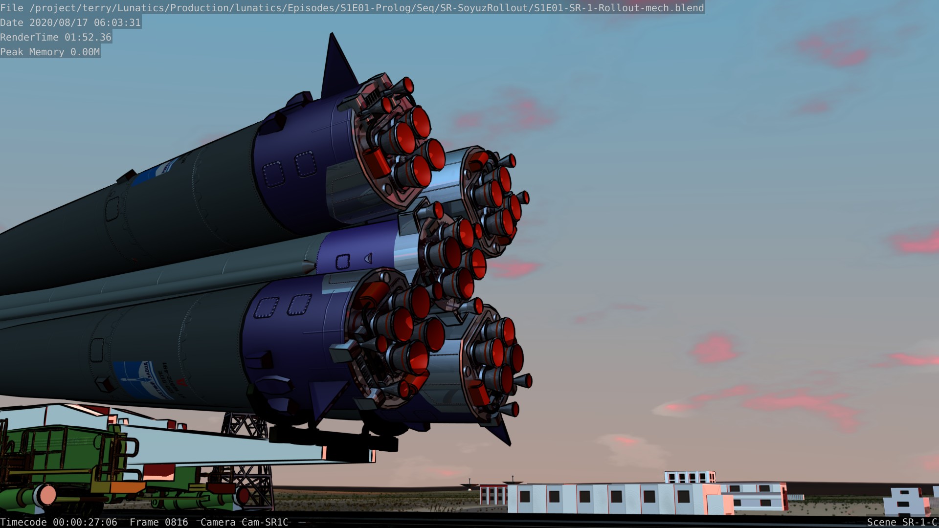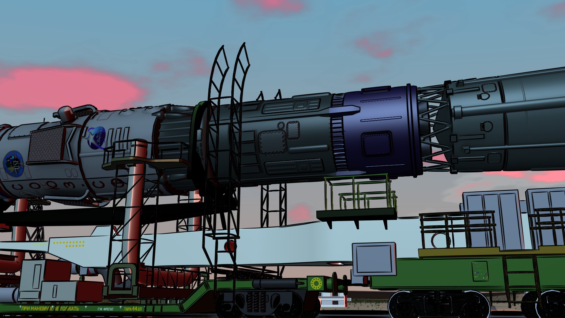 Still from the Soyuz rollout sequence for Part 1 of “No Children in Space”. This is almost identical to the preview trailer shot, except that freestyle (ink) lines have been enabled — as they will be in the final shot.