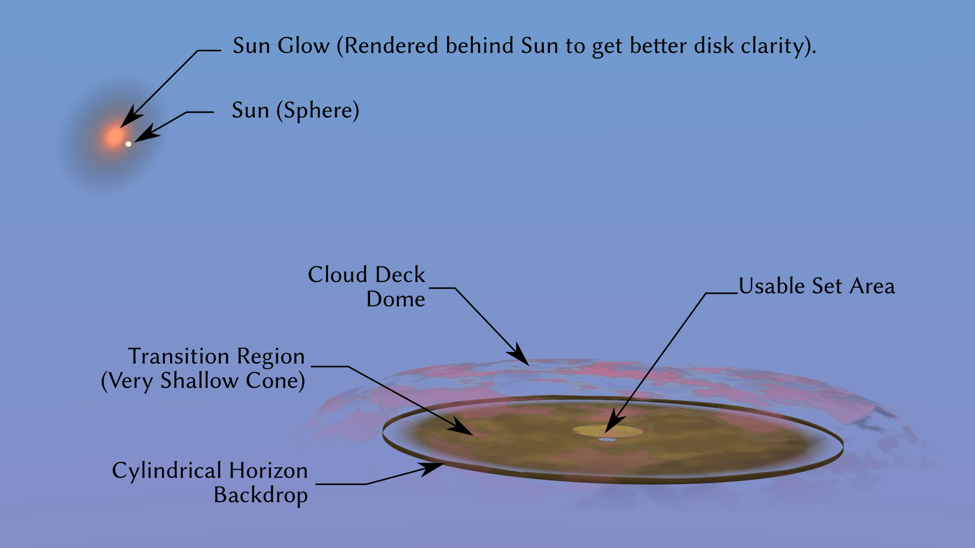 Quick overview render with labels, for the “Combined Sky System” file. This is a Blender background set to provide the sky, horizon, and clouds for outdoor shots.
