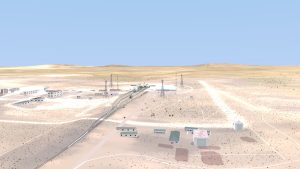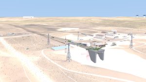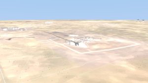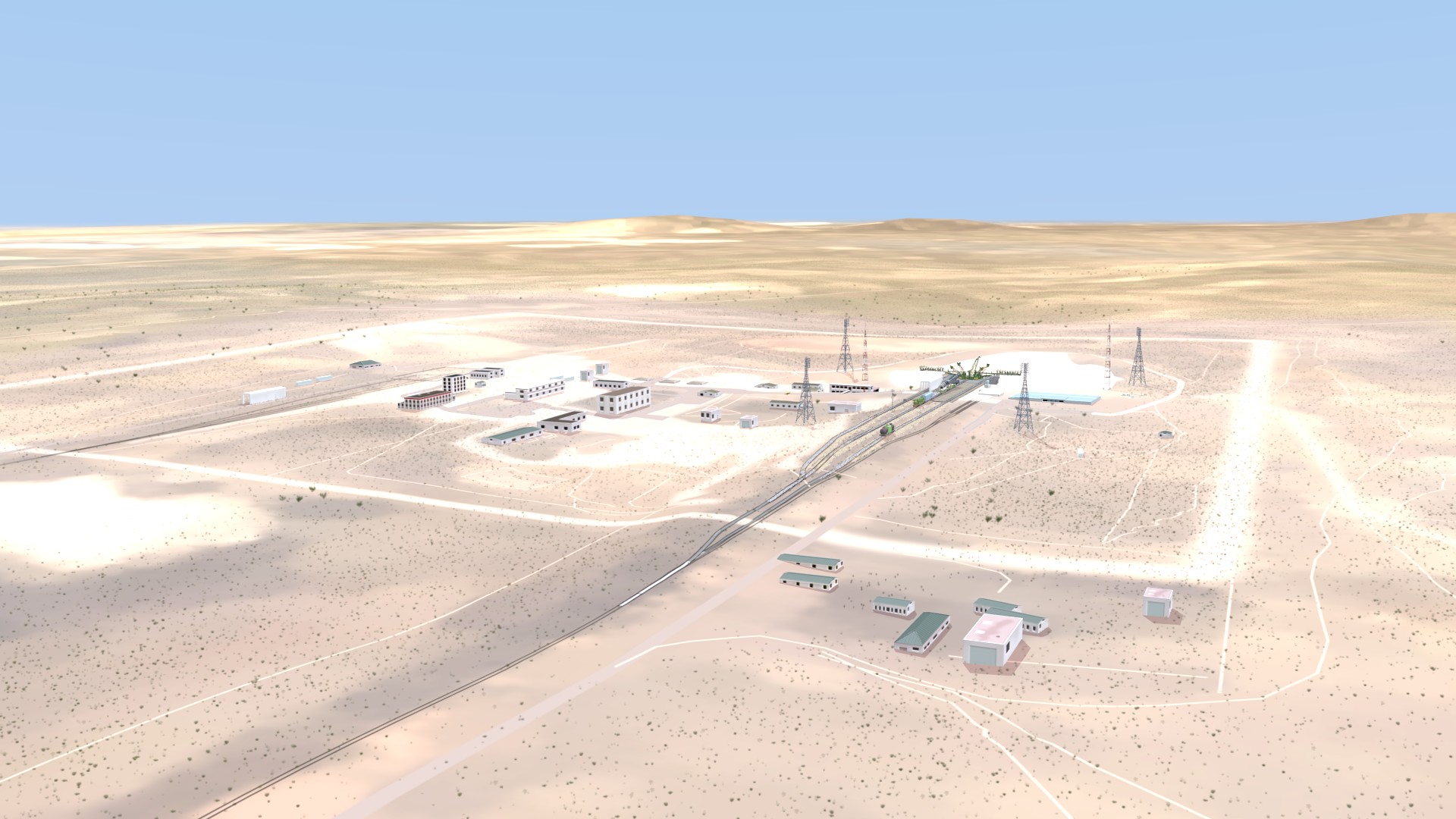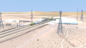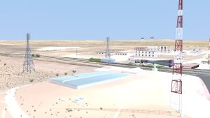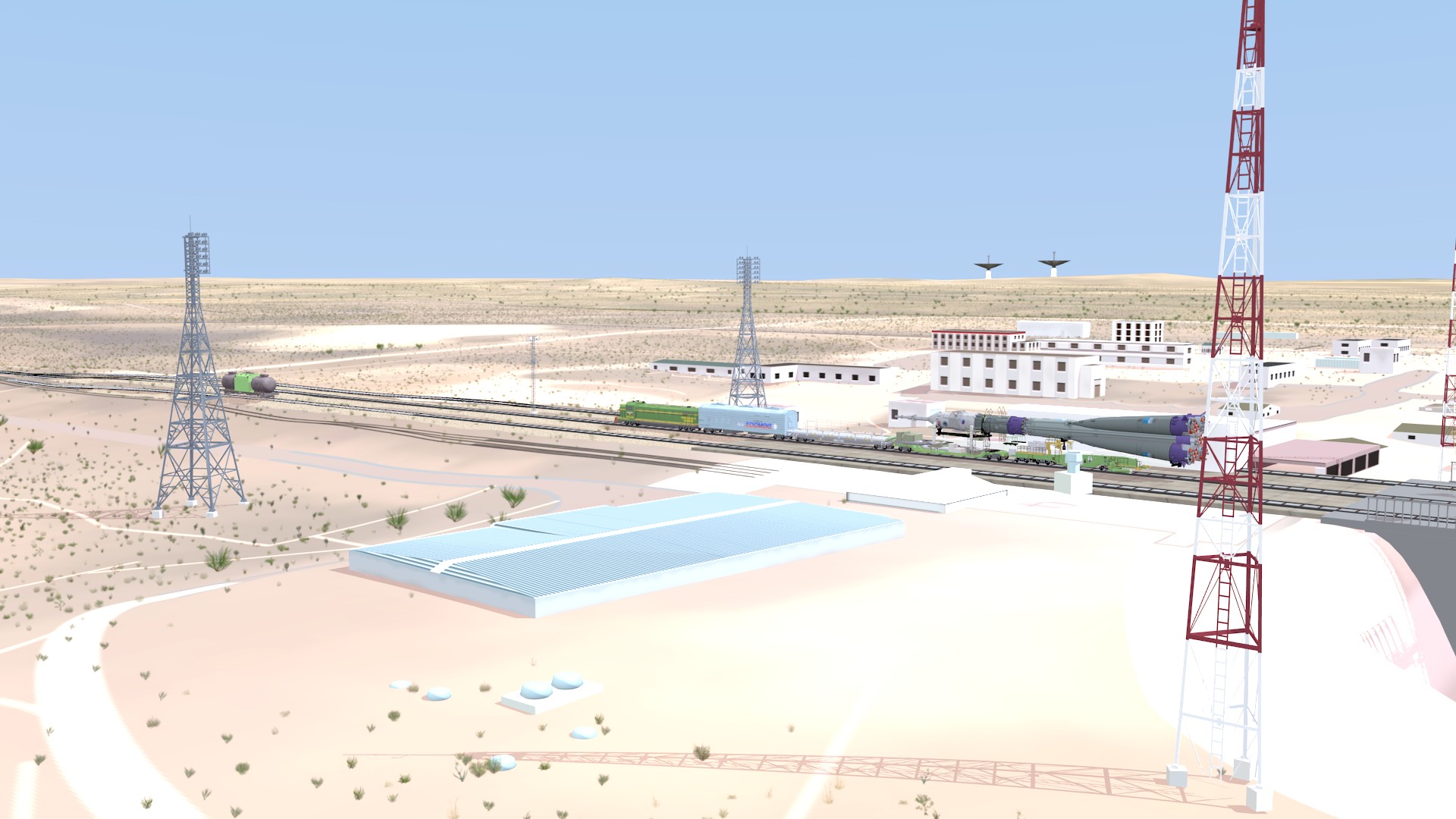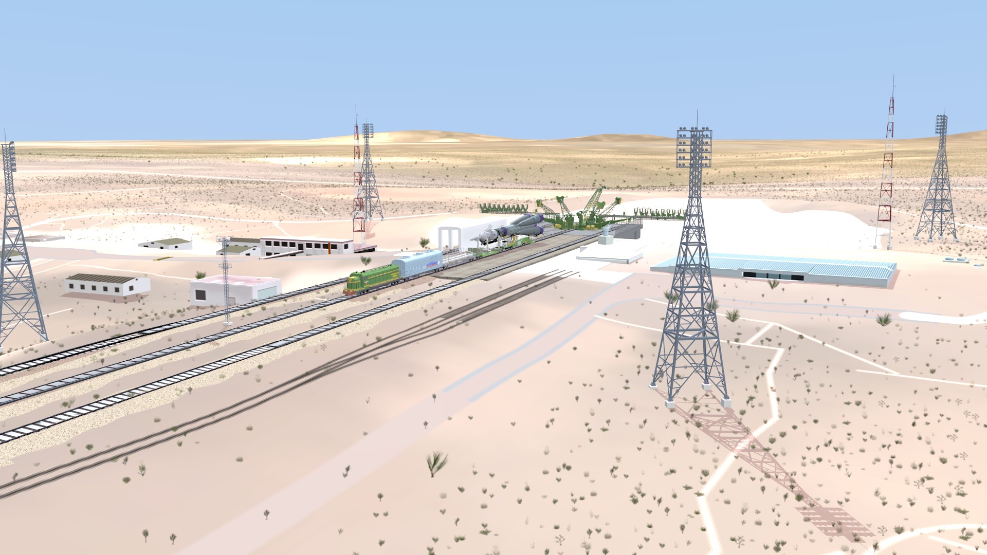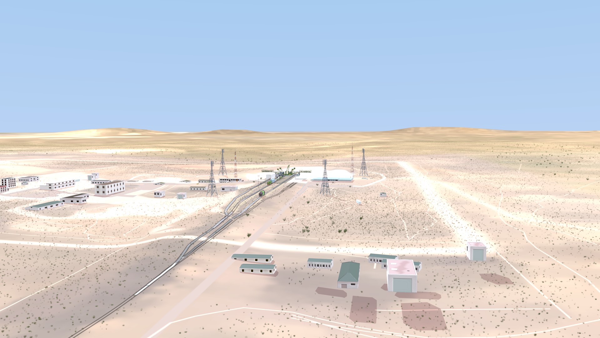 I also corrected some modeling errors on the Transporter-Erector model, made changes to the buildings around the pad, and I solved the “floating track syndrome” by adding railroad embankments and a curve-based track extension to go from the straight mesh-modeled tracks to merge with the drawn tracks on the terrain texture.