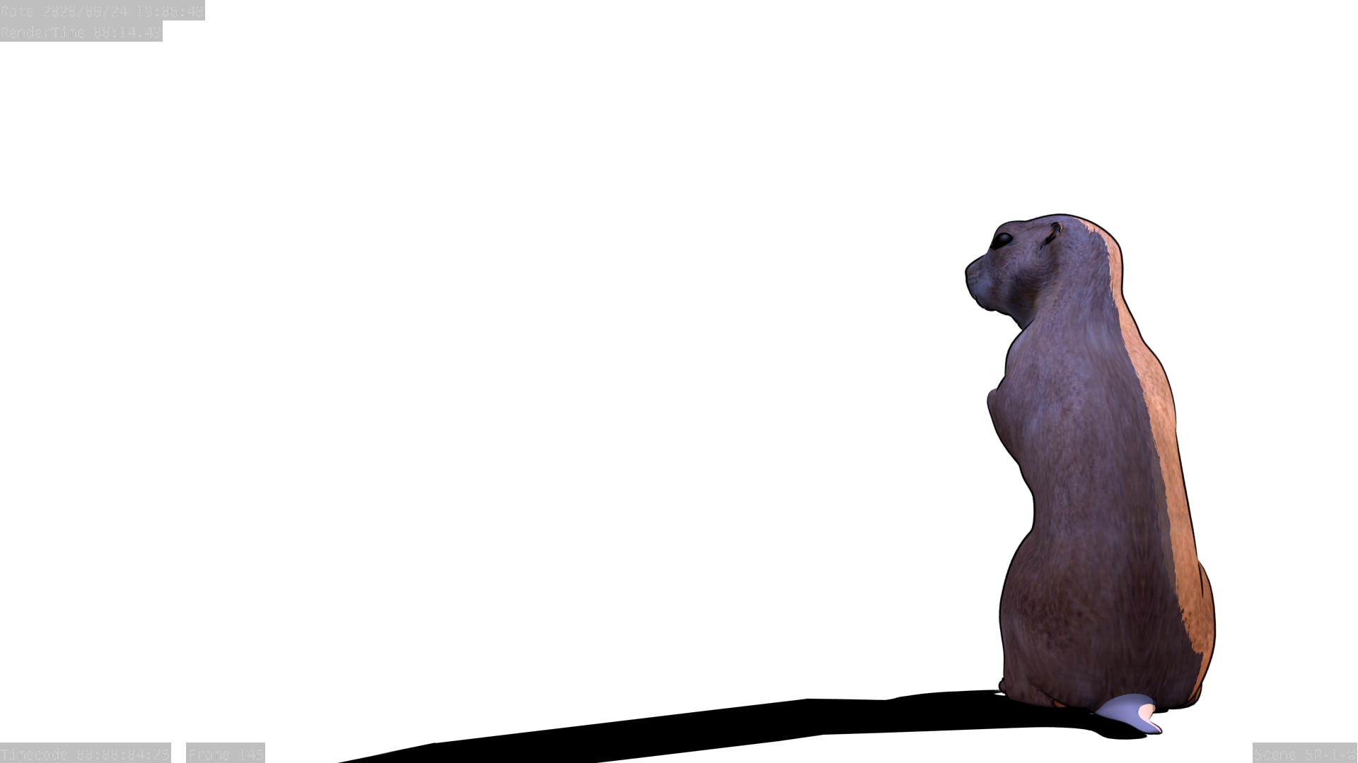 This is actually two renders and a static cel. The shadow is on a shadow-only surface, while the ground he’s sitting on is a static drawing.
