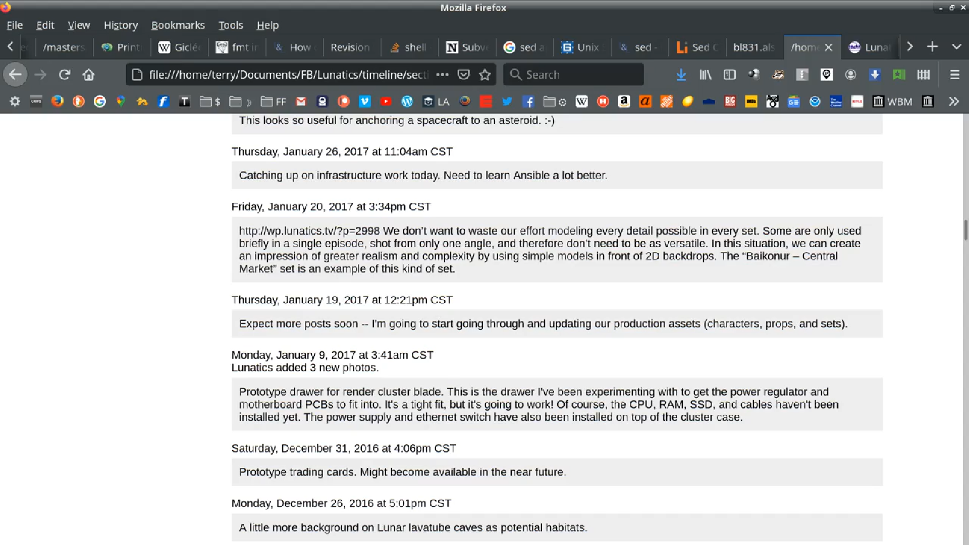Once I get back to about 2014, I should be able to look up Kickstarter updates I posted. And if I get back as far as 2010, the very earliest “Lunatics!” related posts were articles I wrote for my blog at Free Software Magazine, for which I have date-based archives, already.