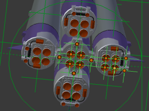 Here I’m just creating empties in the Launch Vehicle model to match the locations of the rocket engine bells, so I can construct the flame plume effect to match (the orange dots show the empties that will be used for this).