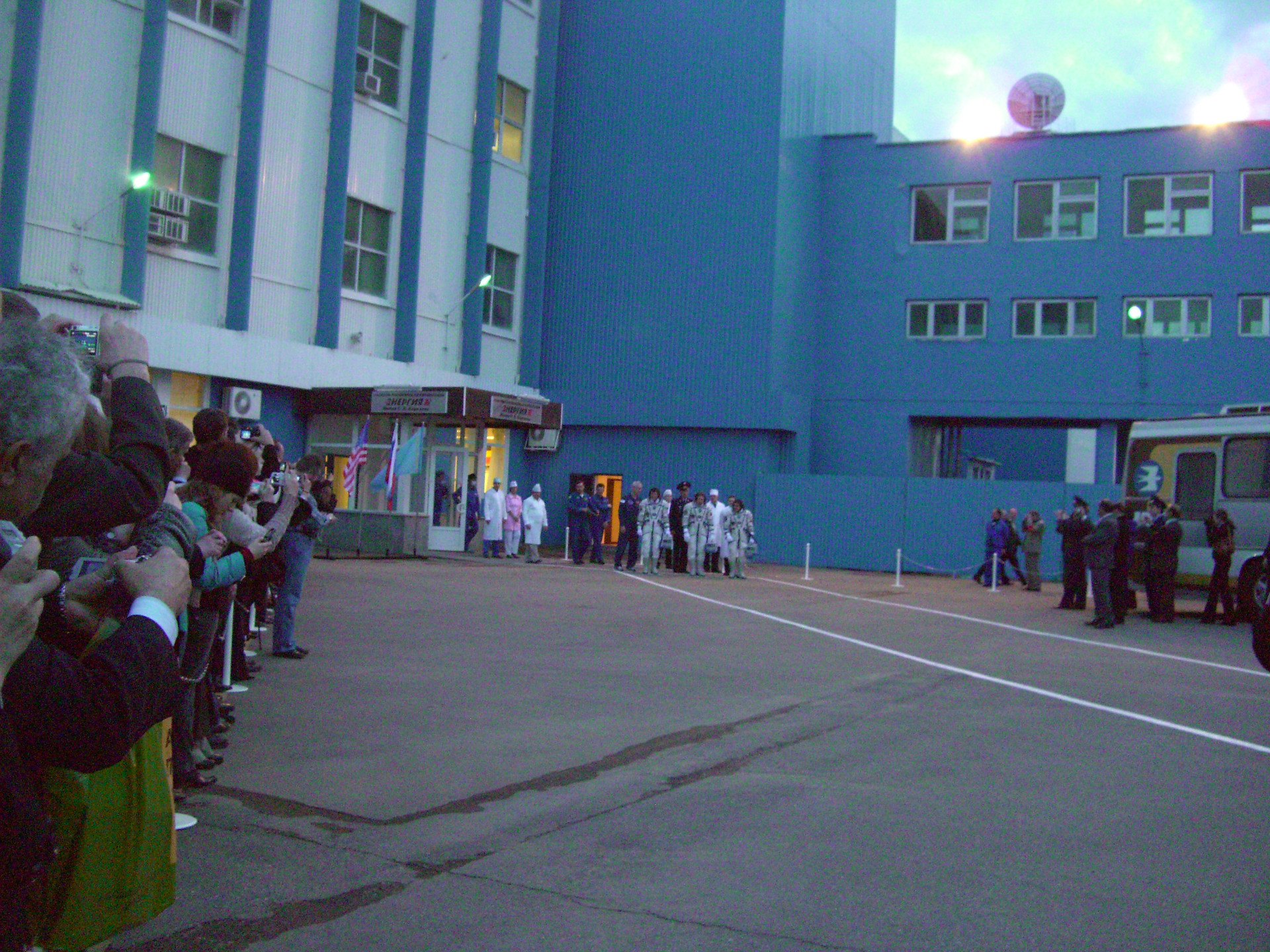 Part of the flight ritual for cosmonauts is the “commissioning” or “agreement to fly” on the Soyuz, a brief ceremony in which the crew formally accepts their mission from the commissioners. There are pavement markings with everyone’s marks, including press, cameras, and other observers.