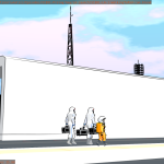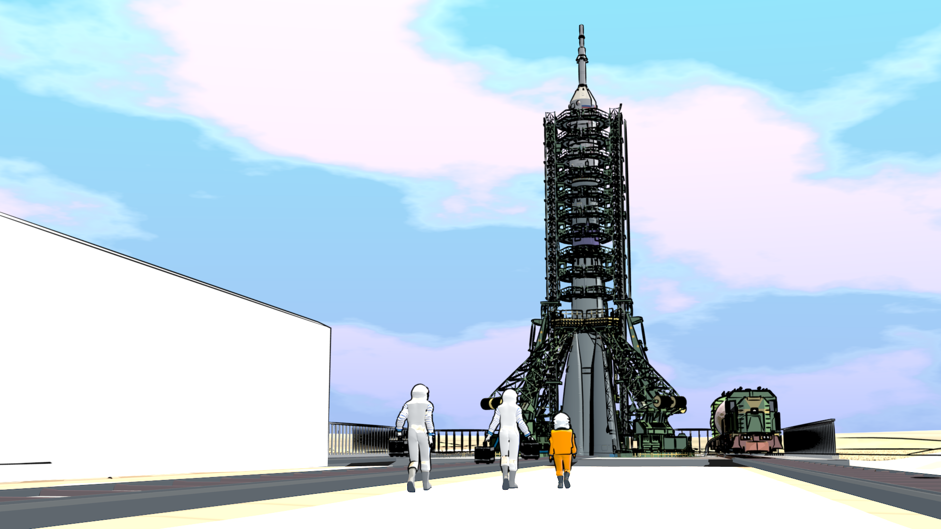 Just some production tests for the first two shots in the “Launch” sequence, which are another synchronized wipe (I did a shot similar to this in the “Touring Baikonur” sequence earlier, where Georgiana appears to skip across from one shot into the next.