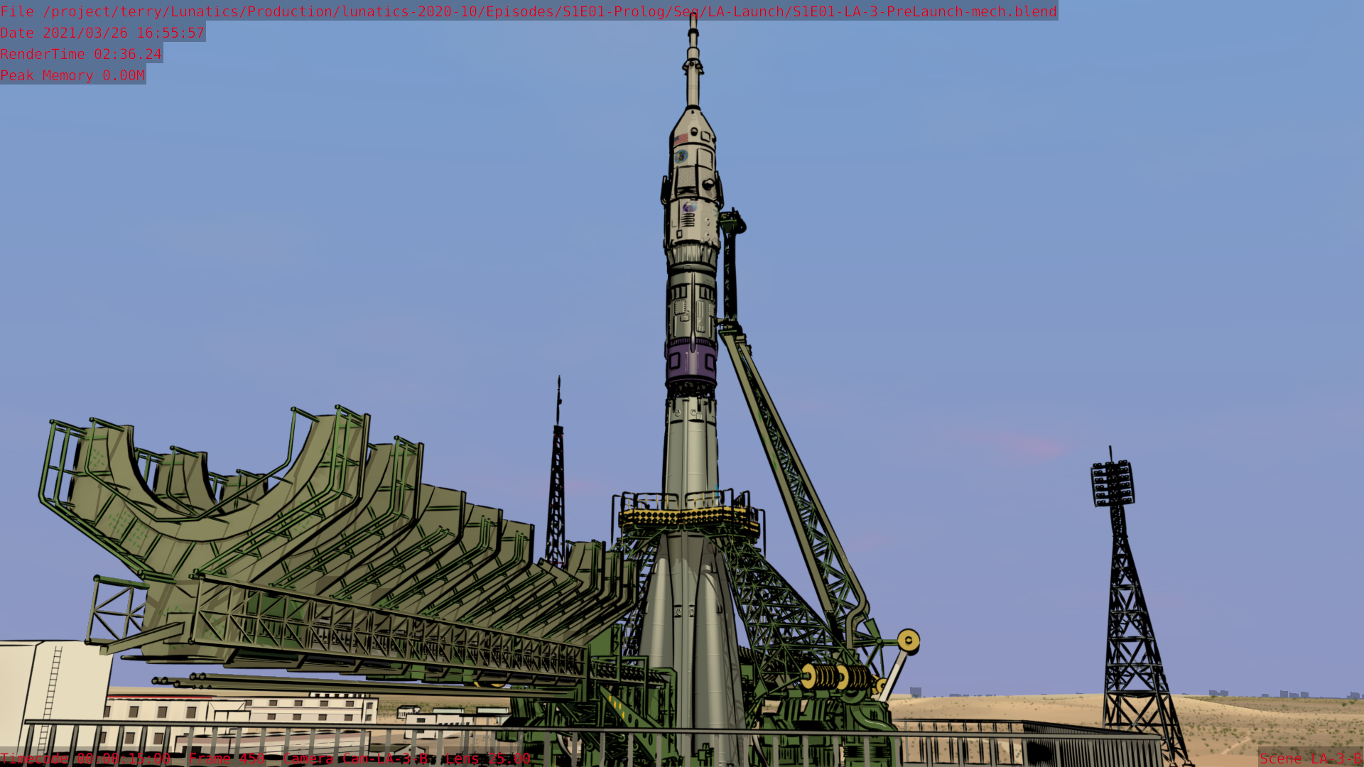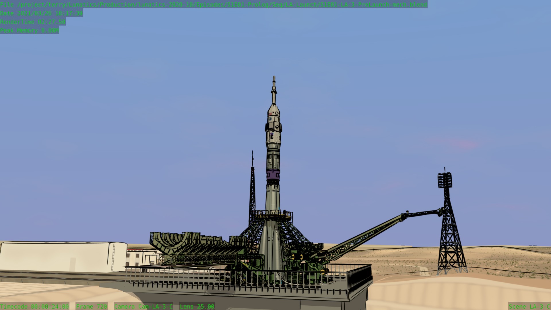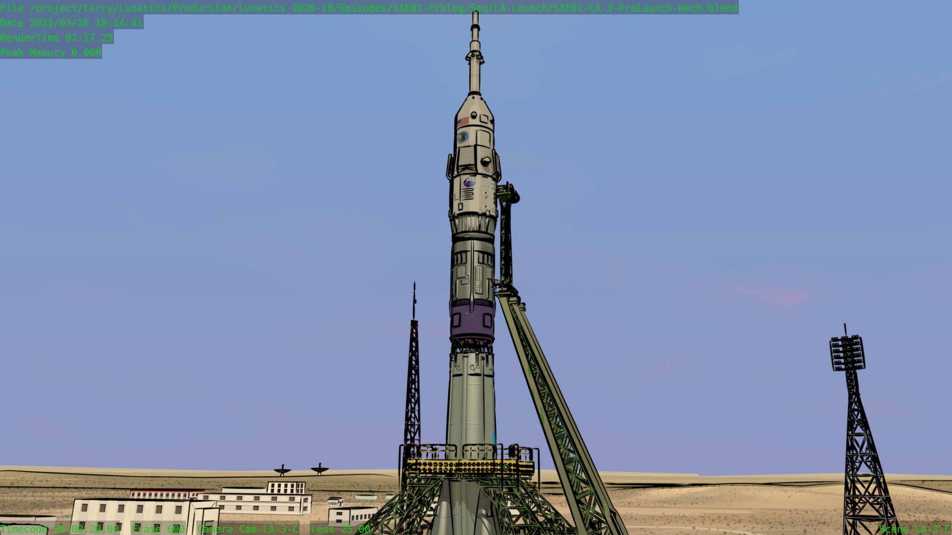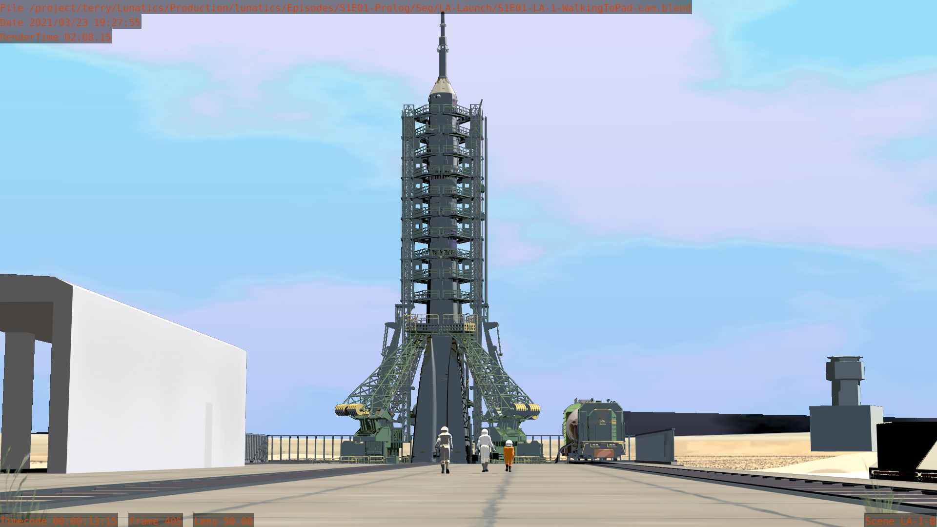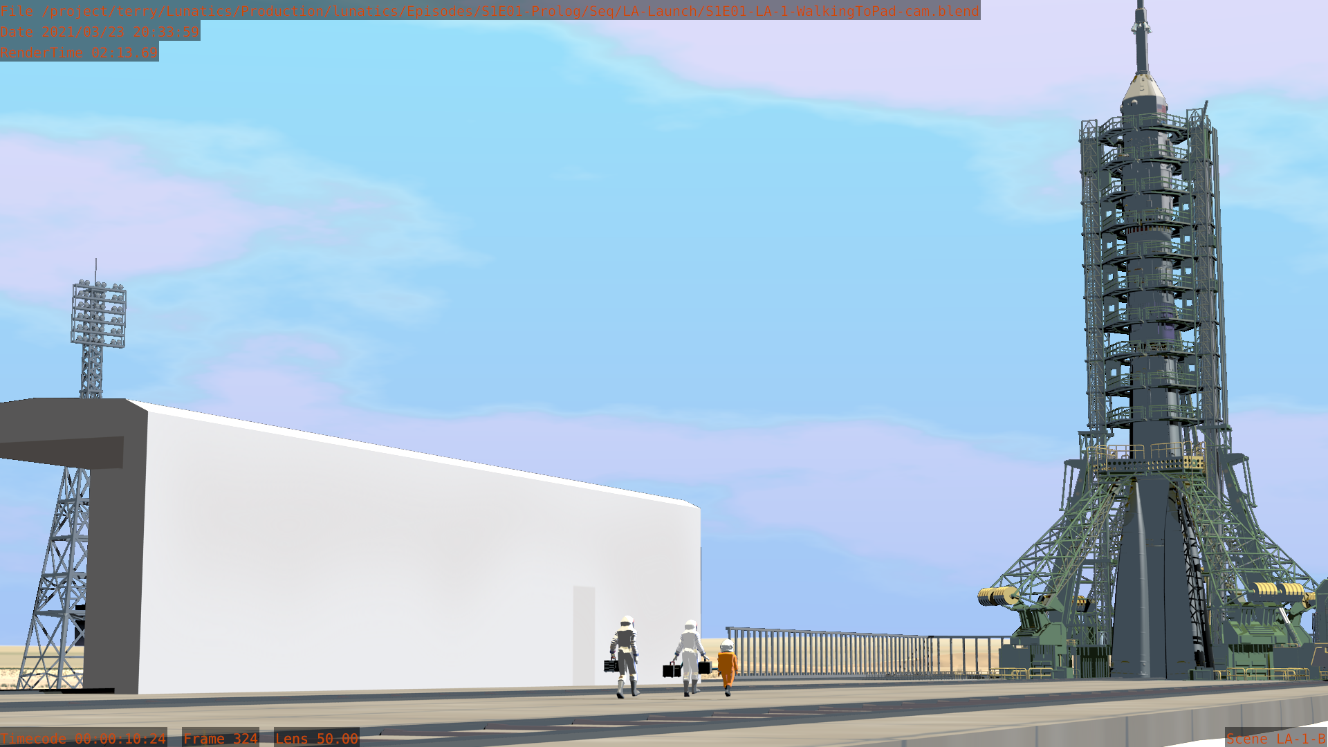 Worked on the S1E01-LA “Launch” sequence this month. It is very nearly finished now. Still a few tweaks here and there, and I haven’t added the extras yet in the shots that call for them. The Mission Control shots aren’t fully animated, and I haven’t pulled the Georgiana PoV shot in the Soyuz from the “Soyuz Flight” sequence yet.