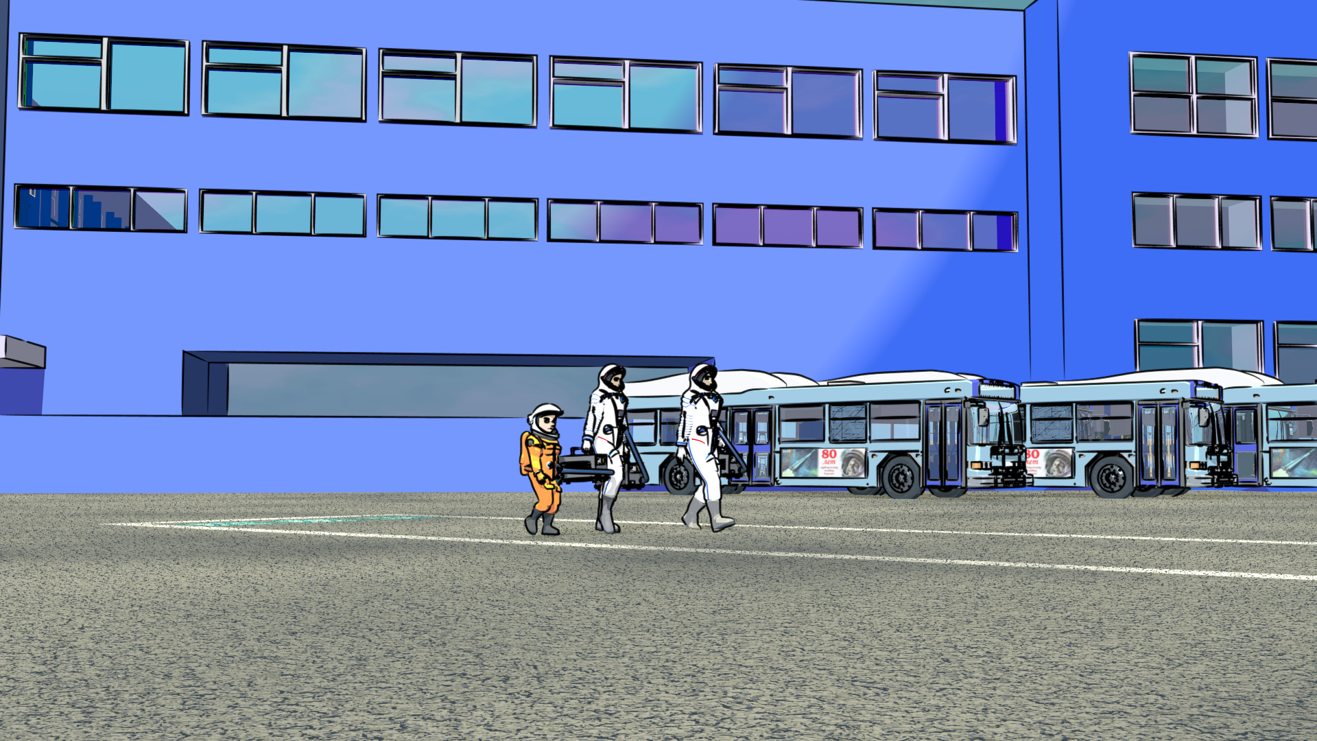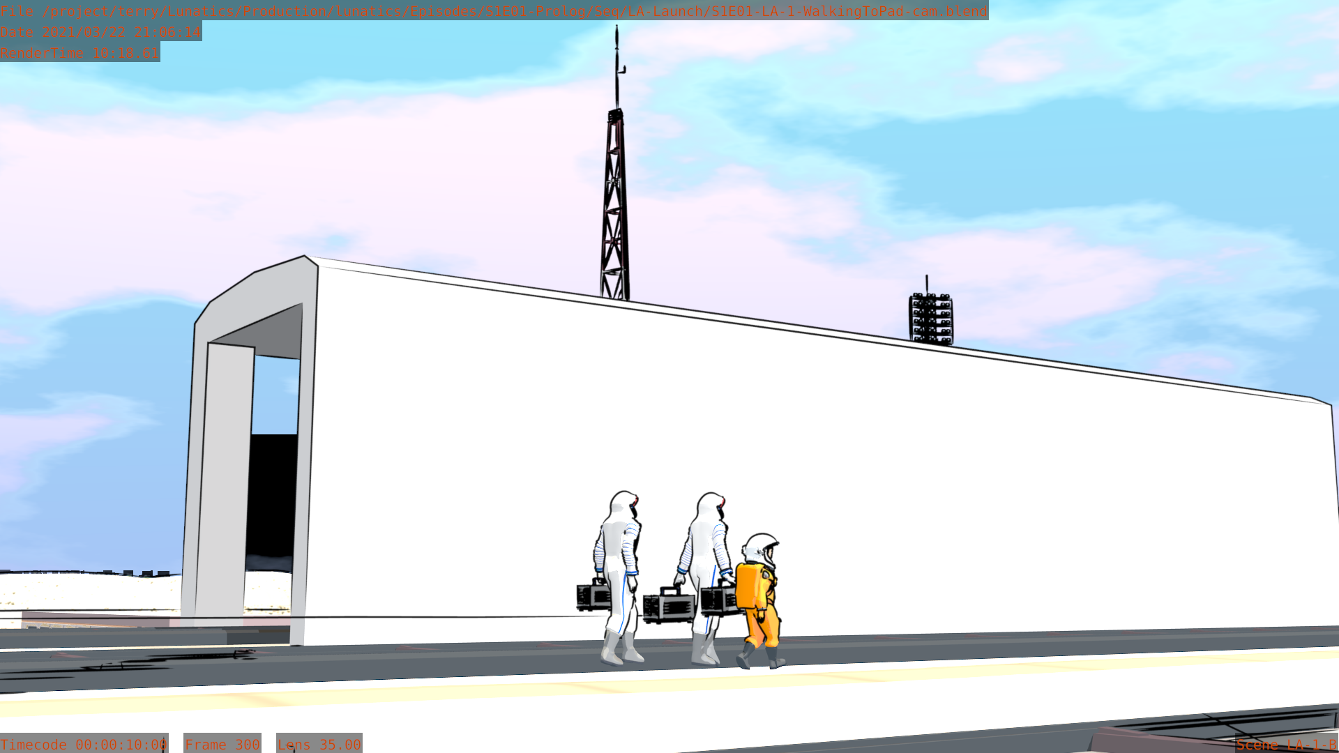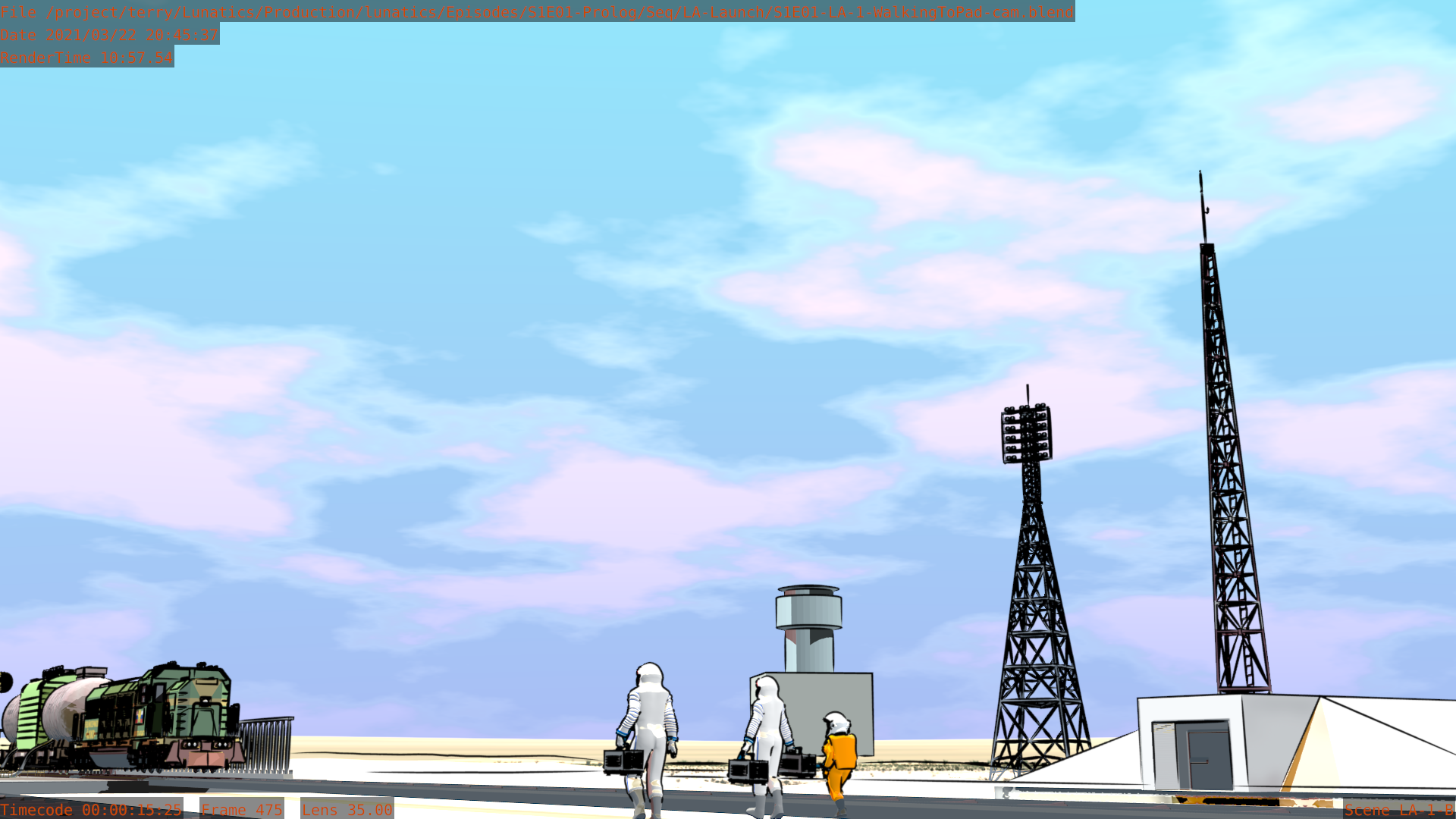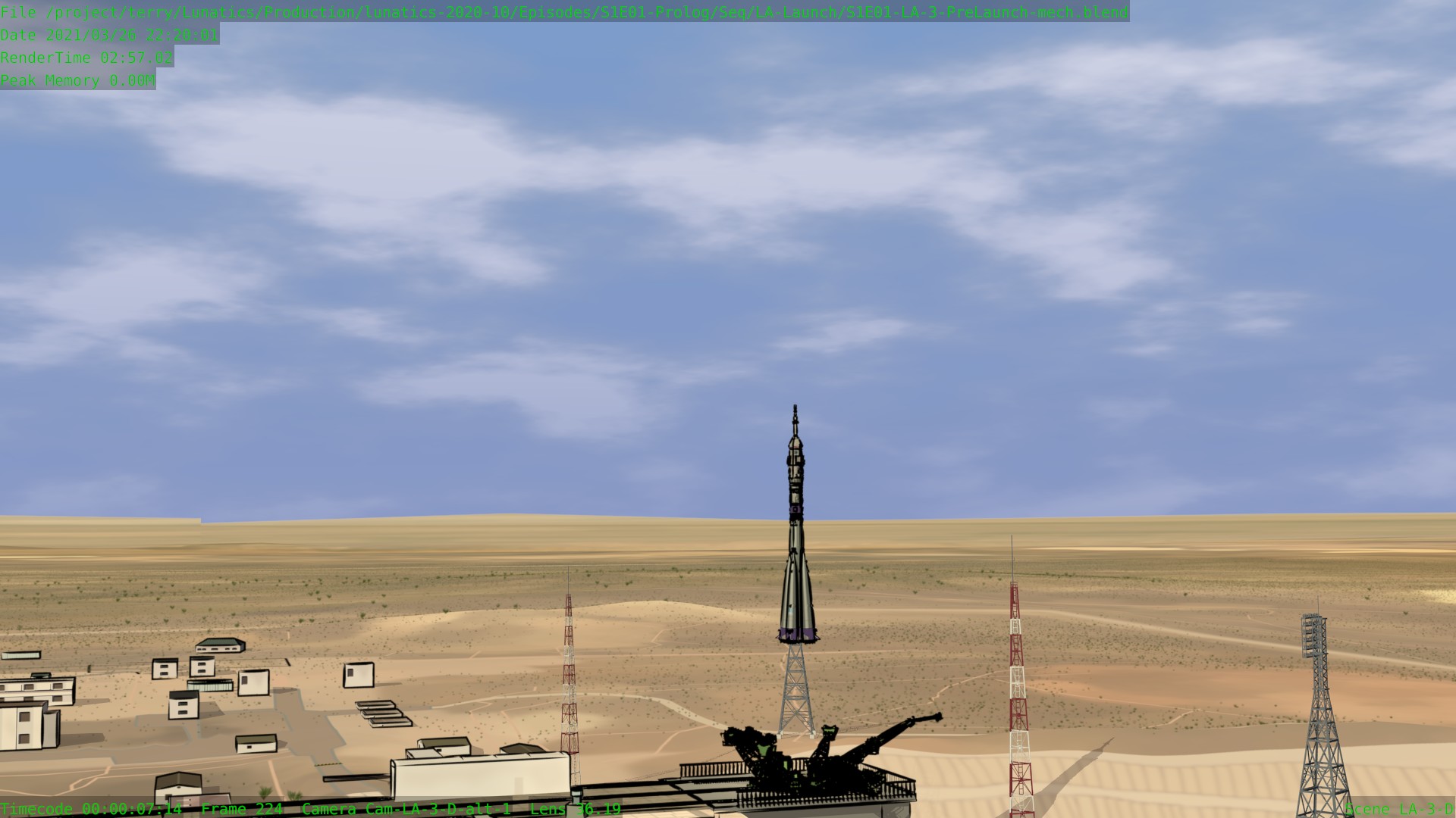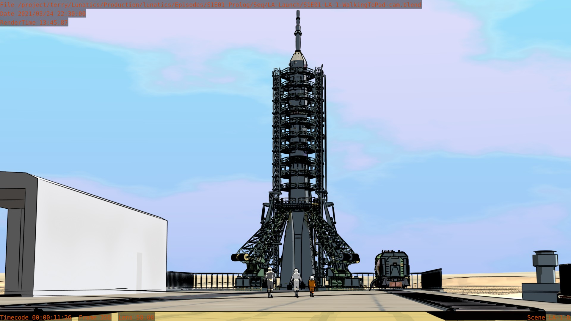 Worked on the S1E01-LA “Launch” sequence this month. It is very nearly finished now. Still a few tweaks here and there, and I haven’t added the extras yet in the shots that call for them. The Mission Control shots aren’t fully animated, and I haven’t pulled the Georgiana PoV shot in the Soyuz from the “Soyuz Flight” sequence yet.