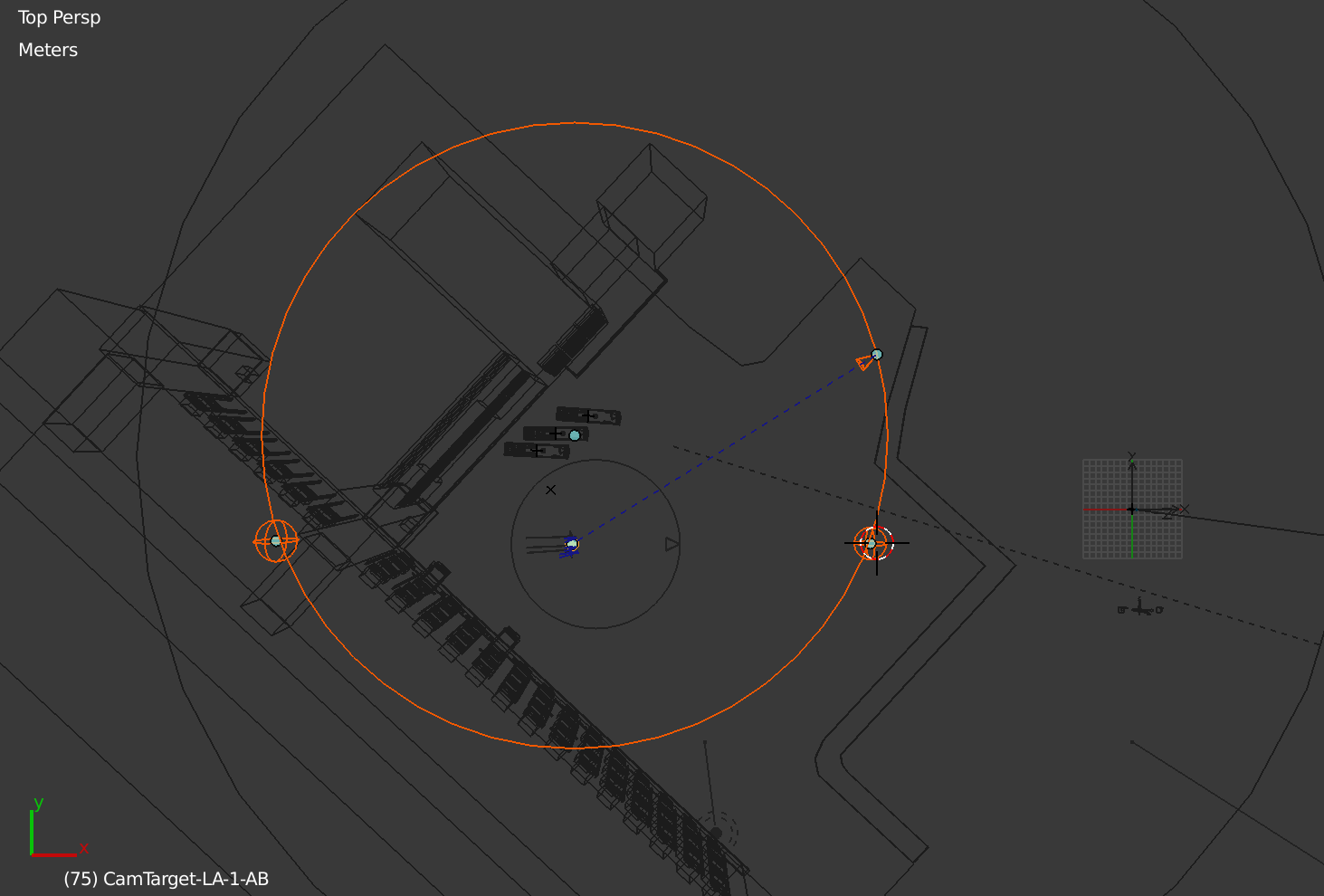 Here’s the current status of the camera path (in the LA-1-A shot, which is the integration building). I’ve used empties to mark desired points I want the camera to go through, as constraints on where the path can be.