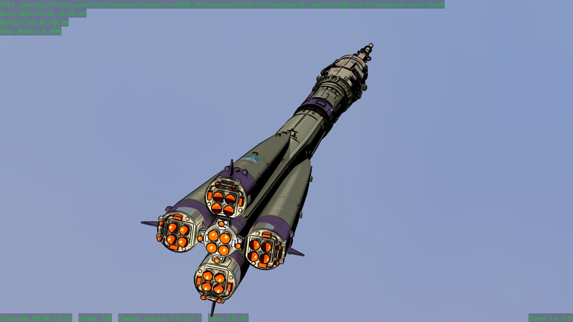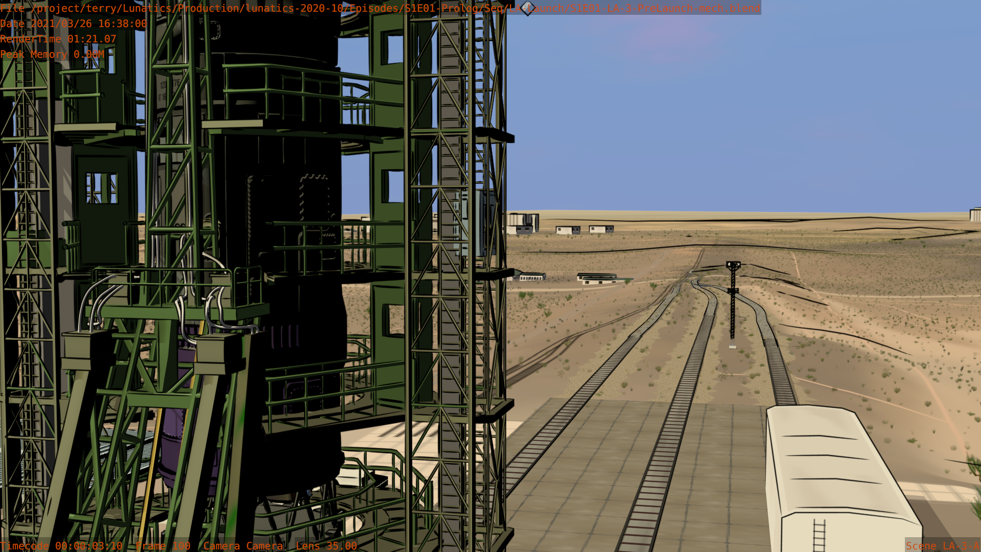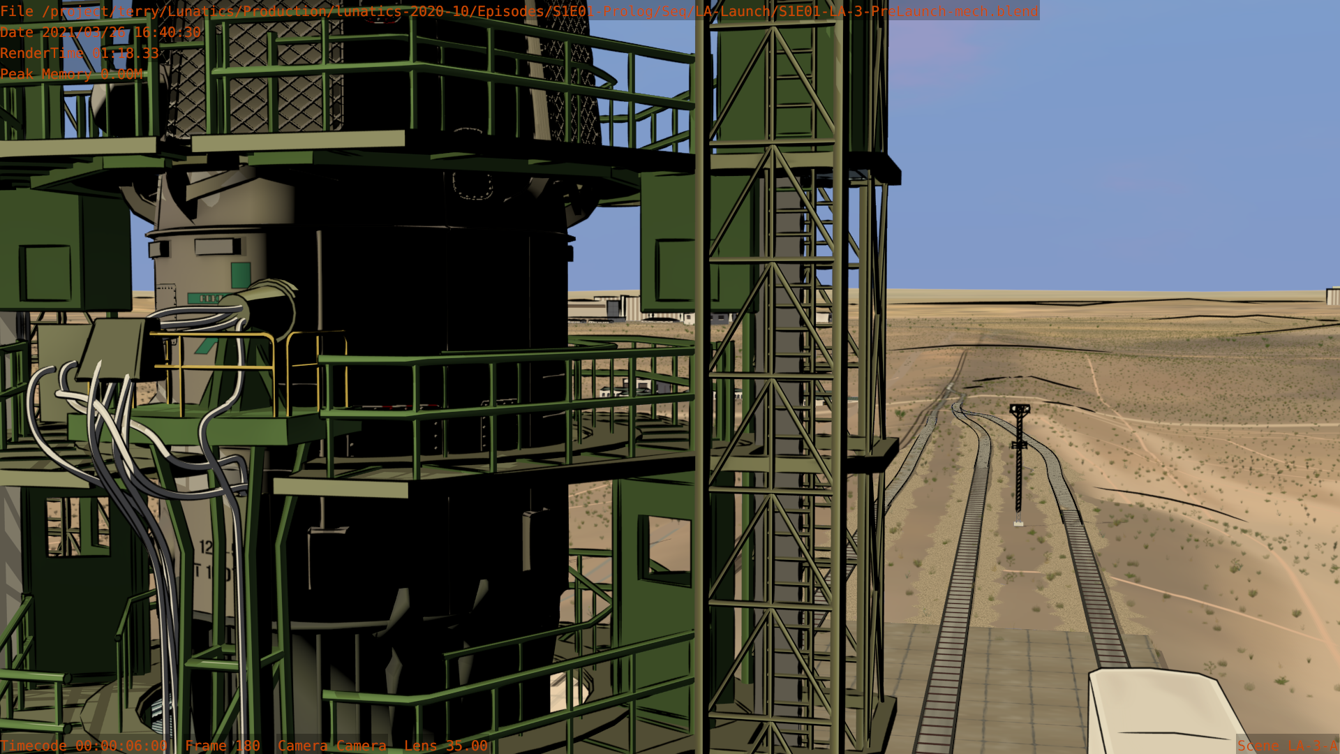 These are tests from the LA-3 (pure mech) block of the launch sequence. This week, I relinked these, incorporating the updated set and sky system. I’m also trying out some new angles that I thought might work better than my original plan.
