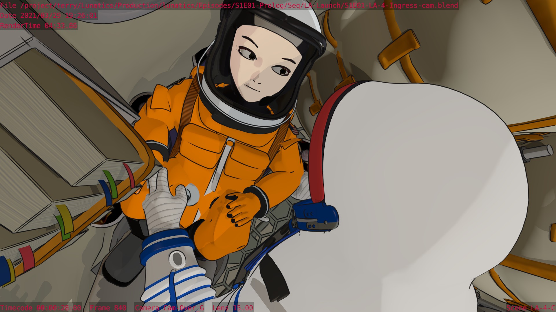 For example, a significant part of the interior character animation in the “Soyuz Flight” sequence was done for the “Teaser Trailer” back in 2012 and 2013 — BUT, the character models, set model, and rendering style have all changed substantially since then, so I need to recreate those shots with the updated assets.