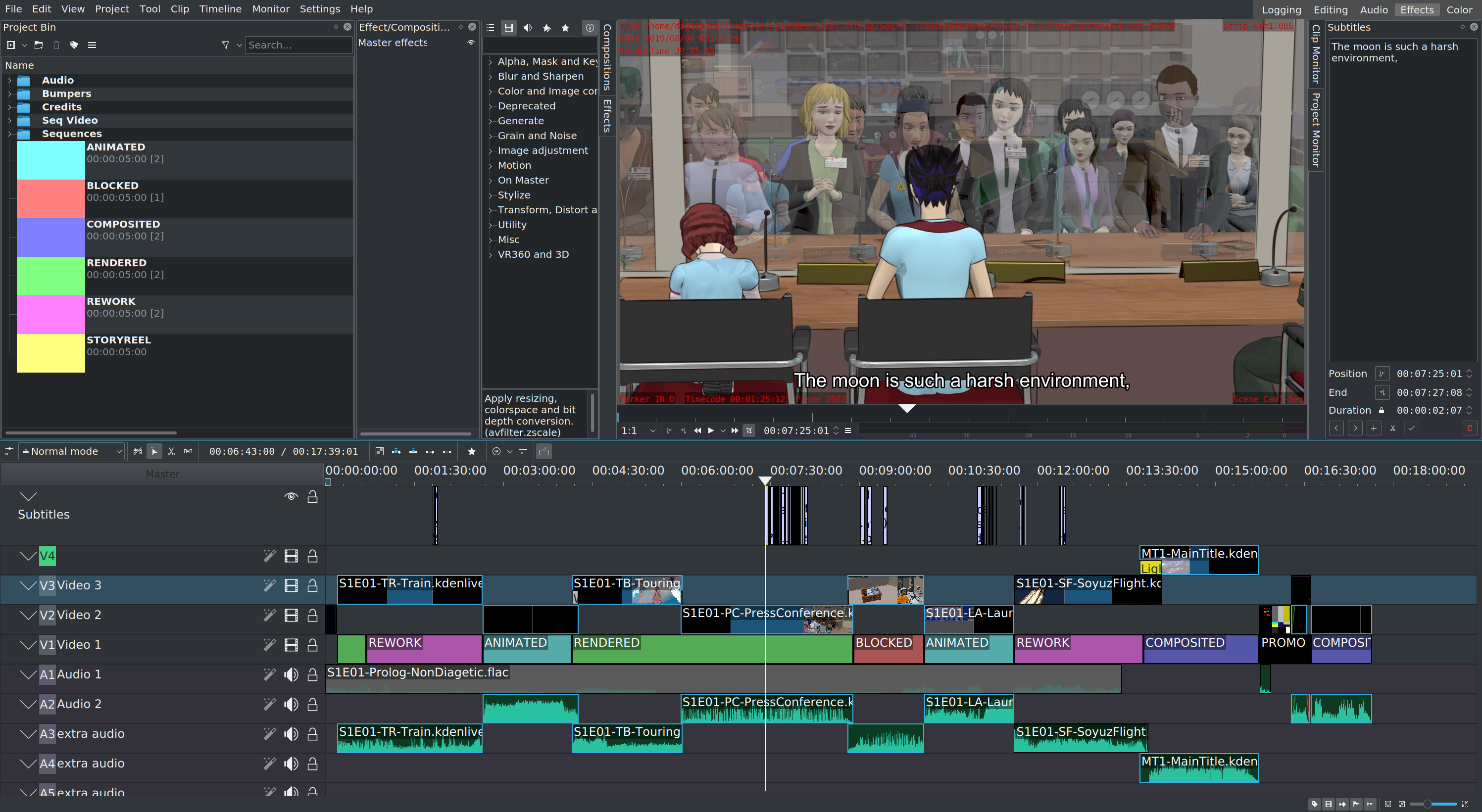 You might also notice that I’m using the brand-new “Subtitle Track” feature in Kdenlive, that was added as a 2020 Google Summer of Code project by Sashmita Raghav. This works pretty smoothly! This edit uses the “international” soundtrack, which includes some Japanese and Russian dialog, and I’ve provided subtitles for those.