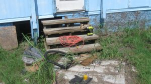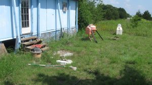 The “shop”, is much further off level — it’s like walking around in a beached boat in there. Needs leveling very badly, and massive remodeling, since the fire damaged it (and it was never really outfitted inside to begin with).
