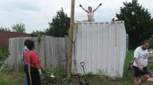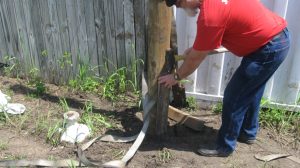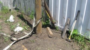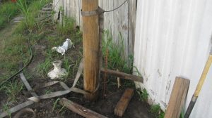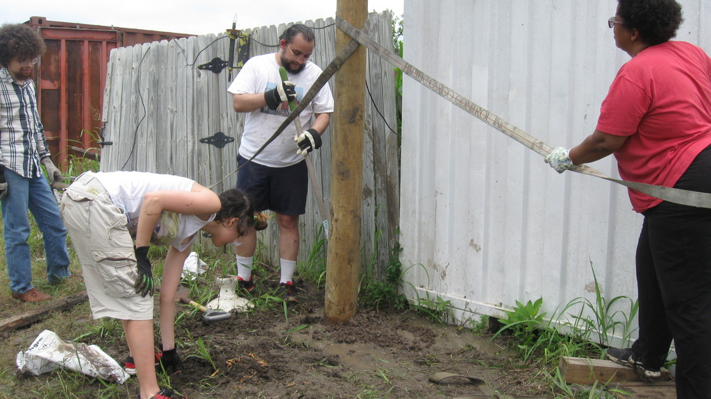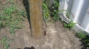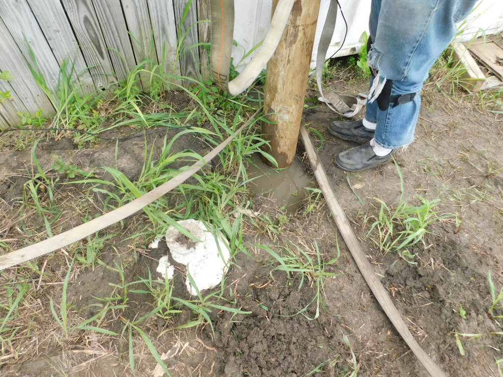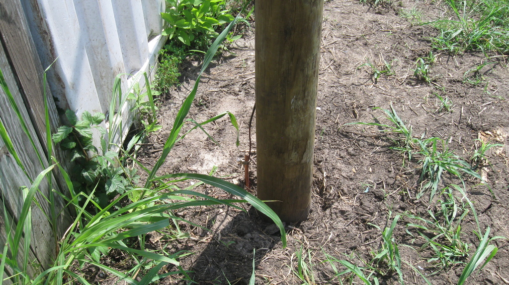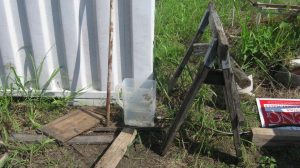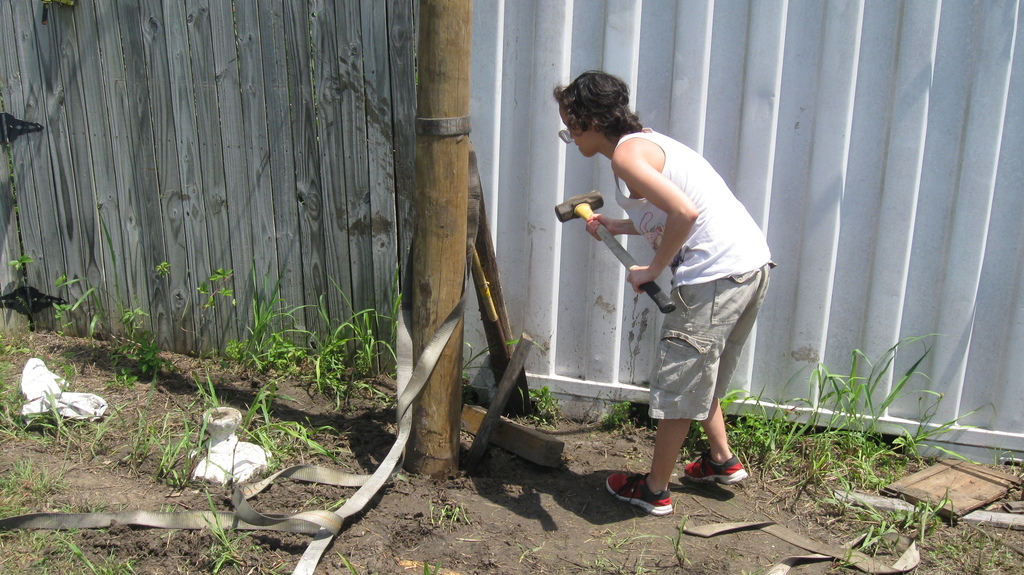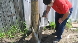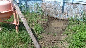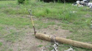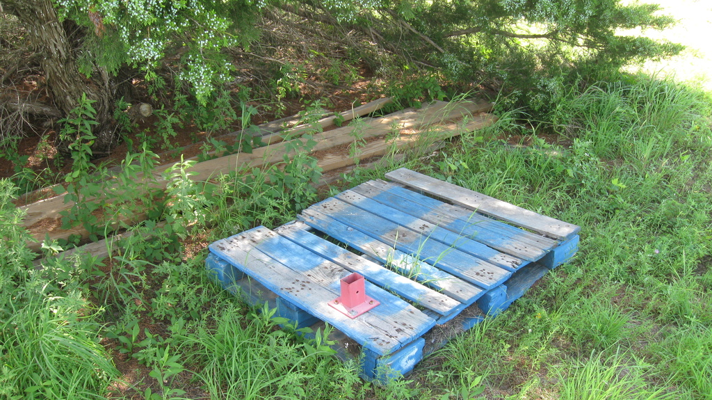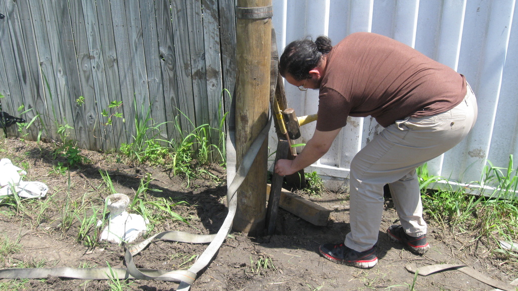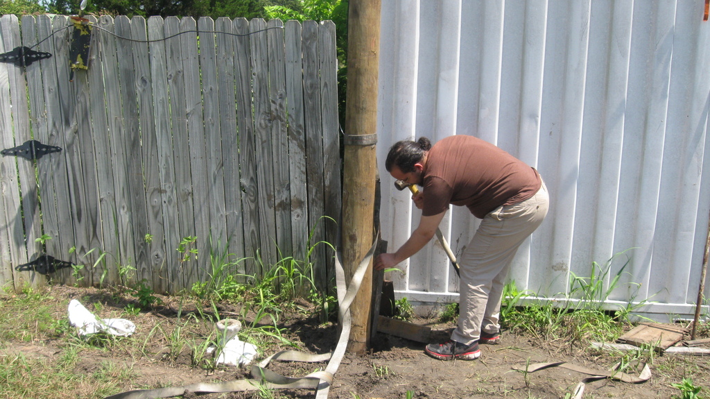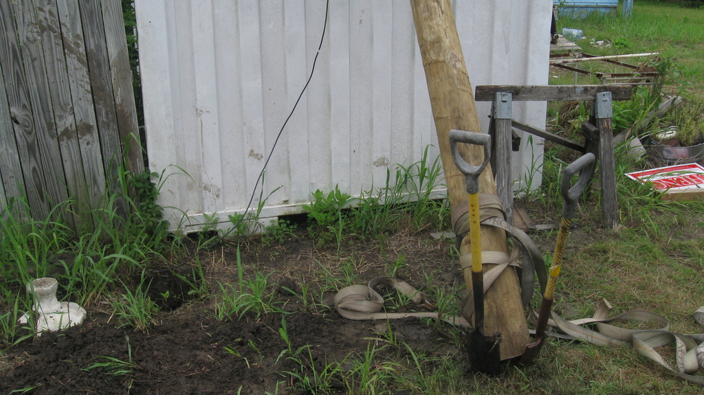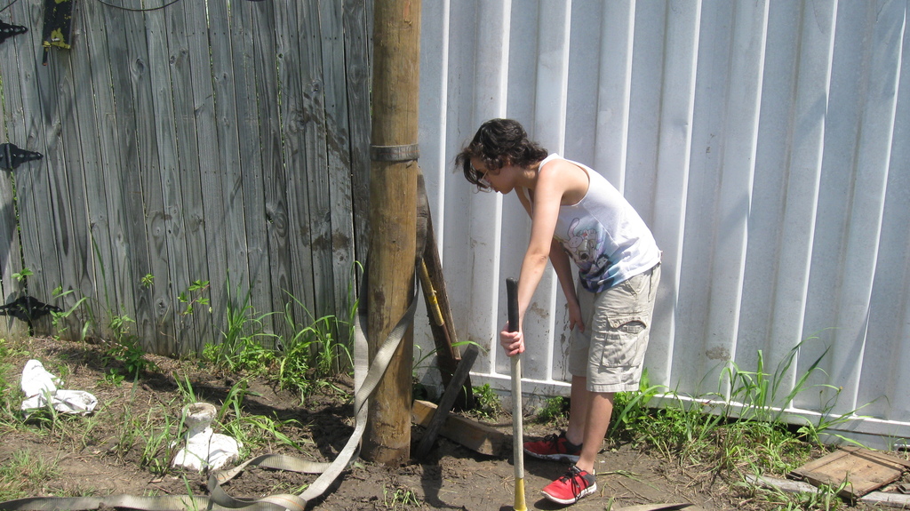We also started preparing for our first concrete project, which is to put in a pier to replace the rather-makeshift column arrangement supporting the roof on our house. You can see the buckled “knees” on the existing supports. We’re replacing the alternate ones (currently unconnected) with a new “buttress” design that should be able to take some lateral thrust.