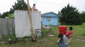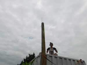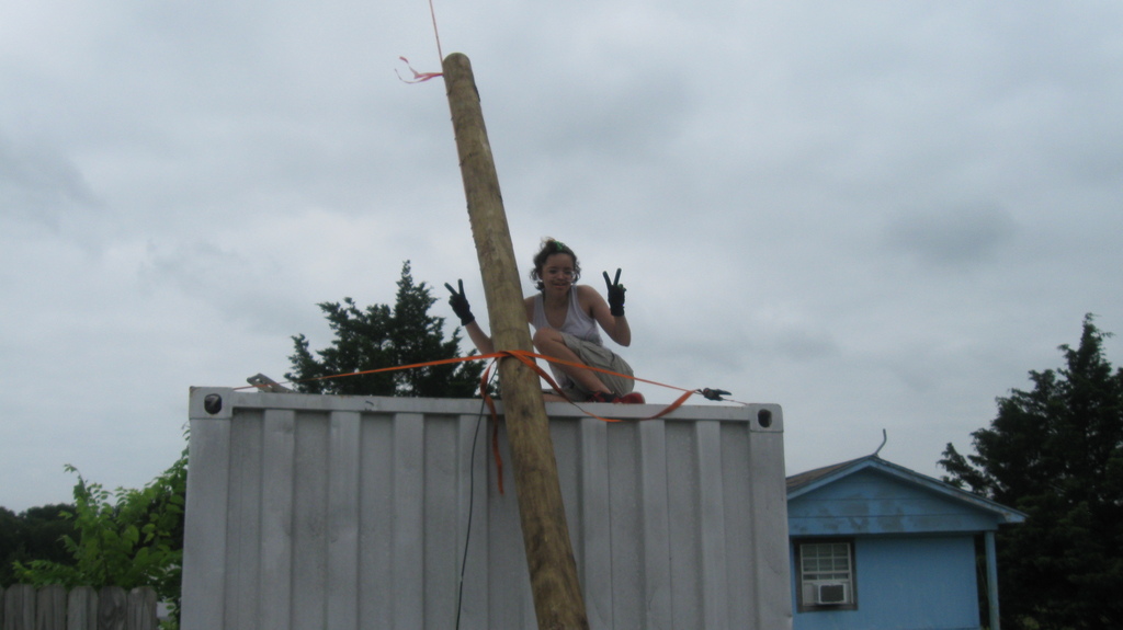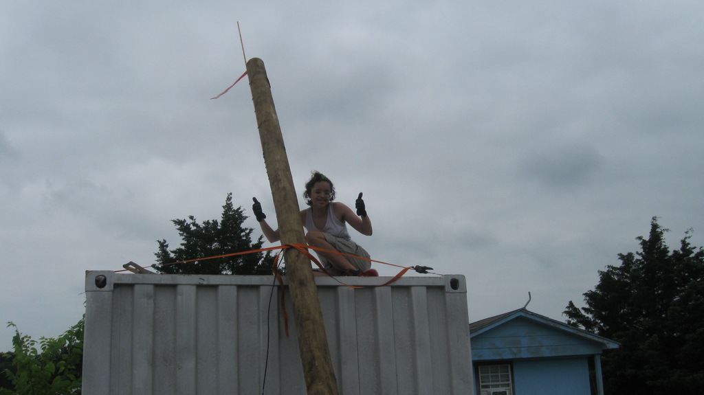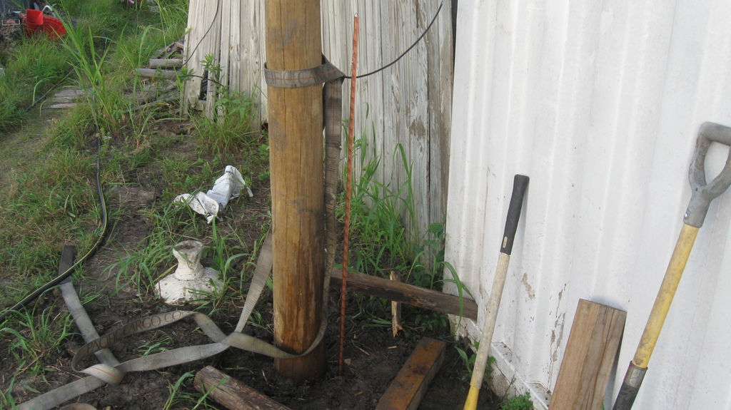 In order to get line-of-sight wireless internet for the studio, we needed a high-enough place to mount the antenna feed. We installed a utility pole adjacent to the studio/library building for this, with a lightning rod.