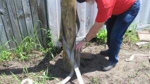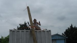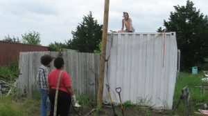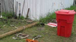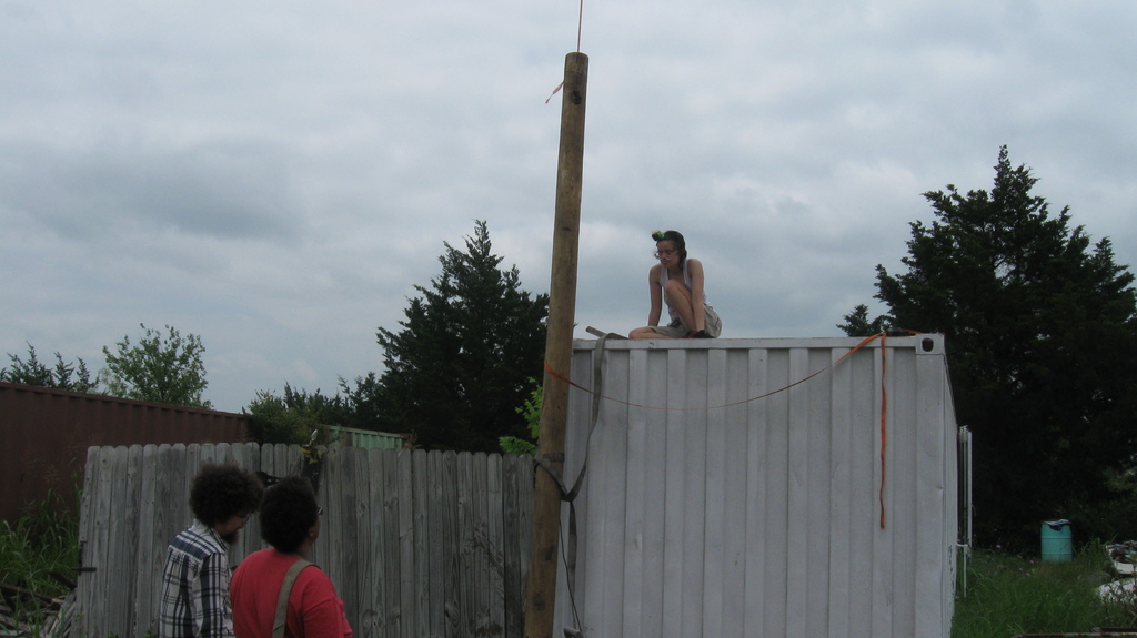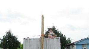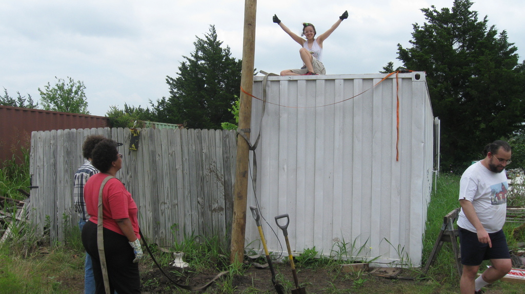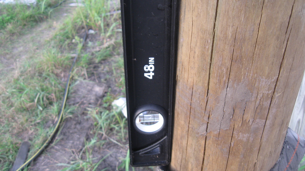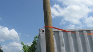 to use it to put level marks on all four corners of each of the storage containers for the library/shop complex. This a step towards leveling the units. I also ordered railroad ties which we’ll need for supporting the units during leveling.