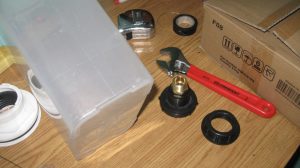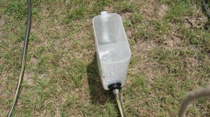 Water levels are an ancient technology for getting true level on large structures. The pyramids were probably leveled this way, by digging trenches and filling them with water — it gives a very good true level. With a 150-ft garden hose, this level can be used for pretty large structures. I think I spent less than $50 on parts (the bulkhead fittings are about $15 each, plus M/F hose adapters for each, then there’s the hose itself and the cereal containers, but I already had those).