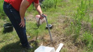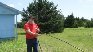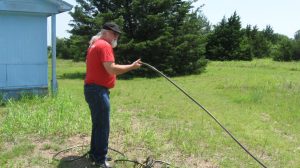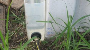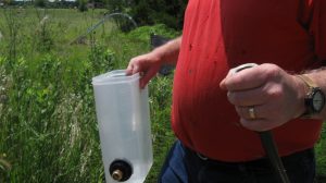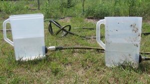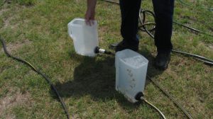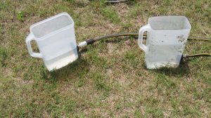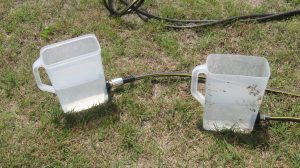 Constructed a water level using some garden hose hardware and two large plastic containers. The containers are connected by a regular garden hose, which allows for a very long baseline. I was then able